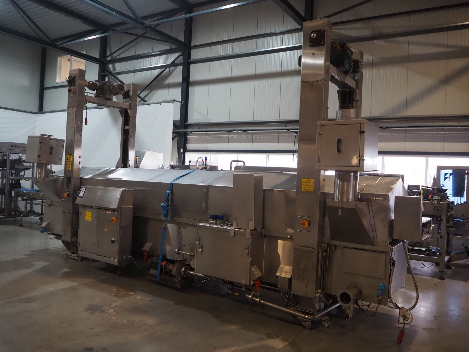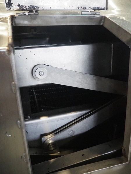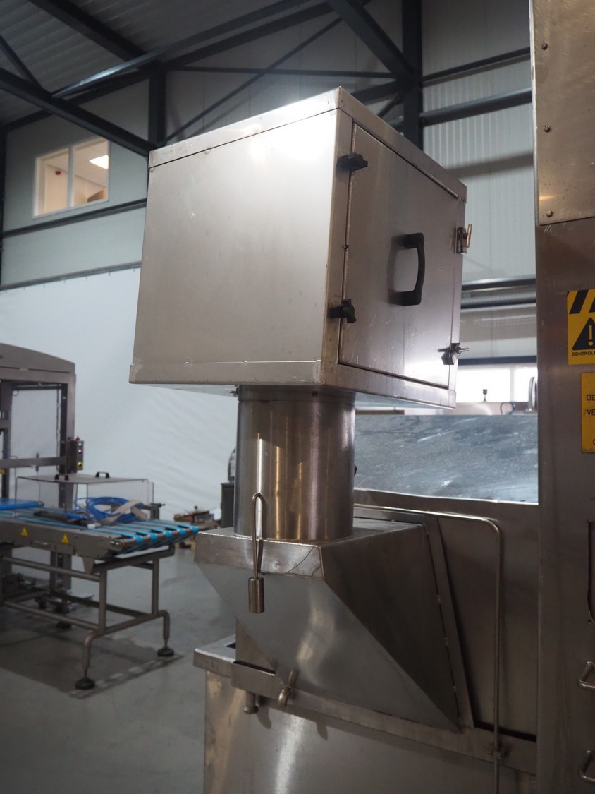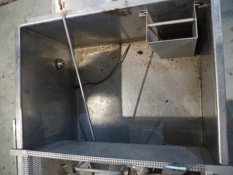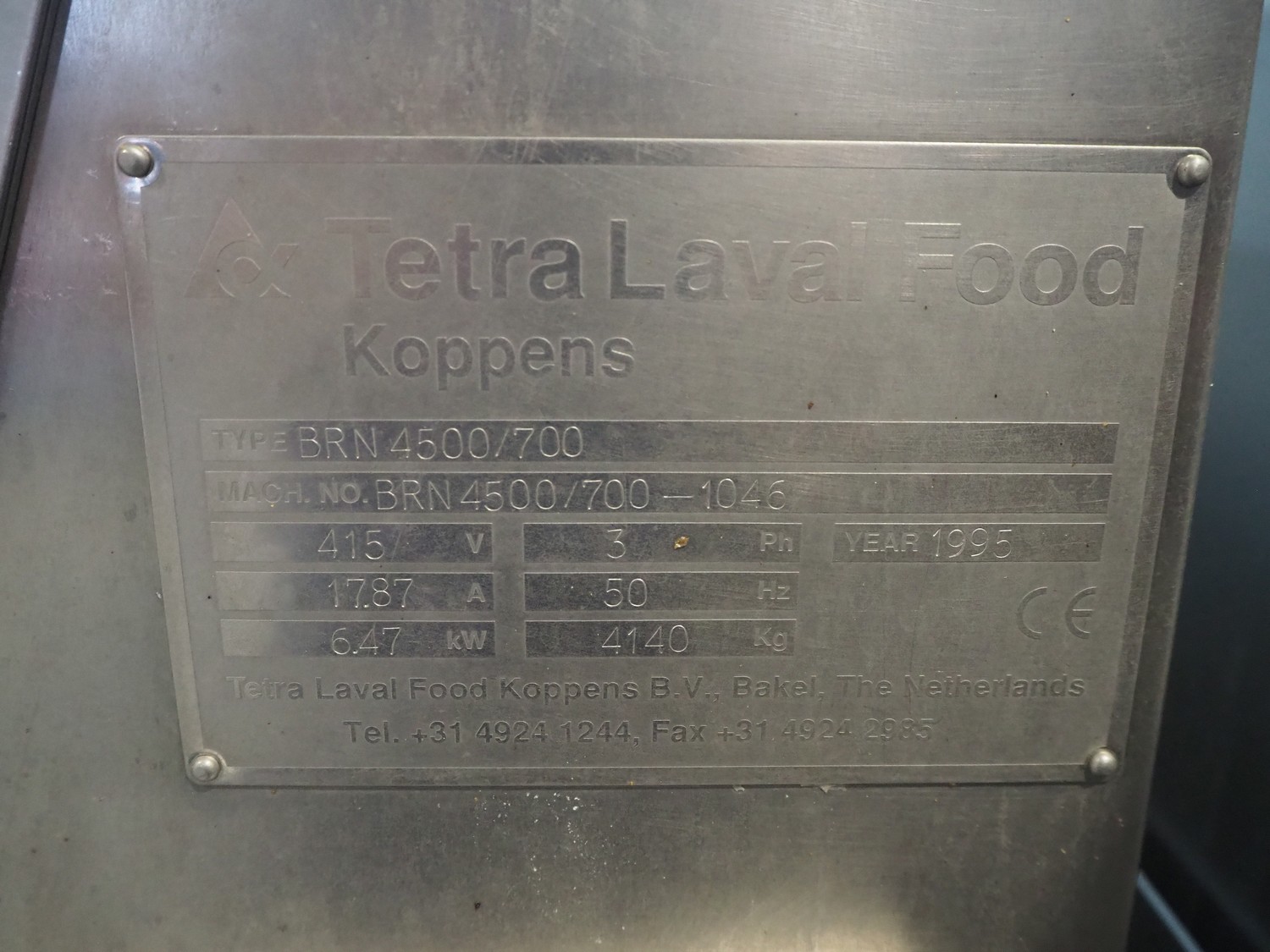 Tetra Laval Food belt fryer, type: BRN 4500/700, machine number: BRN4500/700-1046, year of construction: 1995, 415 V, 3 Ph, 50 Hz, 17.87 A, 6.47 kW, weight: 4140 kg, s/s belt, belt width: 700 mm, total dimensions: 8300 mm x 2000 mm x 3450 mm. Including s/s mobile filter tub, dimensions: 1300 mm x 750 mm x 500 mm. Without rollies.