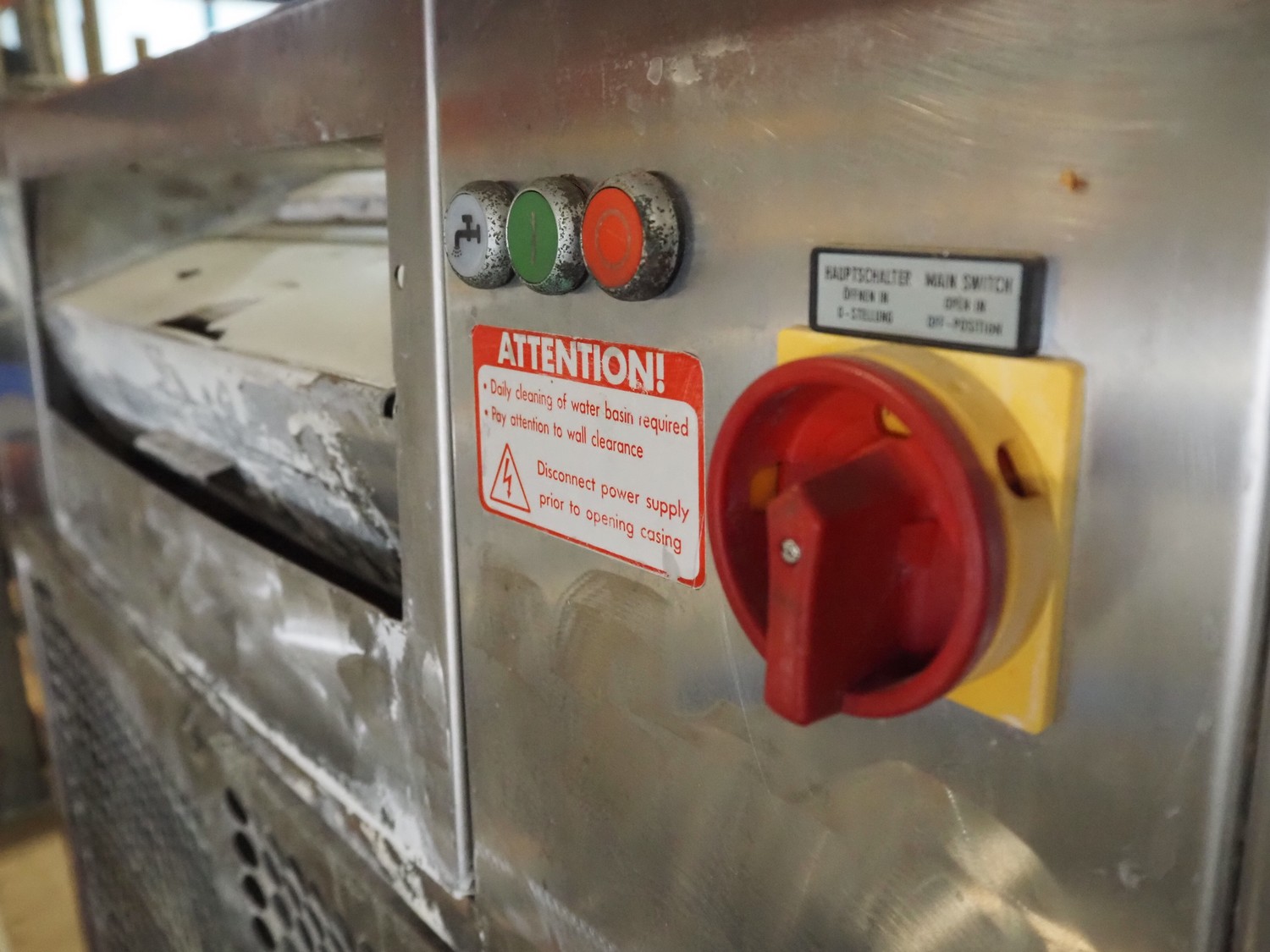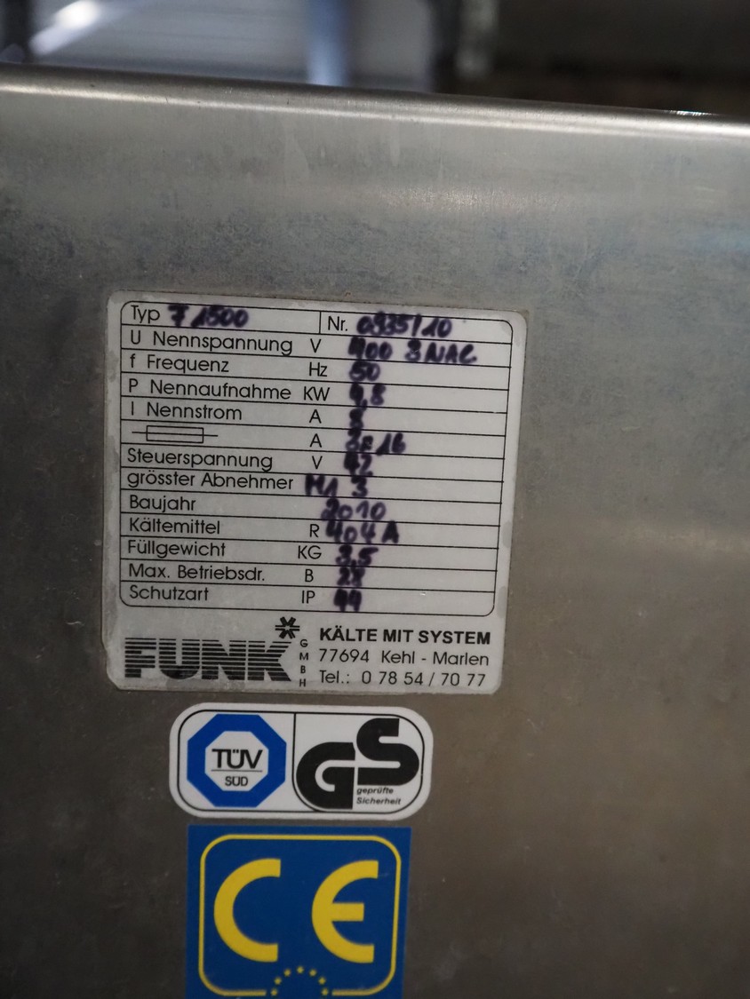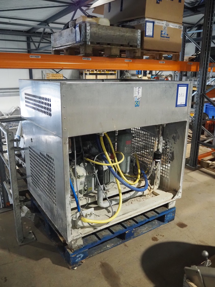 Funk flake ice machine, working width: 560 mm, Bizerba cooling and condensing unit, compressor type: 4EC-4.2Y-40S, serial number: 1678814521, 22.7/27.4 m³ per hour, dimensions: 1250 mm x 1000 mm x 1270 mm.