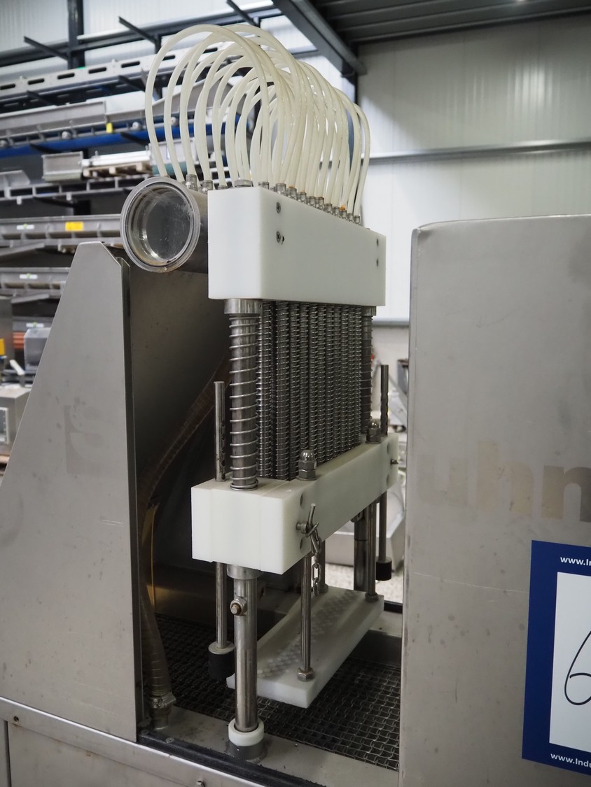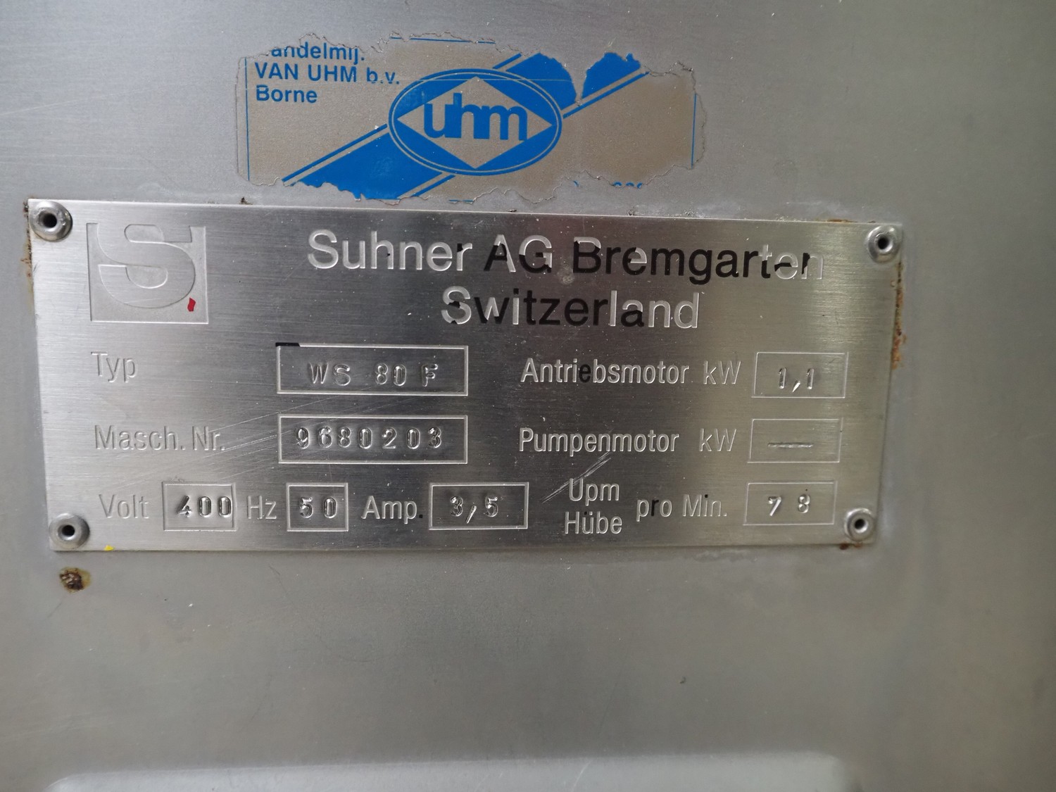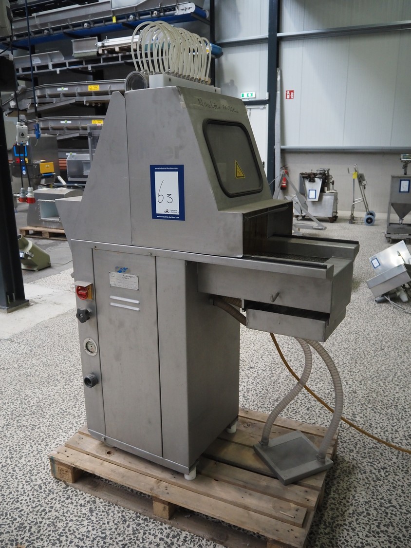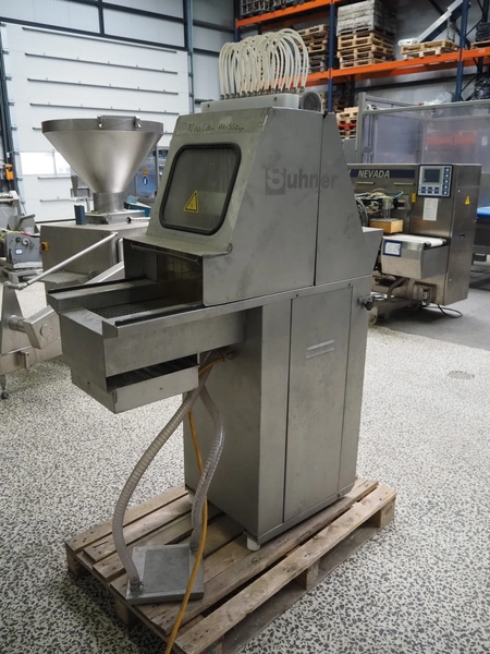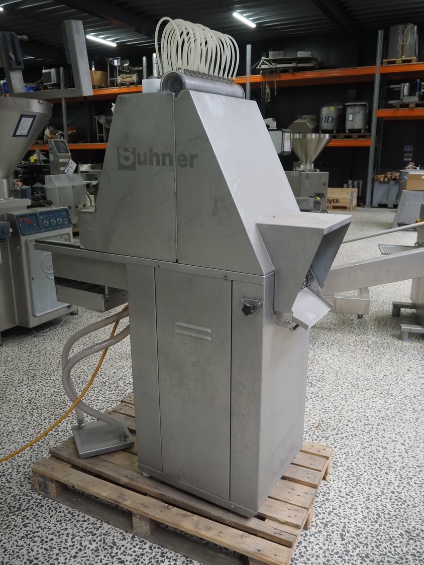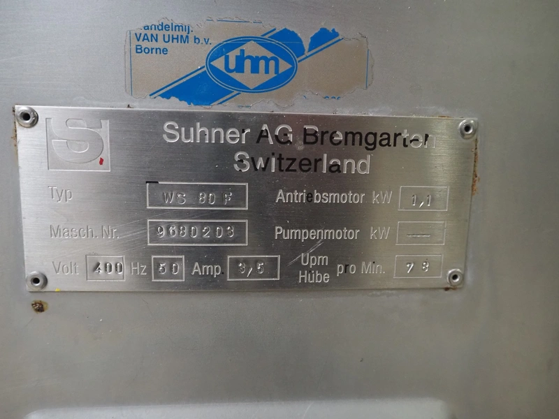 Suhner AG injector, type: WS 80 F, number: 9680203, 400 V, 50 Hz, 3.5 A, 1.1 kW, 80 needles, s/s mesh belt, belt width: 285 mm, total dimensions: 1300 mm x 500 mm x 1820 mm. Missing needles.