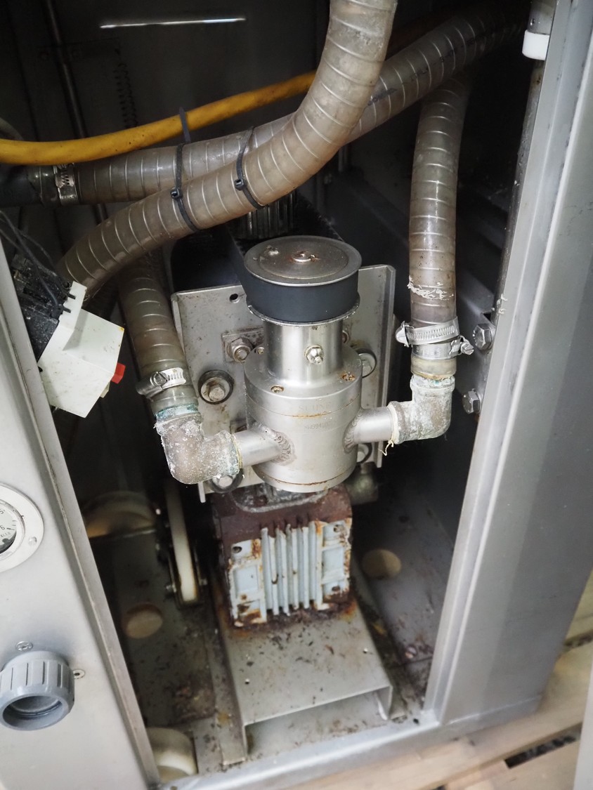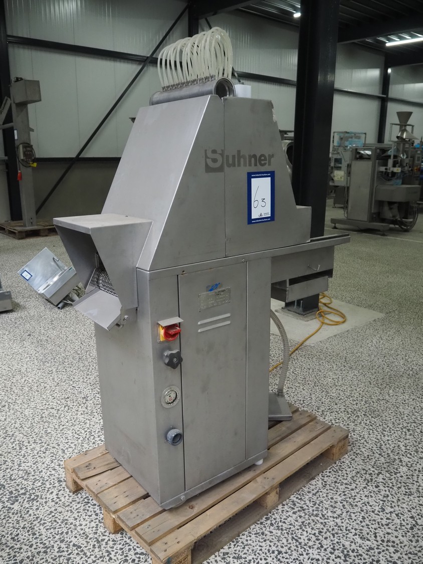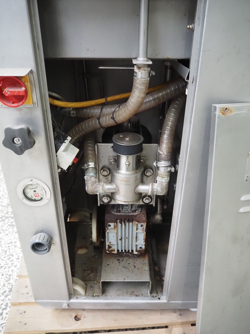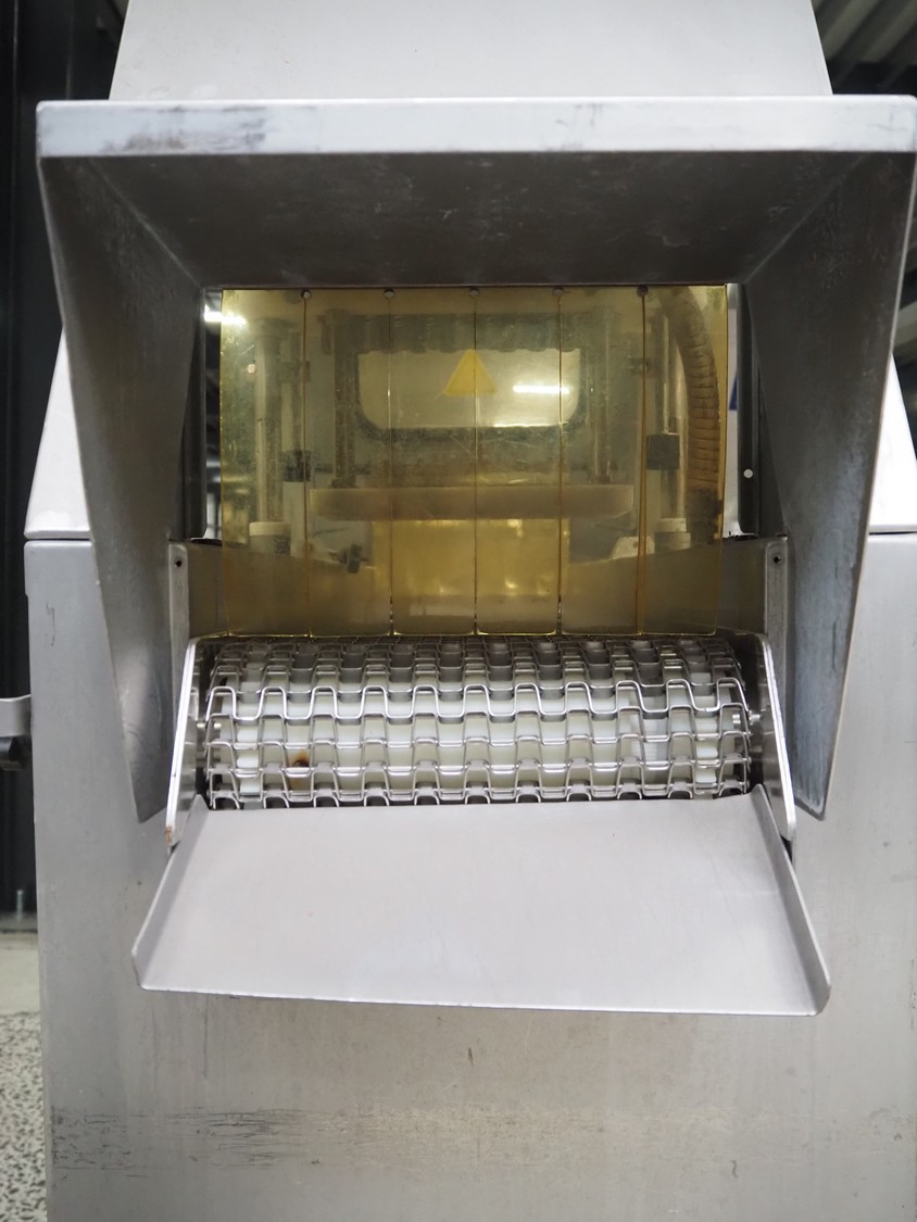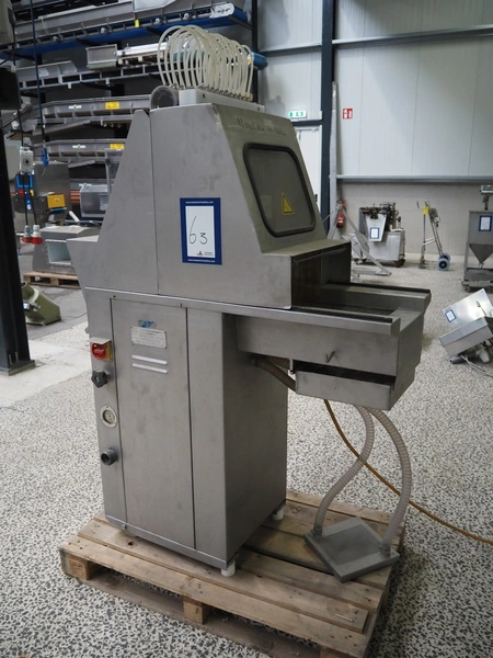 Suhner AG injector, type: WS 80 F, number: 9680203, 400 V, 50 Hz, 3.5 A, 1.1 kW, 80 needles, s/s mesh belt, belt width: 285 mm, total dimensions: 1300 mm x 500 mm x 1820 mm. Missing needles.