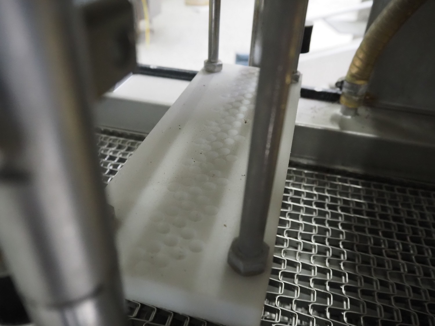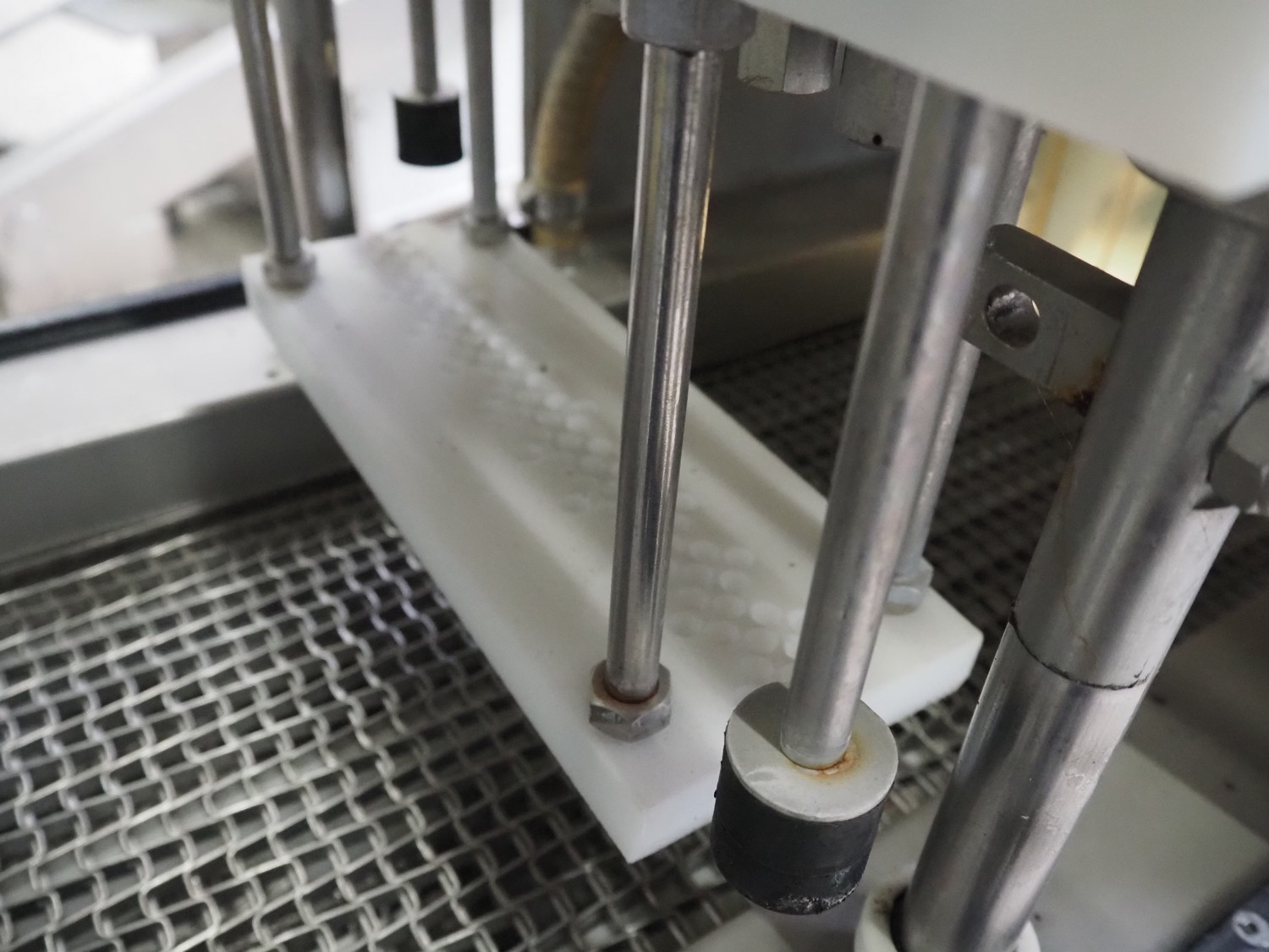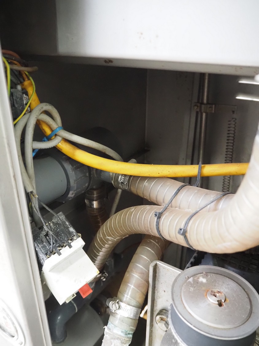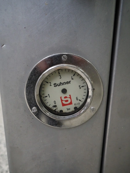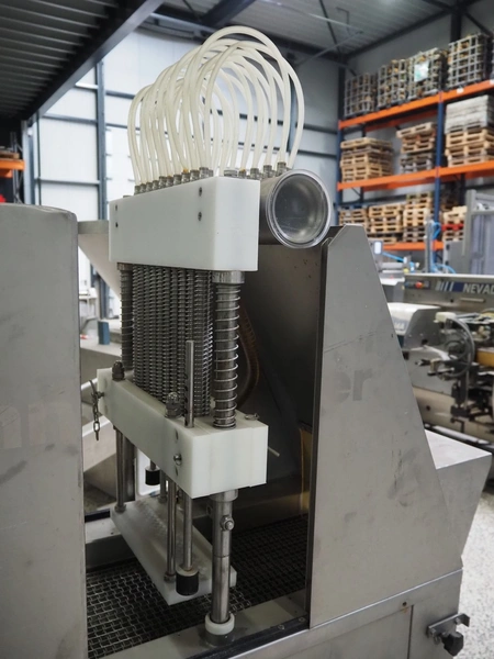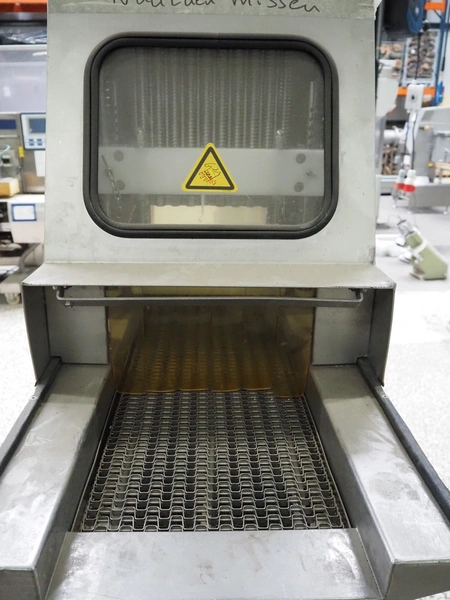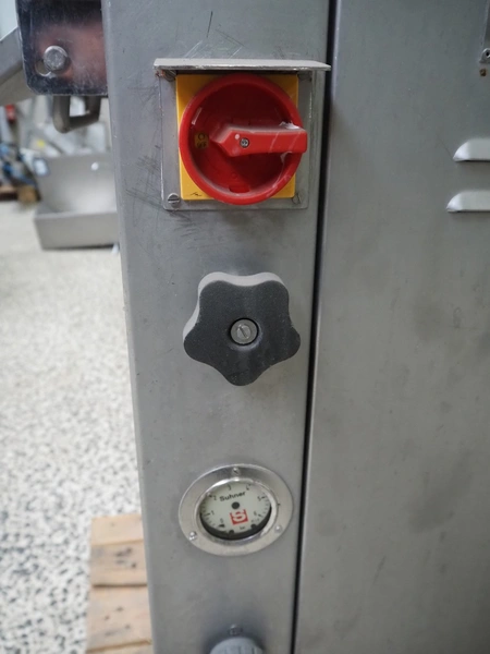 Suhner AG injector, type: WS 80 F, number: 9680203, 400 V, 50 Hz, 3.5 A, 1.1 kW, 80 needles, s/s mesh belt, belt width: 285 mm, total dimensions: 1300 mm x 500 mm x 1820 mm. Missing needles.