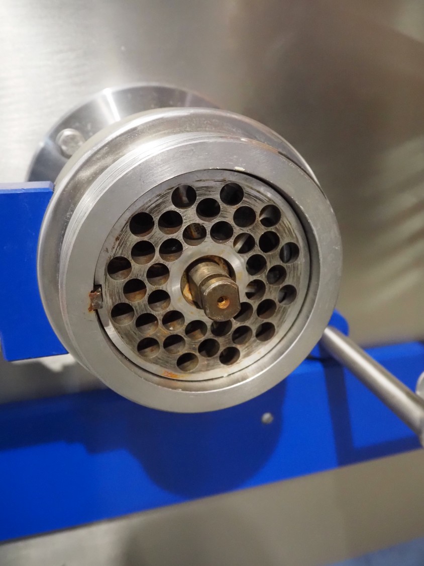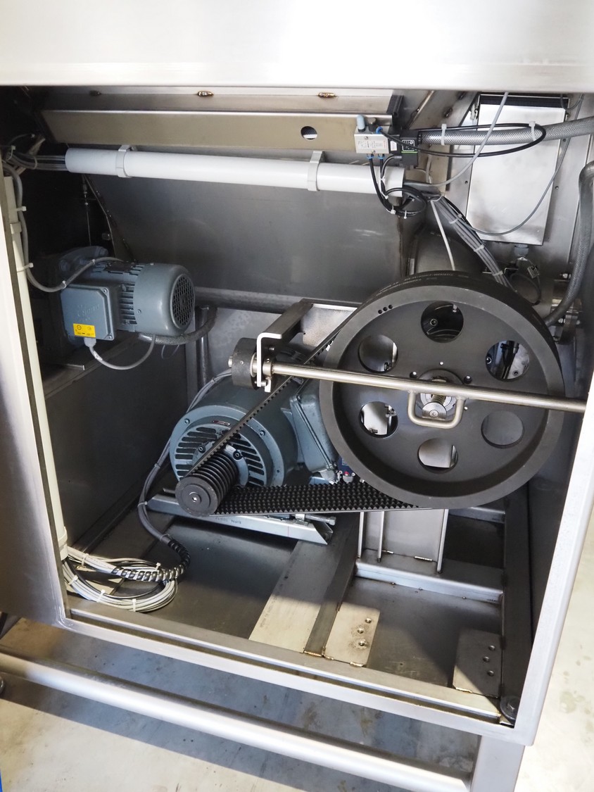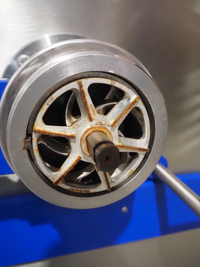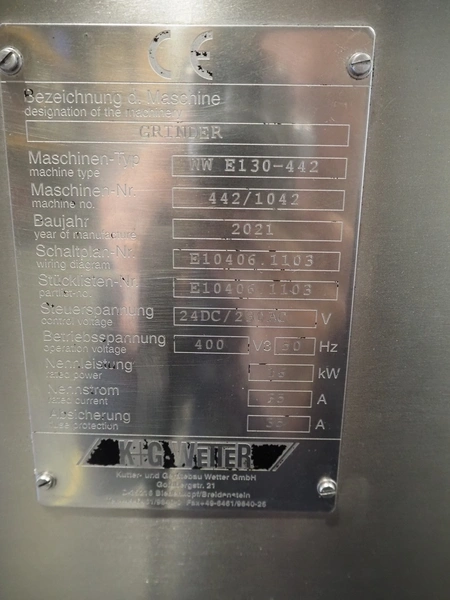 K+G Wetter grinder, type: WW E130-442, number: 442/1042, year of construction: 2021, 230 V, 50 Hz, 35 A, 16 kW, diameter plate: 130 mm, total dimensions: 1400 mm x 1400 mm x 1850 mm. Including crate with parts.