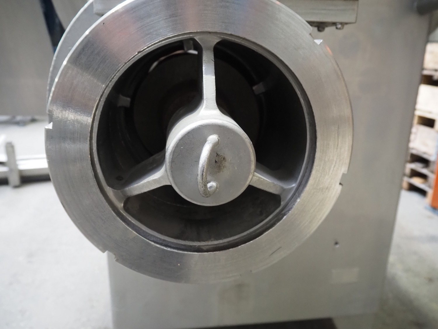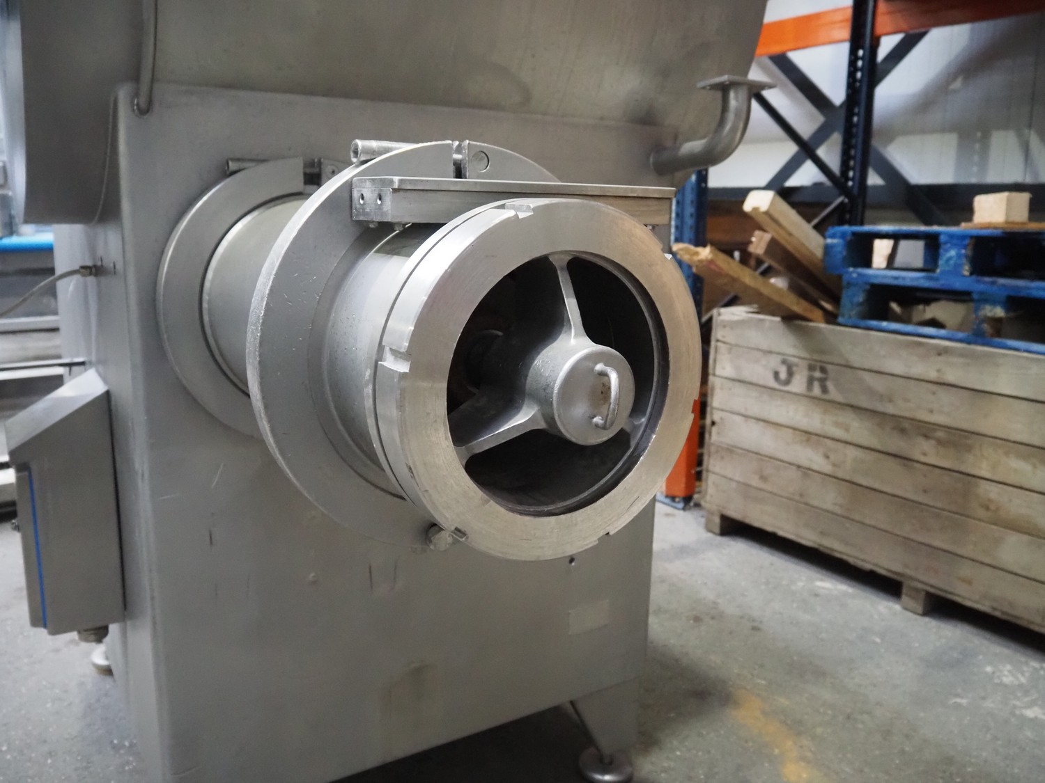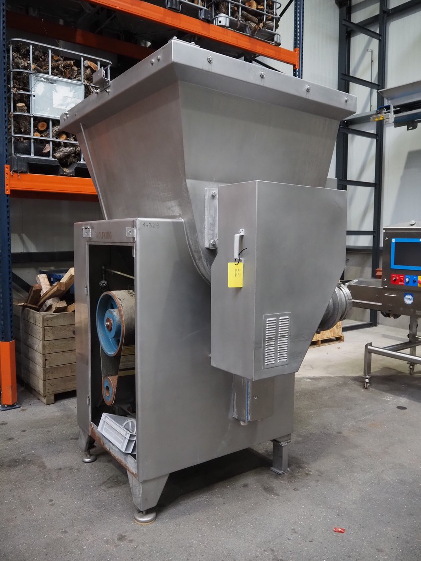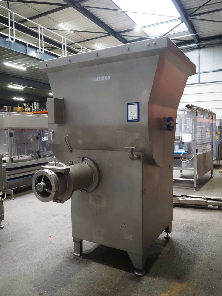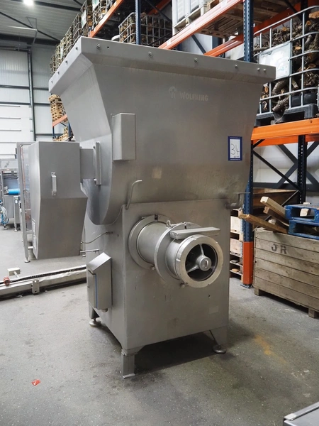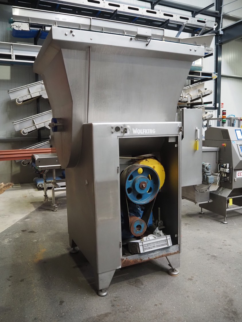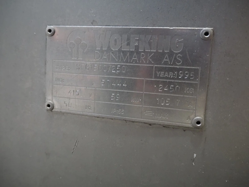 Wolfking mixer-grinder, type: SFG 1500/250, number: 57444, year of construction: 1995, 415 V, 50 Hz, 59 kW, 105.7 A, weight: 2450 kg, plate diameter: 250 mm, total dimensions: 3300 mm x 1800 mm x 2750 mm. Incomplete, without plates and knives.