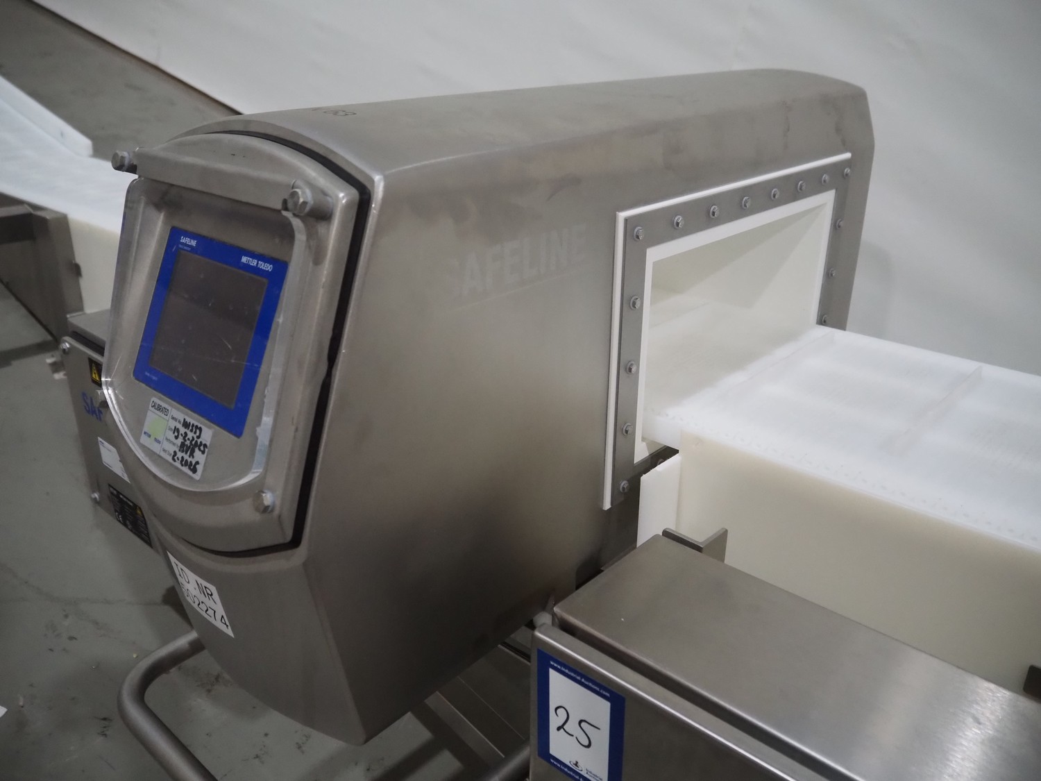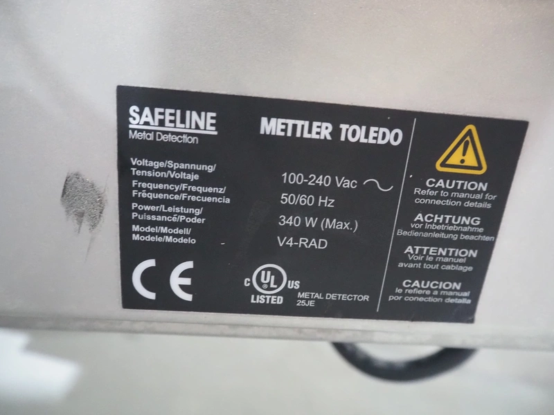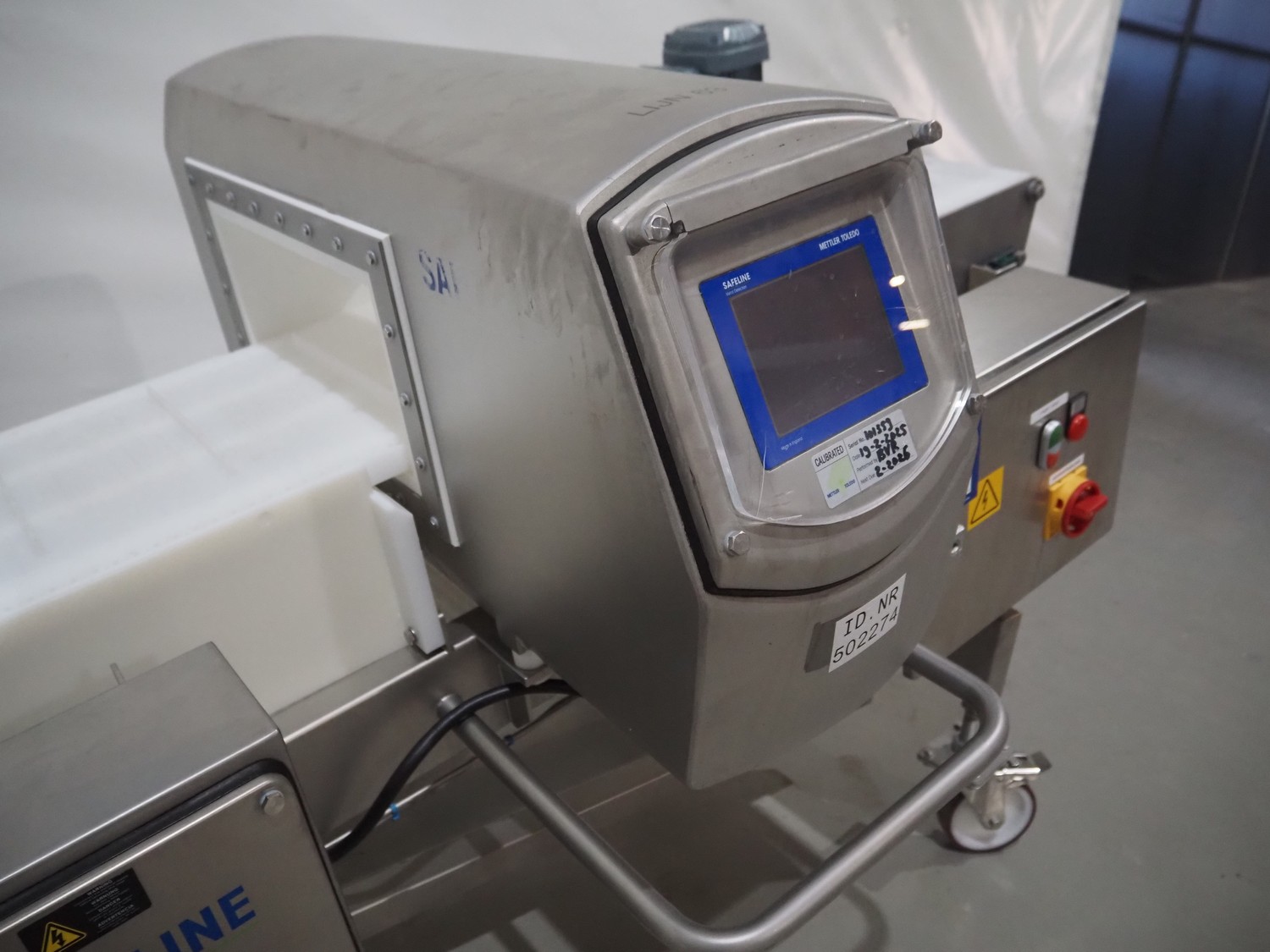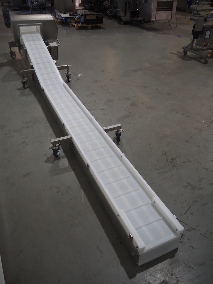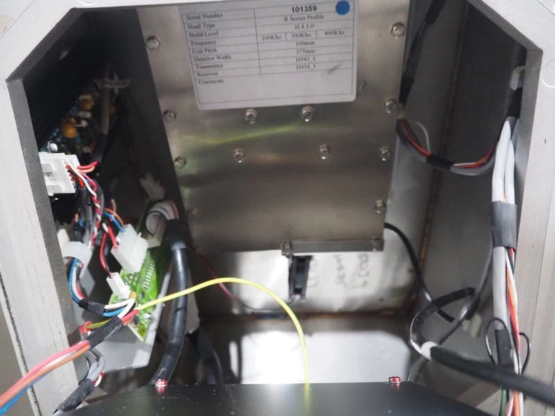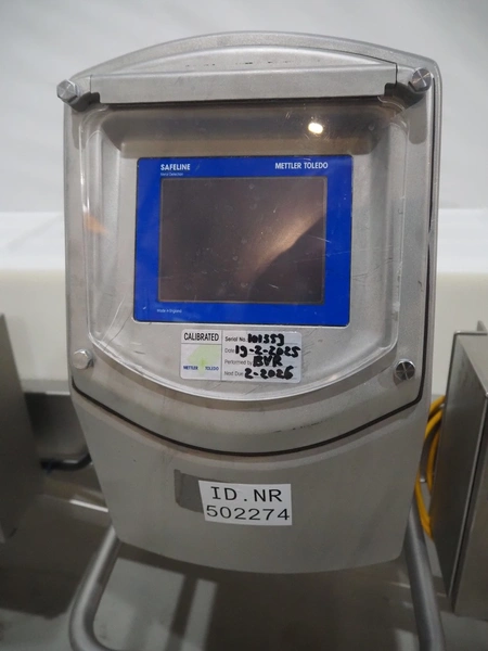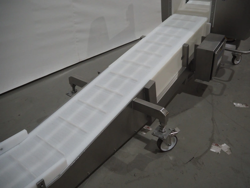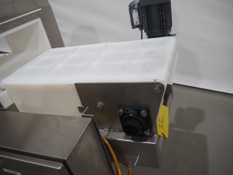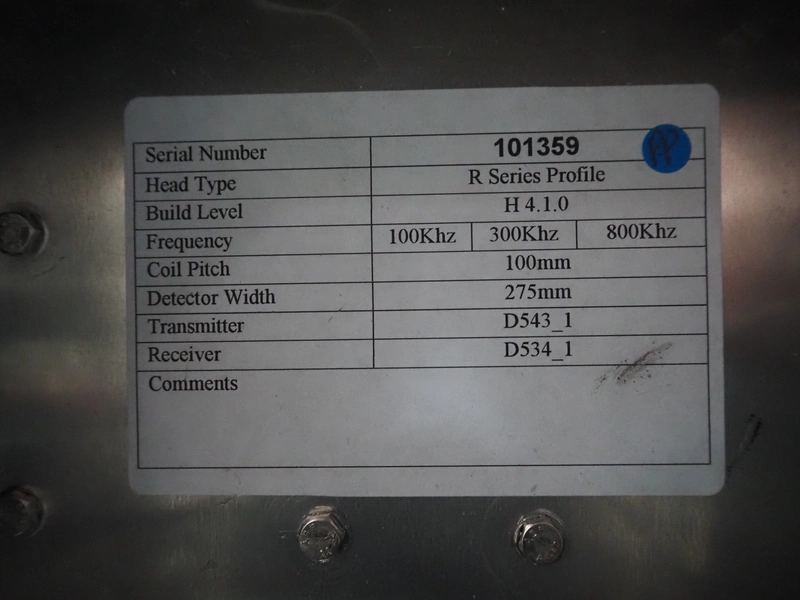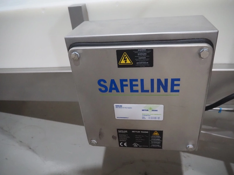 Mobile Safeline metal detector, type: R Series Profile, serial number: 101359, 100-240 V, 50/60 Hz, 340 W, plastic mesh belt with dividers, belt width: 330 mm, divider height: 15 mm, distance between dividers: 150 mm, elevating height: 840 mm, clearance: 350 mm x 140 mnm, total dimensions: 5350 mm x 1050 mm x 1000 mm.