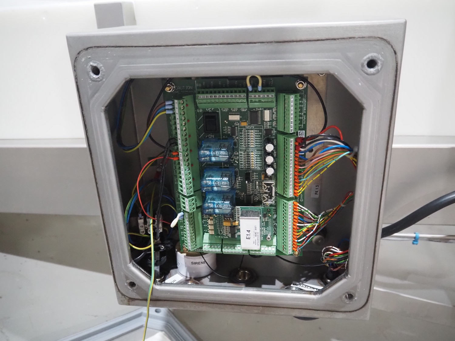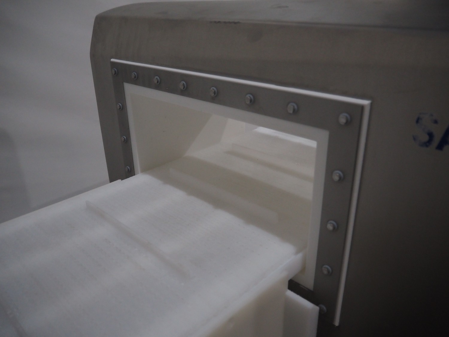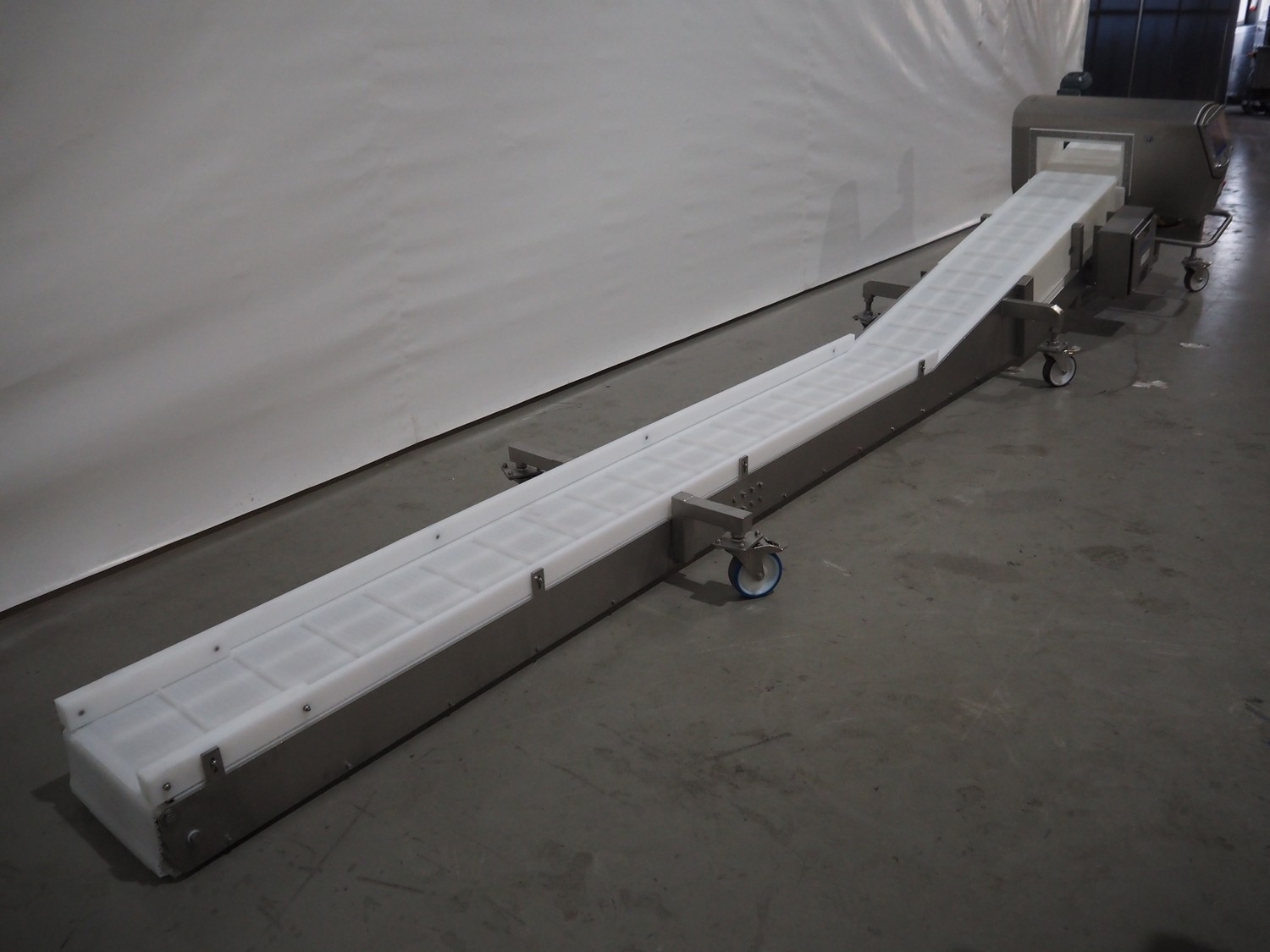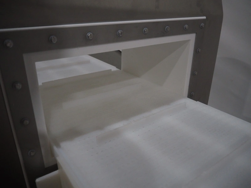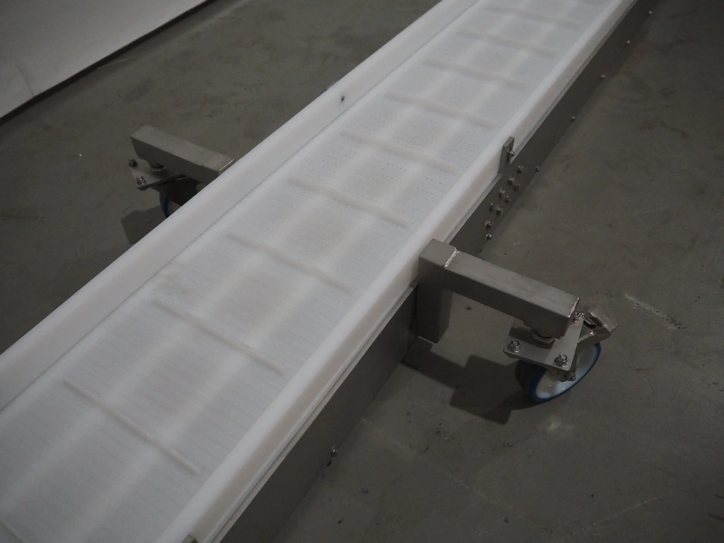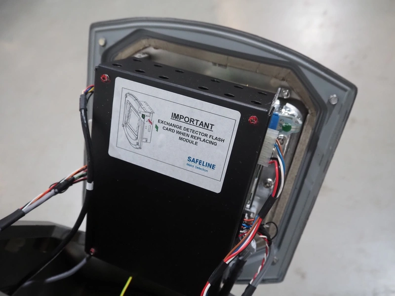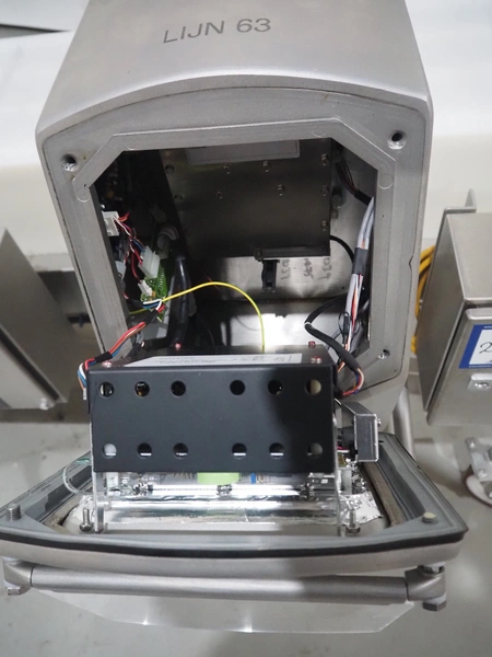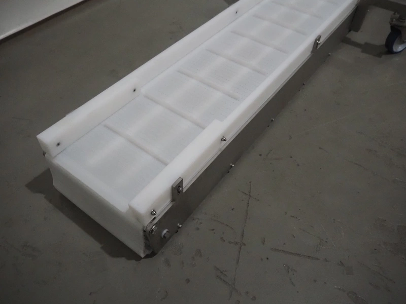 Mobile Safeline metal detector, type: R Series Profile, serial number: 101359, 100-240 V, 50/60 Hz, 340 W, plastic mesh belt with dividers, belt width: 330 mm, divider height: 15 mm, distance between dividers: 150 mm, elevating height: 840 mm, clearance: 350 mm x 140 mnm, total dimensions: 5350 mm x 1050 mm x 1000 mm.