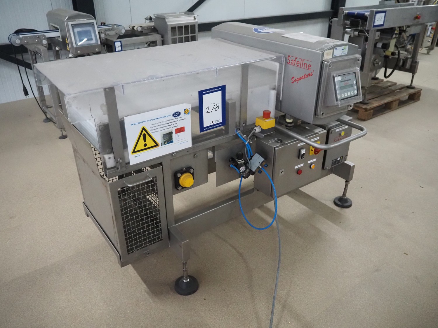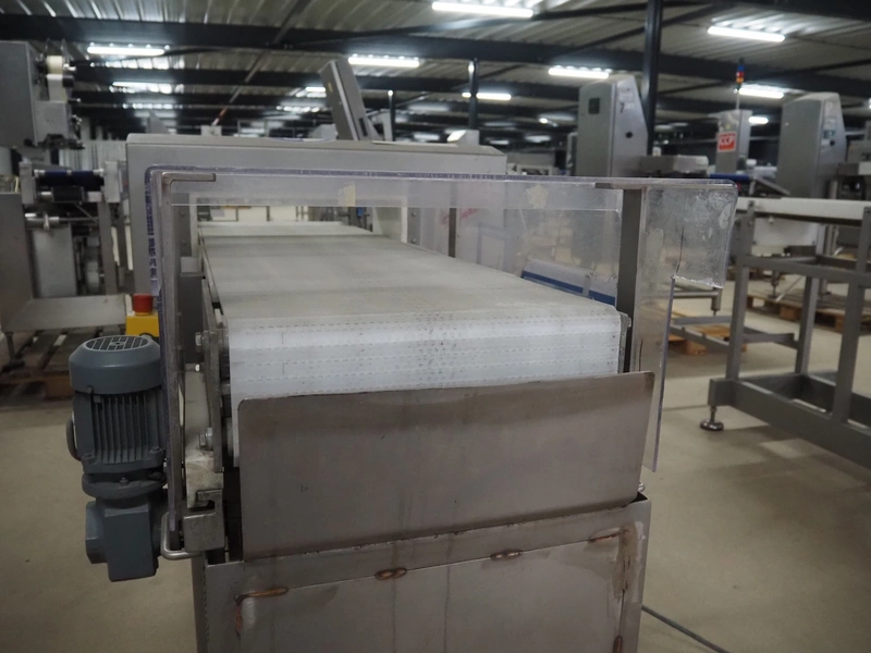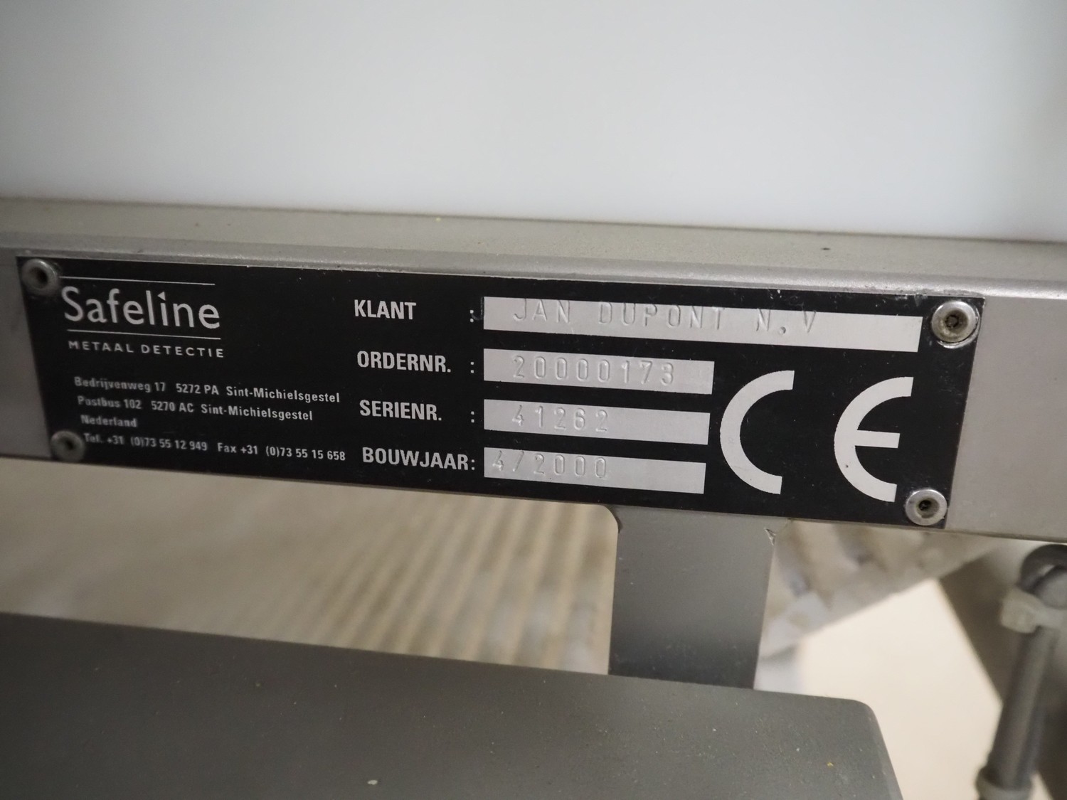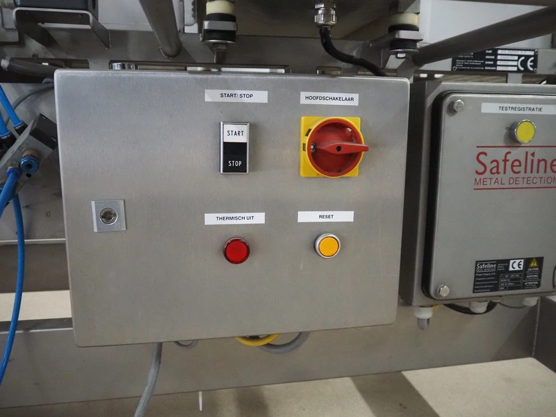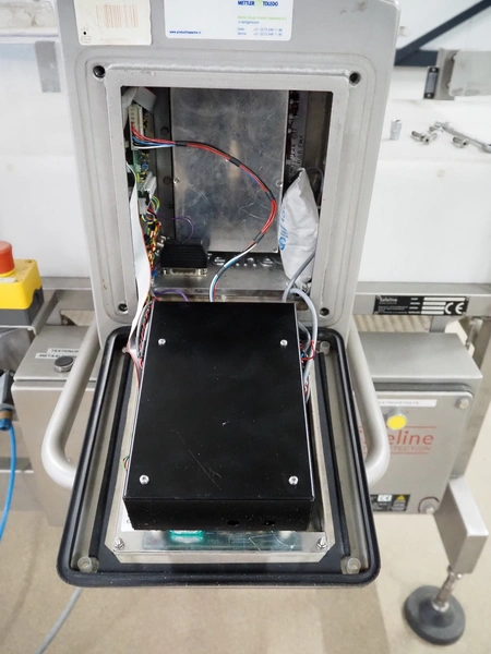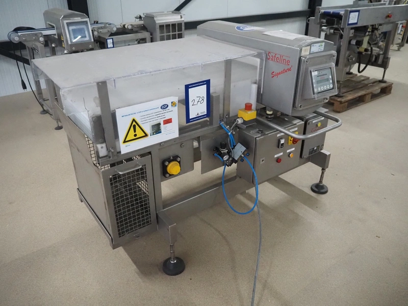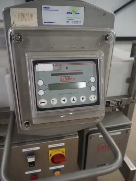 Safeline metal detector, serial number: 41262, year of construction: 4/2000, 100-240 Vac, 50/60 Hz, 330 W, plastic belt, belt width: 430 mm, clearance: 450 mm x 95 mm, total dimensions: 1750 mm x 1050 mm x 1130 mm.