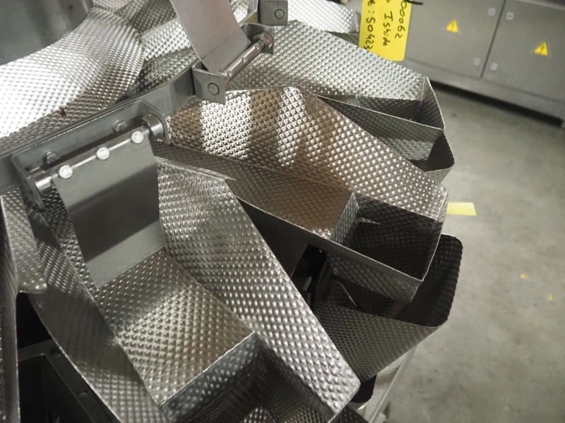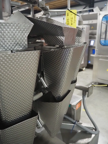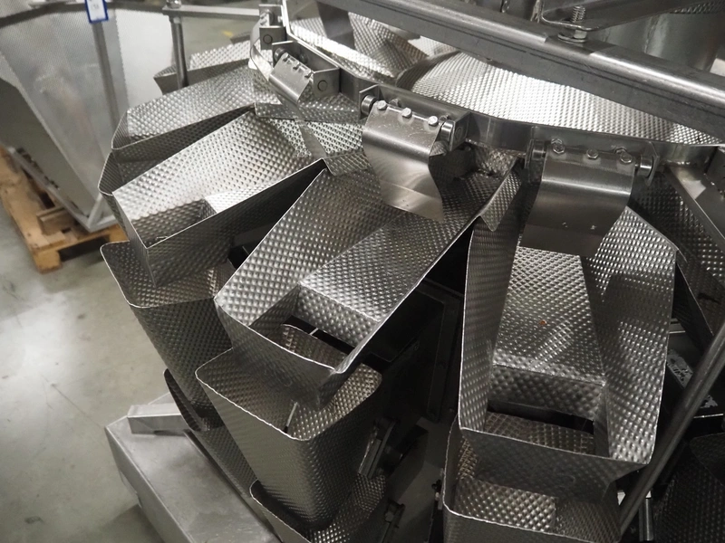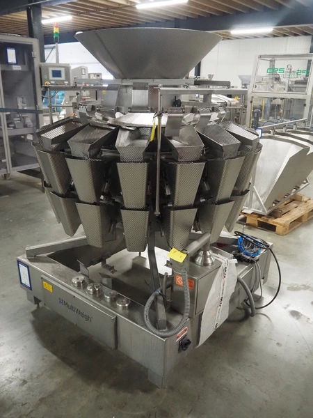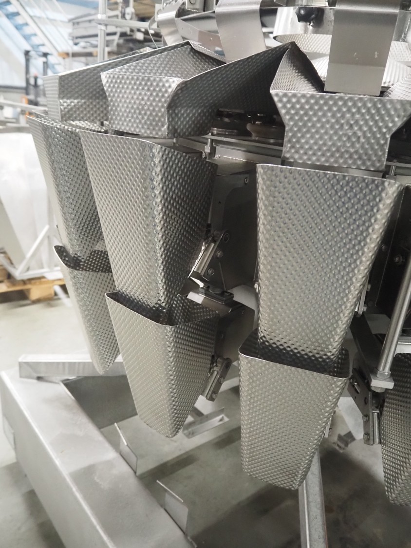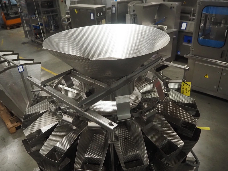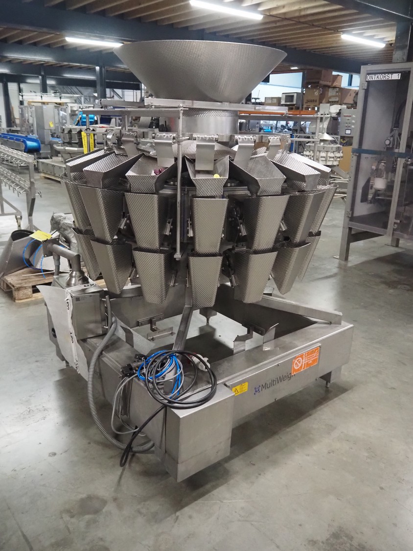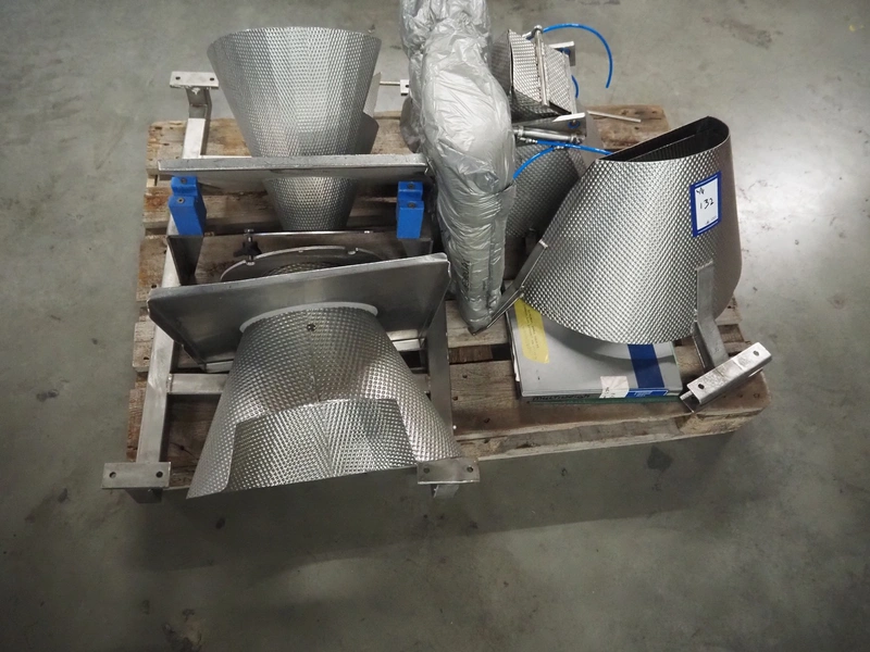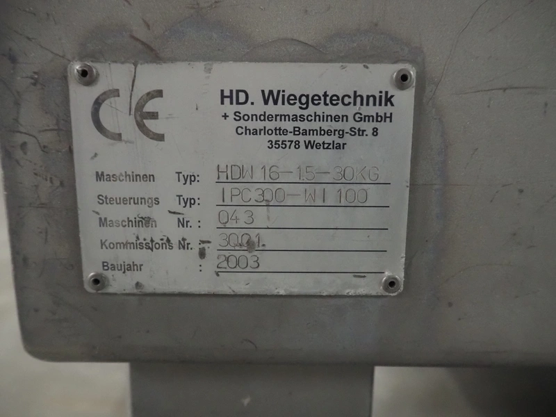 HD. Wiegetechnik + Sondermaschinen GmbH 16 heads multihead weigher, type: HDW 16-1.5-30 kg, machine number: 043, year of construction: 2003, dimensions: 1340 mm x 1340 mm x 1850 mm. Including s/s trolley for bins, dimensions trolley: 2420 mm x 500 mm x 1150 mm, s/s frame for gutters, dimensions frame: 1770 mm x 950 mm x 1000 mm and pallet with parts, dimensions pallet: 1200 mm x 800 mm x 550 mm.