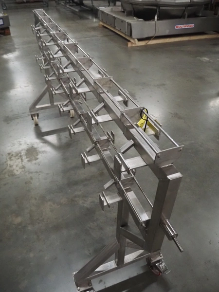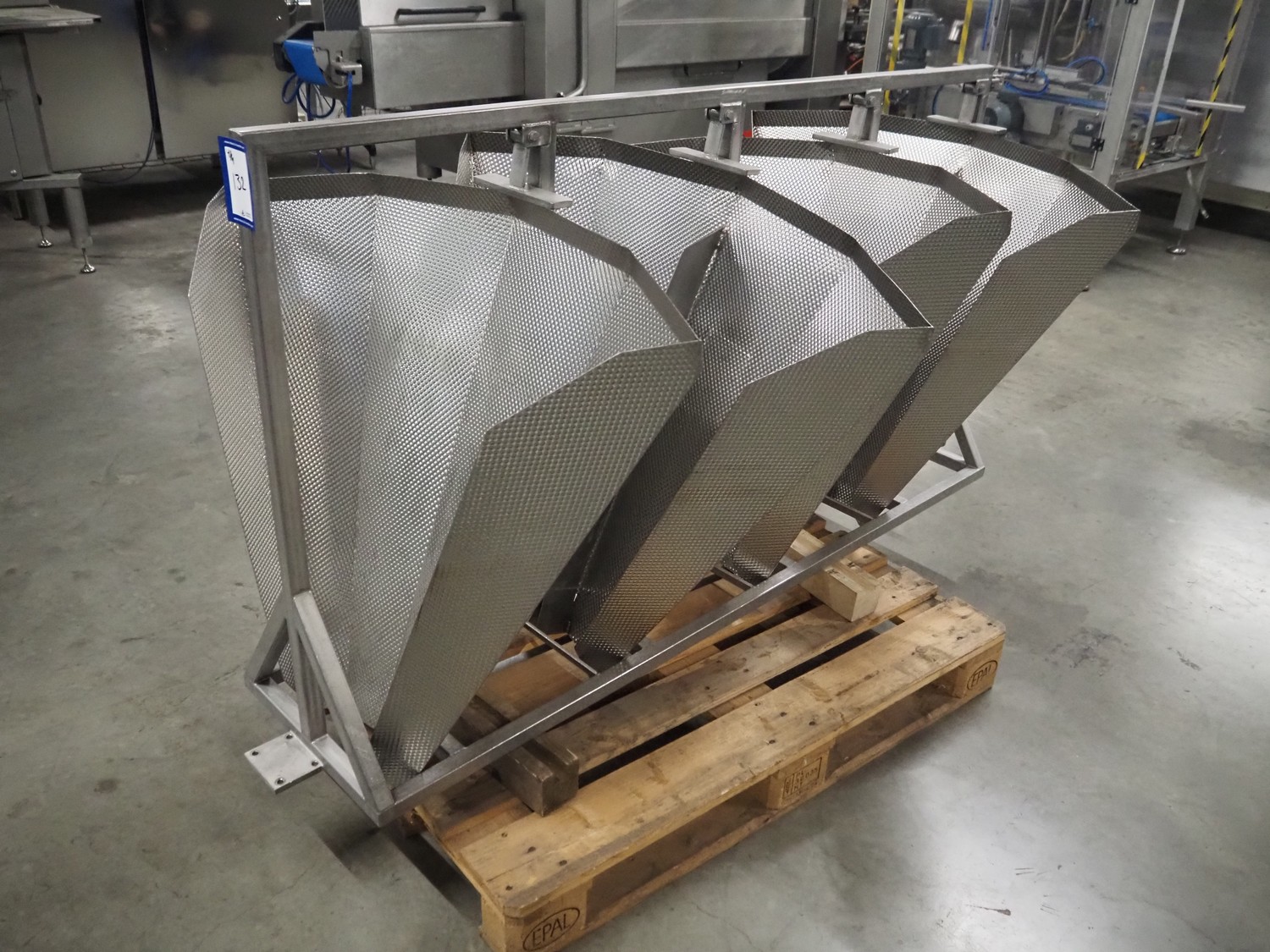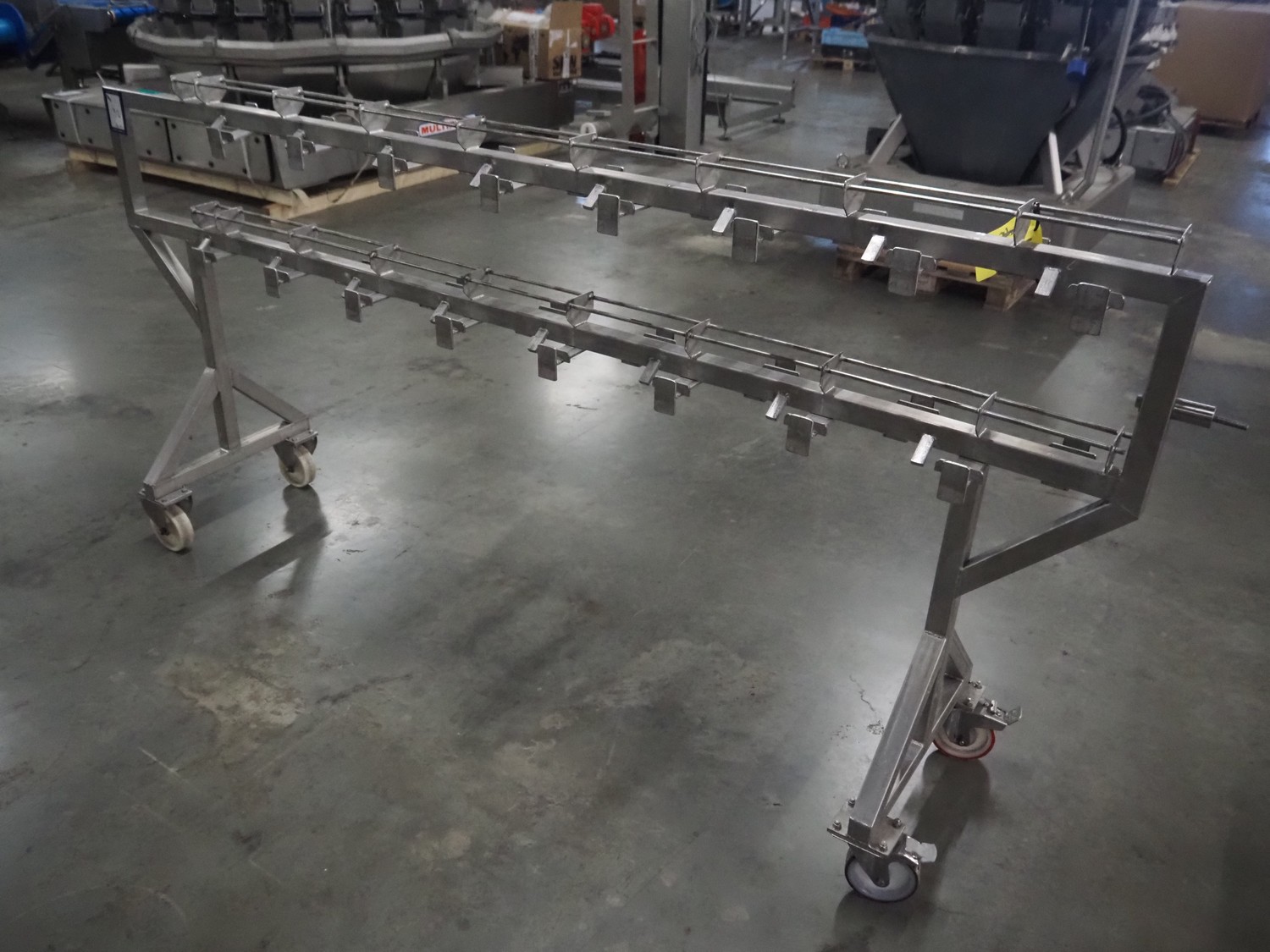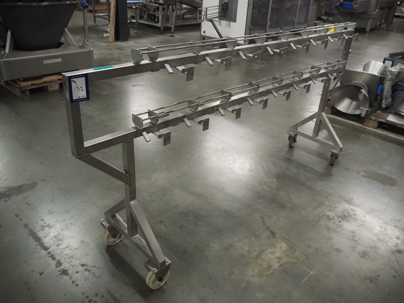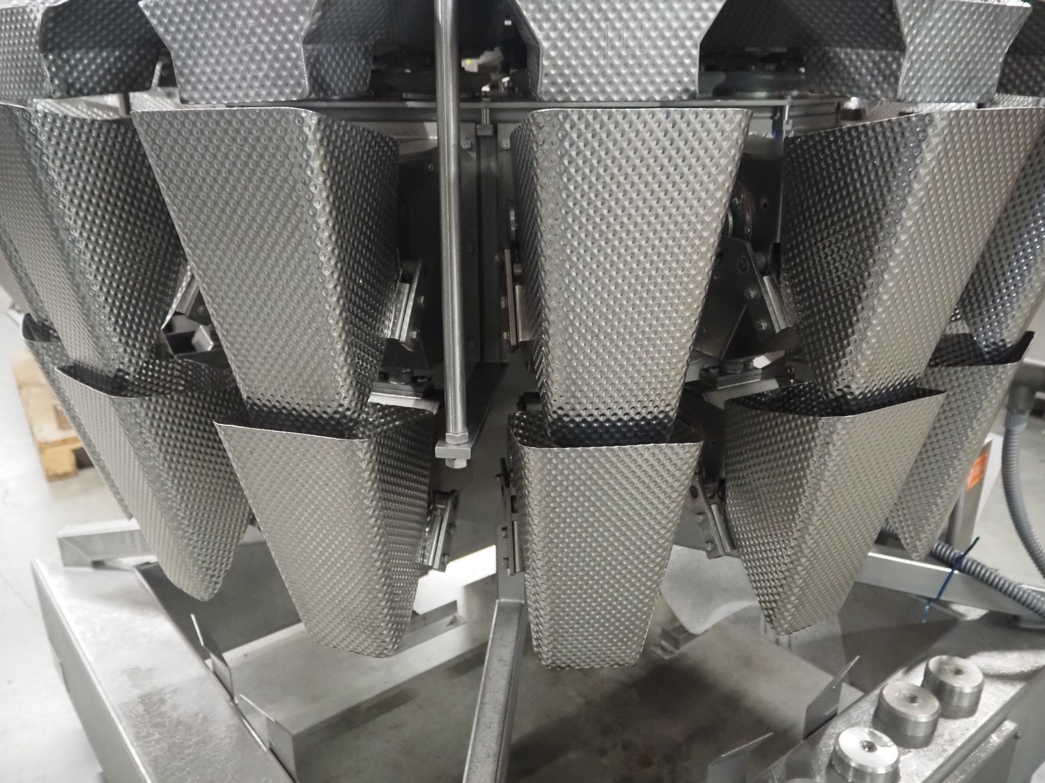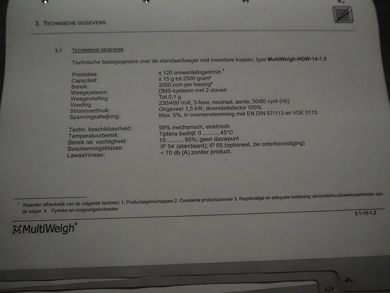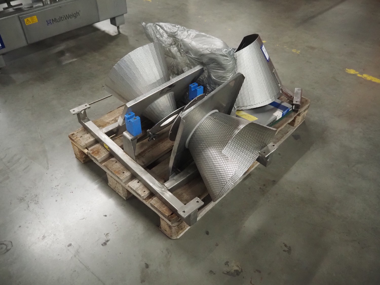HD. Wiegetechnik + Sondermaschinen GmbH 16 heads multihead weigher, type: HDW 16-1.5-30 kg, machine number: 043, year of construction: 2003, dimensions: 1340 mm x 1340 mm x 1850 mm. Including s/s trolley for bins, dimensions trolley: 2420 mm x 500 mm x 1150 mm, s/s frame for gutters, dimensions frame: 1770 mm x 950 mm x 1000 mm and pallet with parts, dimensions pallet: 1200 mm x 800 mm x 550 mm.