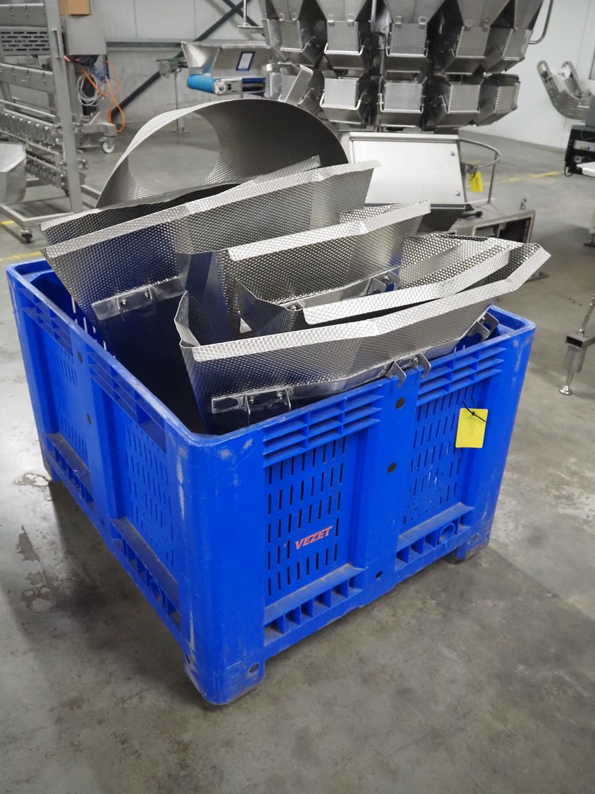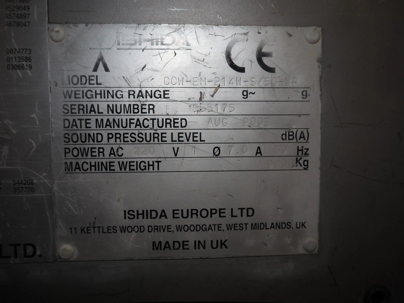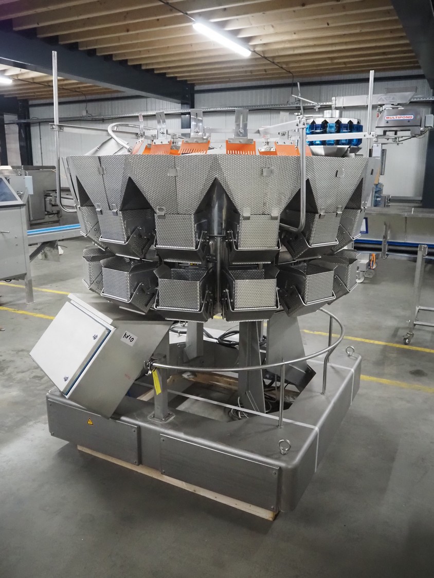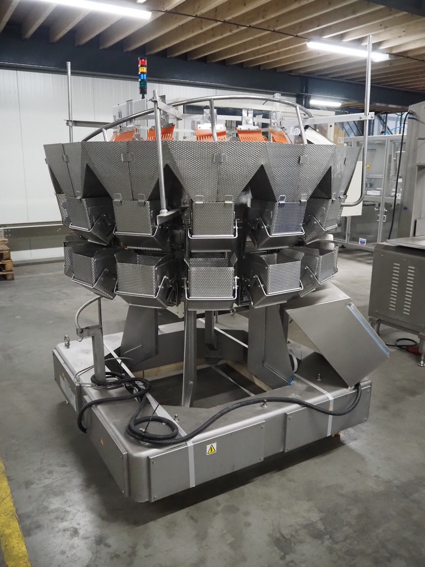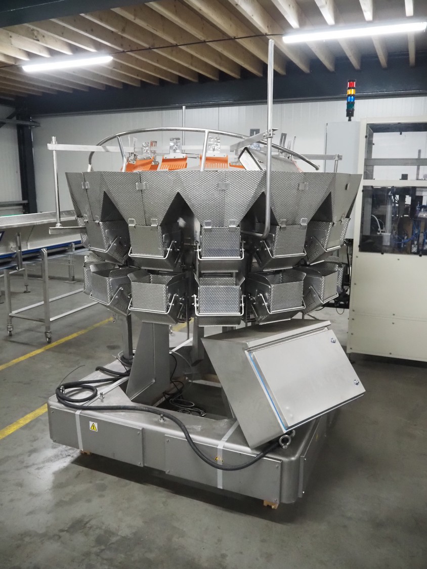 Ishida 14-heads multihead weigher, model: CCW-EM-214W-S/50-WR, serial number: 555175, year of construction: 2005, 220 V, 1 Ph, 50 Hz, 7 A, weight: 920 kg, dimensions: 1850 mm x 1700 mm x 2200 mm. Including pallet box with parts, dimensions pallet box: 1200 mm x 1000 mm x 1250 mm.