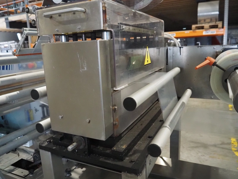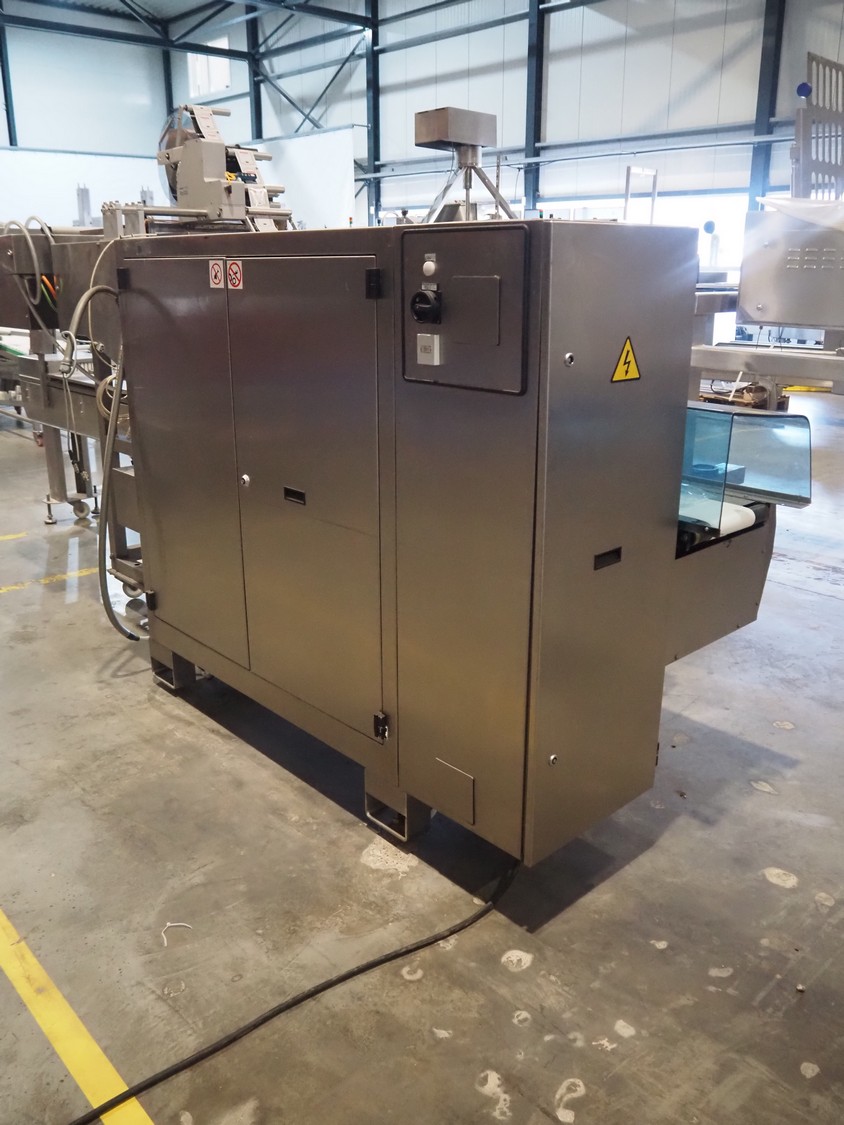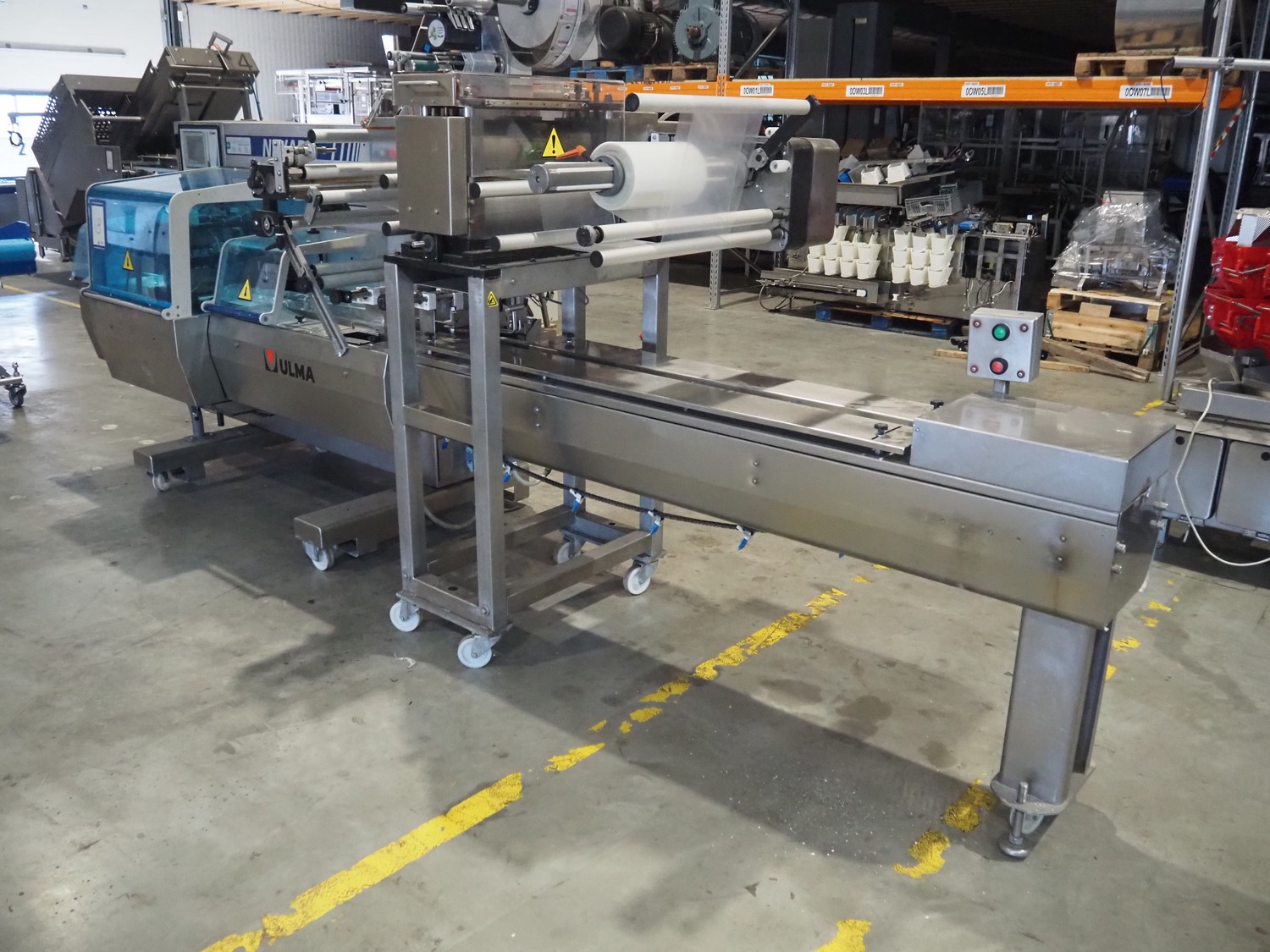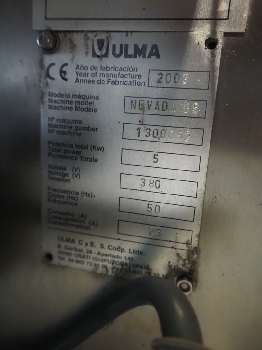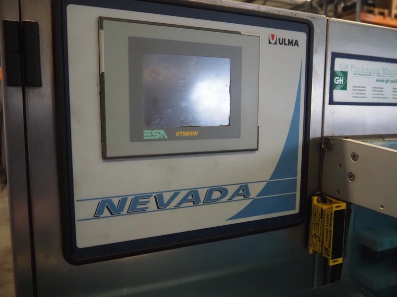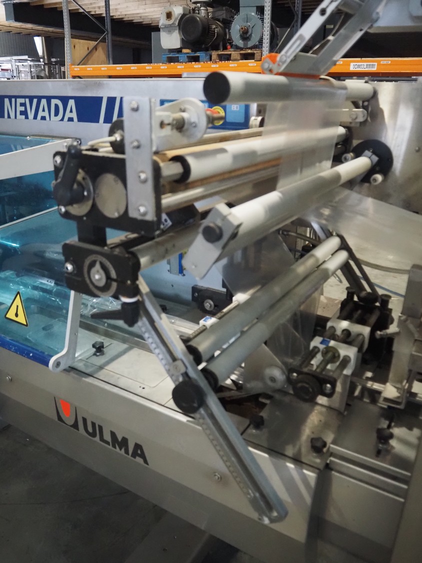 Ulma mobile flowpacker, model: Nevada BS, number: 1300052, year of construction: 2003, 380 V, 50 Hz, 23 A, 5 kW, ELS labelling machine, infeed belt with dividers, belt width: 150 mm, distance between dividers: 300 mm, divider height: 30 mm, seal width: 300 mm, plastic outfeed belt, belt width: 200 mm, total dimensions: 4500 mm x 1300 mm x 1150 mm.