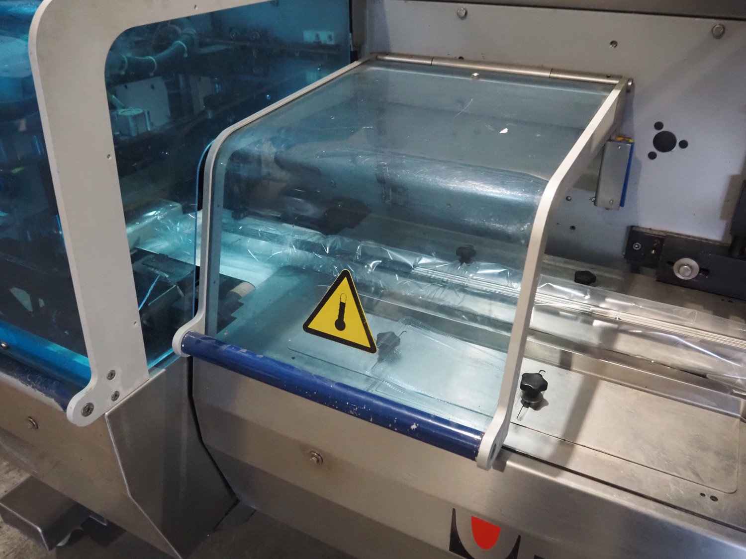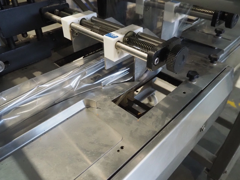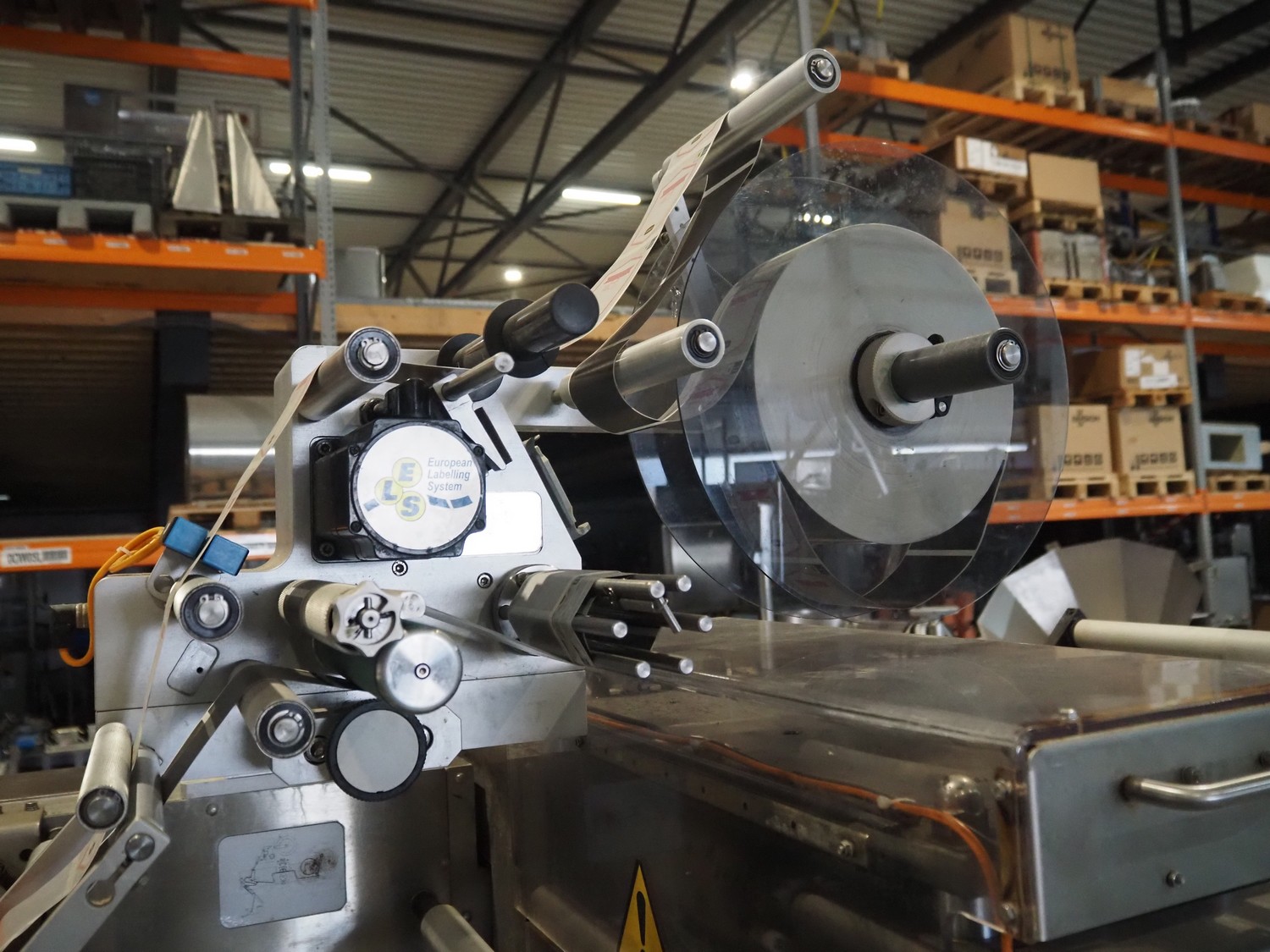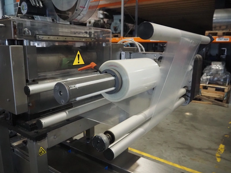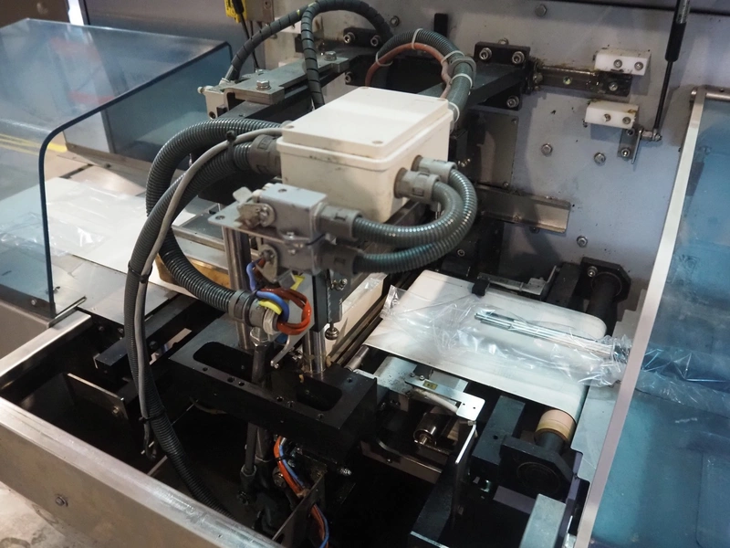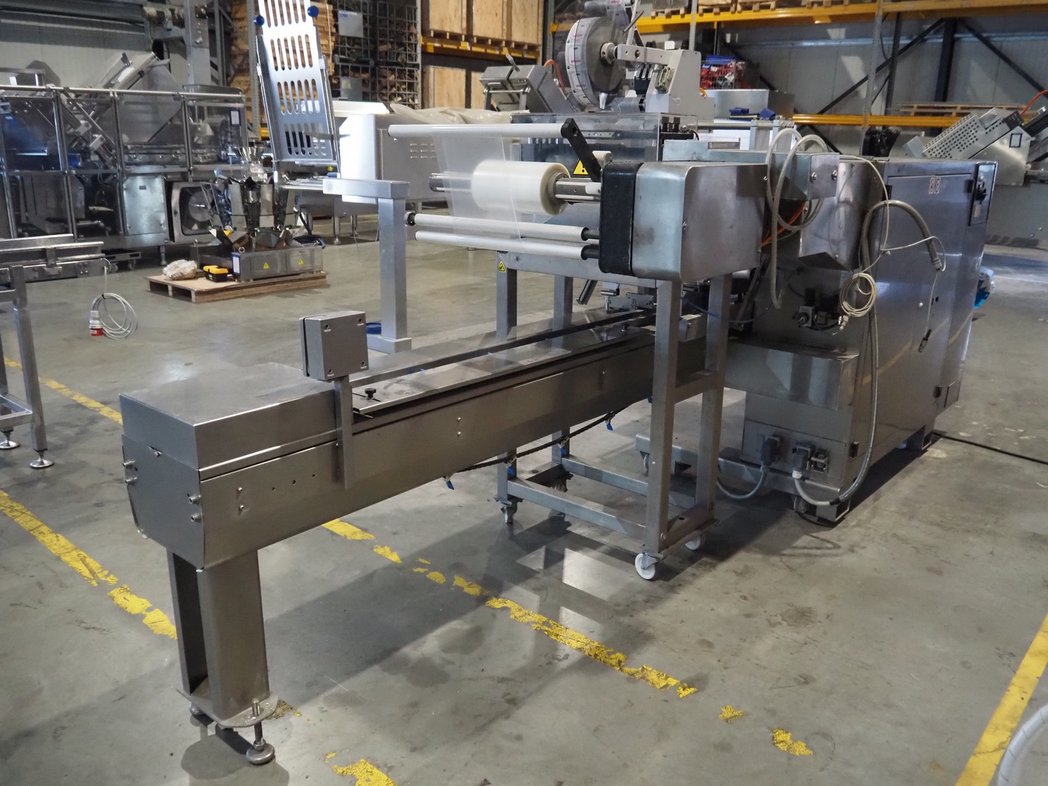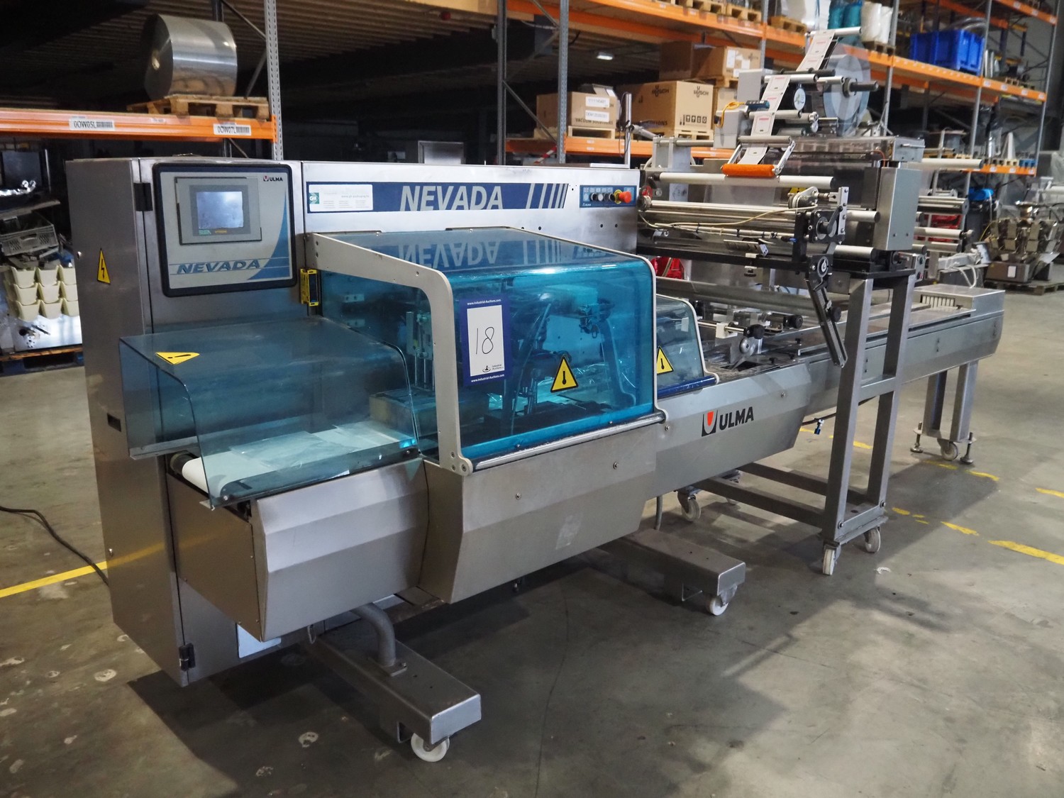 Ulma mobile flowpacker, model: Nevada BS, number: 1300052, year of construction: 2003, 380 V, 50 Hz, 23 A, 5 kW, ELS labelling machine, infeed belt with dividers, belt width: 150 mm, distance between dividers: 300 mm, divider height: 30 mm, seal width: 300 mm, plastic outfeed belt, belt width: 200 mm, total dimensions: 4500 mm x 1300 mm x 1150 mm.