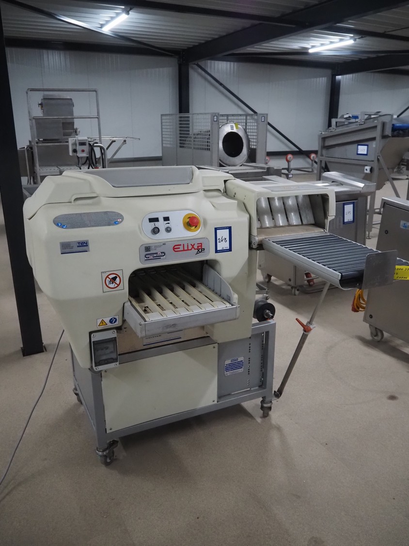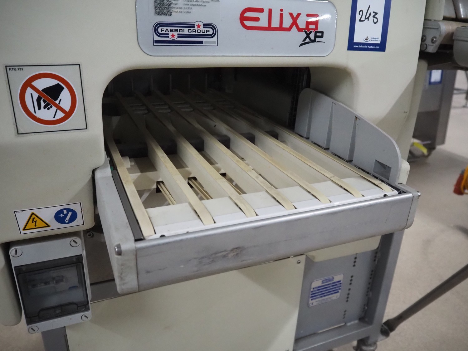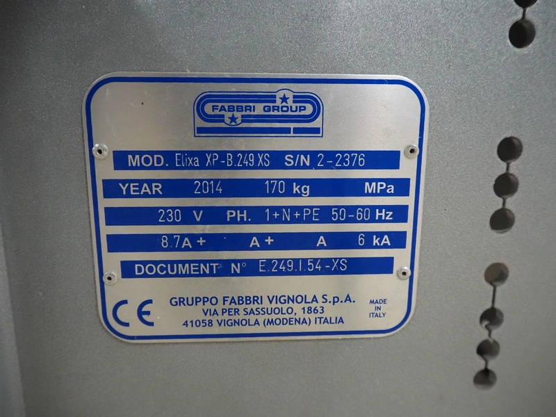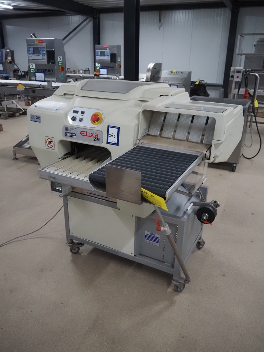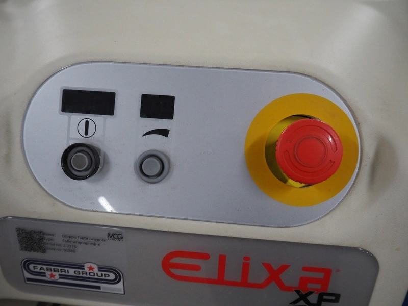 Fabbri Group mobile packaging machine, model: Elixa XP-B.249.XS, serial number: 2-2376, year of construction: 2014, 230 V, 1 Ph, 50-60 Hz, 8.7 A, plastic string infeed belt, belt width: 330 mm, plastic outfeed belt, belt width: 340 mm, plastic outfeed rollers, roller width: 300 mm, total dimensions: 1350 mm x 1250 mm x 1300 mm.