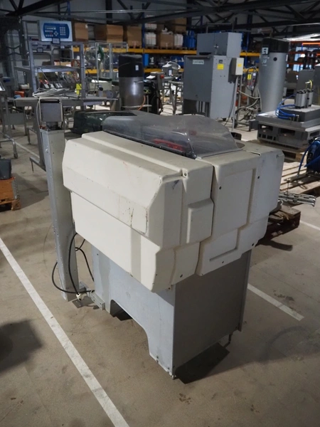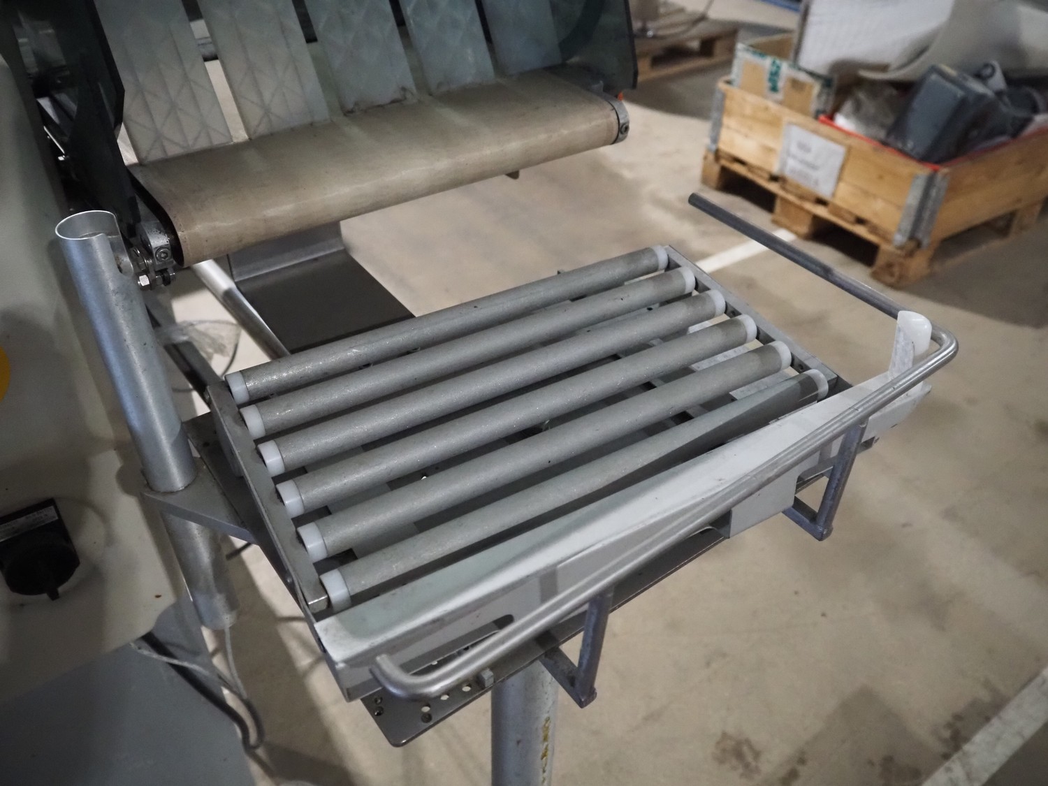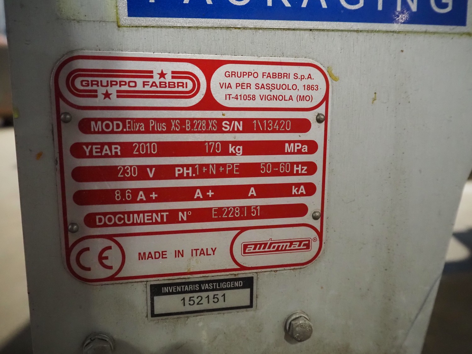 Gruppo Fabbri S.p.A. packaging machine, model: Elixa Plus XS-B.228.XS, serial number: 1/13420, year of construction: 2010, 230 V, 1 Ph, 50-60 Hz, 8,6 A, weight: 170 kg, wire infeed belt, belt width: 662 mm, plastic outfeed belt, belt width: 340 mm, total dimensions: 1500 mm x 1300 mm x 1350 mm.