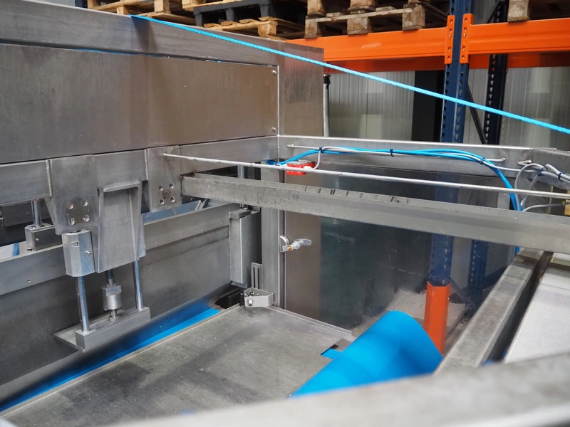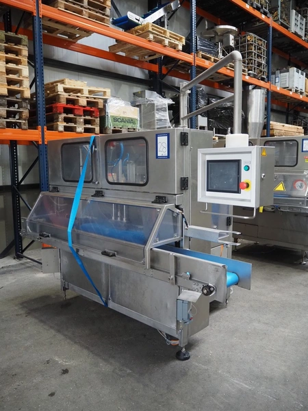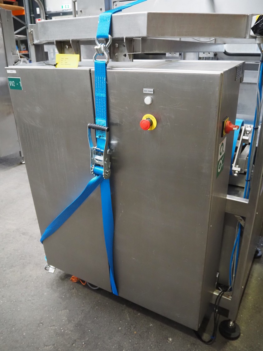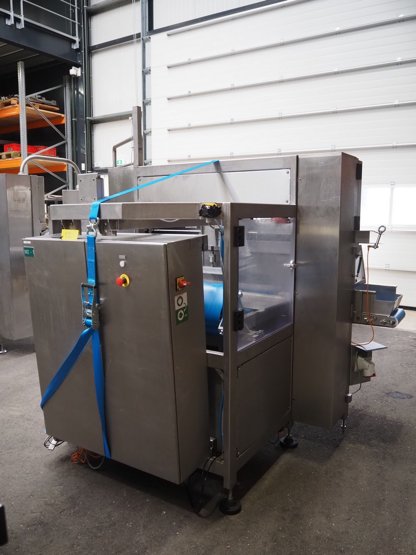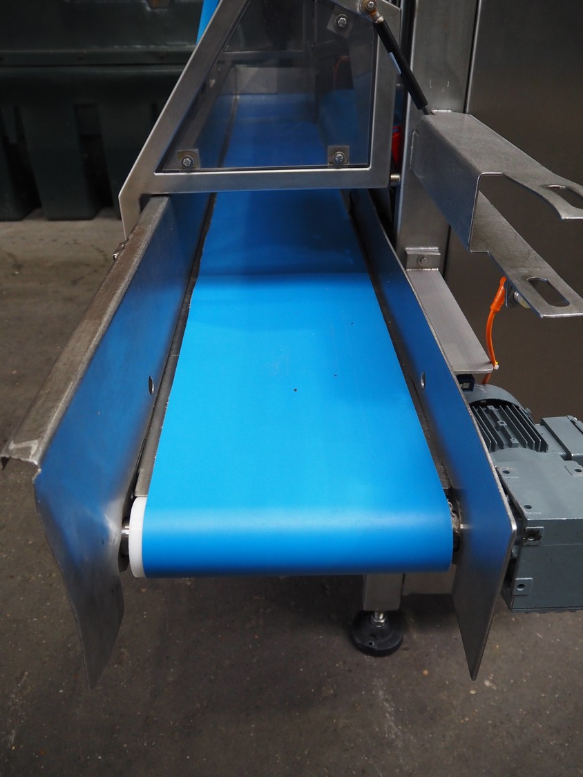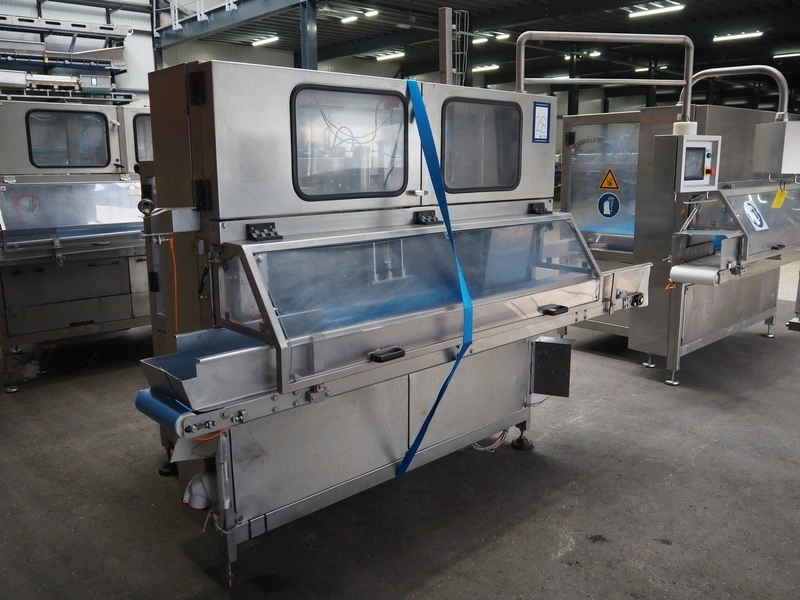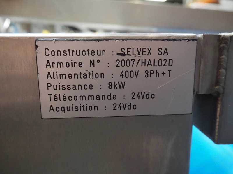 Selvex SA portioning machine, type: Ligne de découpe de fromages, registration: HAL02X, year of construction: 2007, 400 V, 3 Ph, 8 kW, clearance: 1150 mm x 490 mm, plastic belt, belt width: 1000 mm and 300 mm, knive width: 1100 mm, total dimensions: 2850 mm x 2700 mm x 2250 mm.