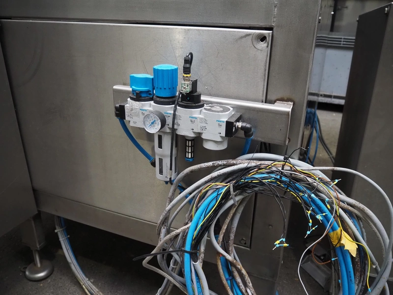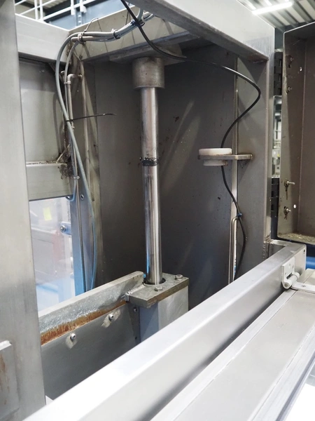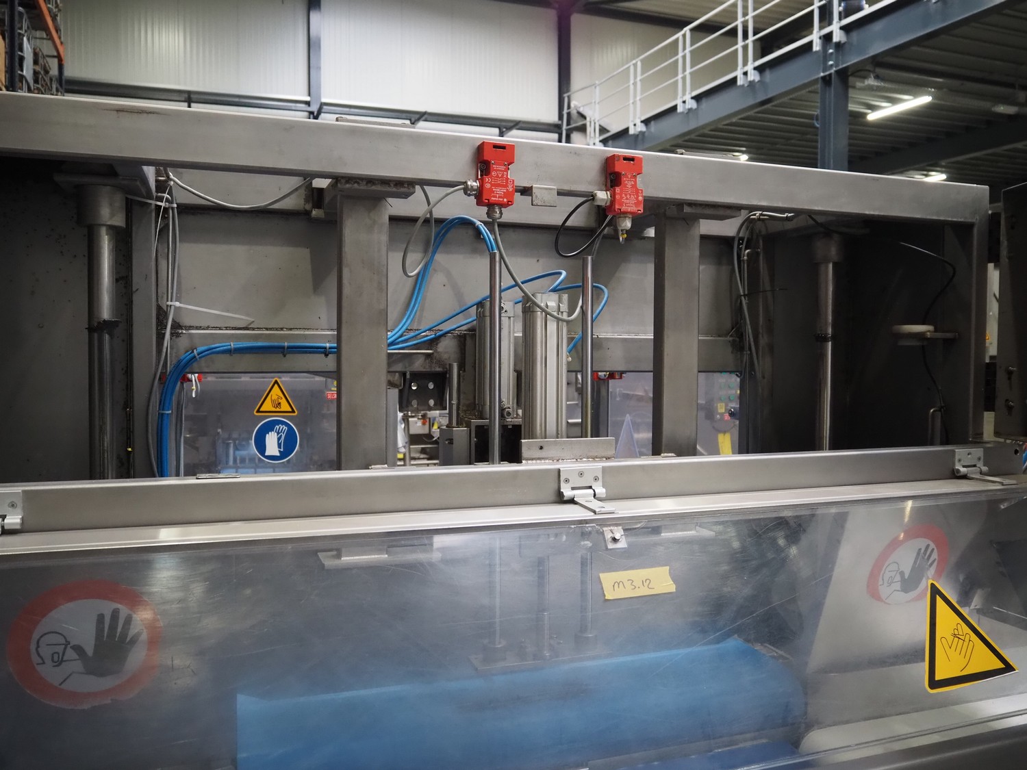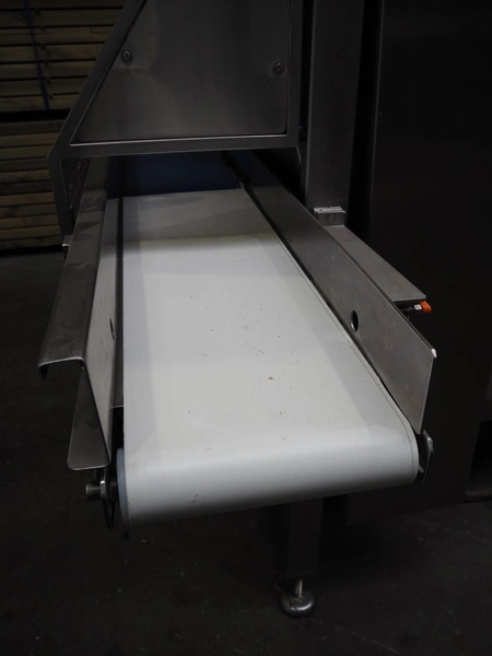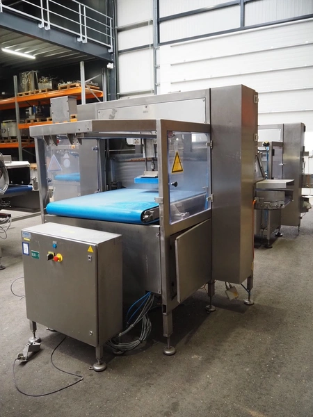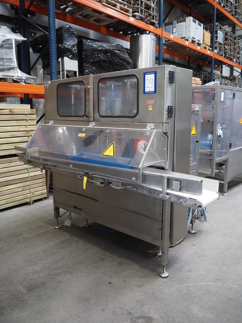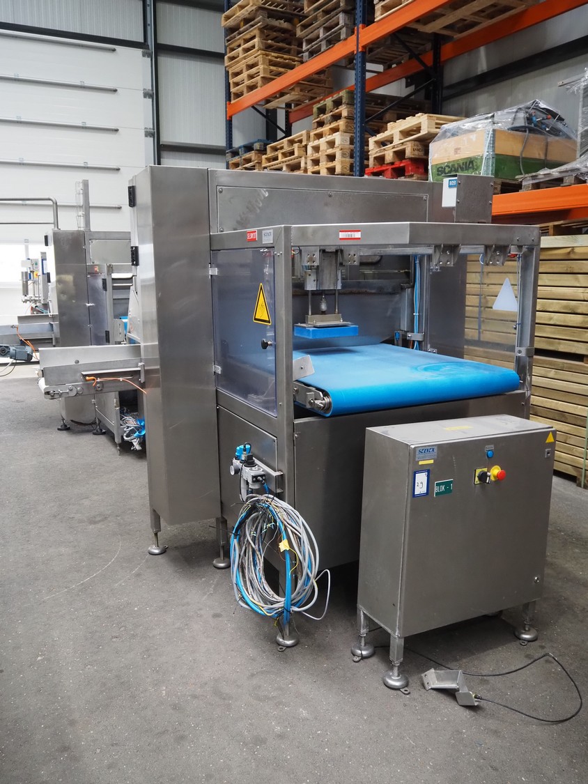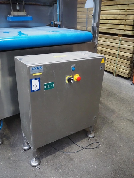 Selvex SA portioning machine, number: COL21-2, year of construction: 2002, 400 V, 3 Ph, 7 kW, infeed plastic belt, belt width: 1010 mm, clearance: 1230 mm x 500 mm, knive width: (1x) 1060 mm (1x) 340 mm, plastic belt, belt width: 290 mm, total dimensions: 2660 mm x 2010 mm x 2070 mm. Including s/s switch cabinet, dimensions switch cabinet: 760 mm x 340 mm x 980 mm.