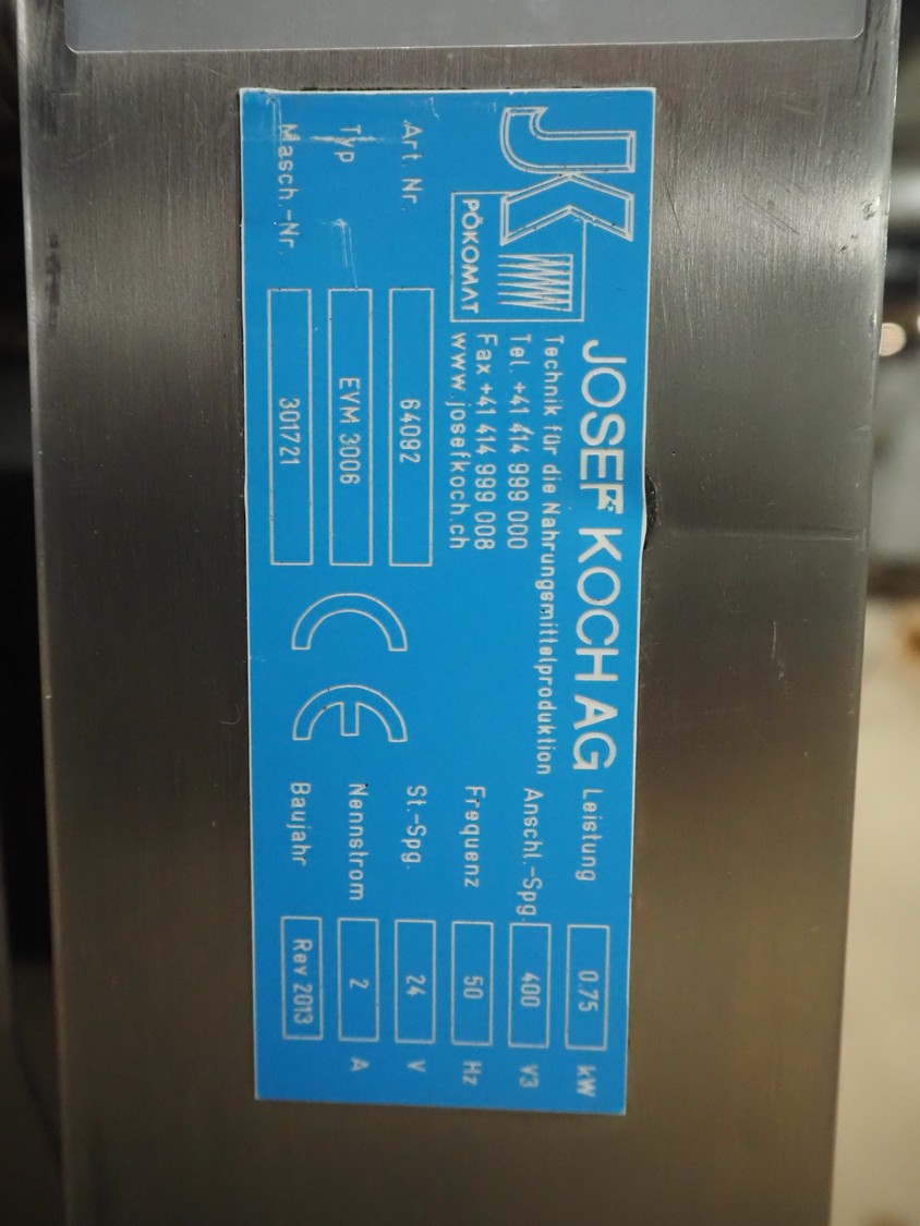 Josef Koch AG mobile skinning machine, type: EVM 3006, machine number: 301721, year of construction: Rev 2013, 400 V, 3 Ph, 50 Hz, 2 A, 0.75, working width: 540 mm, total dimensions: 900 mm x 550 mm x 1030 mm.