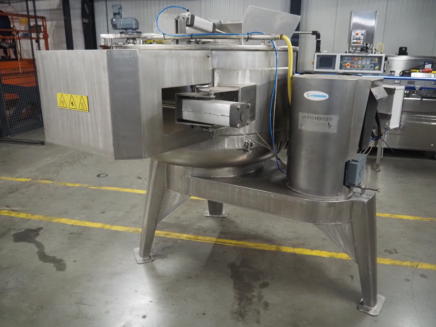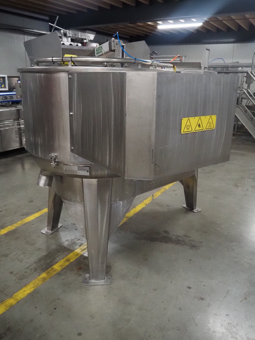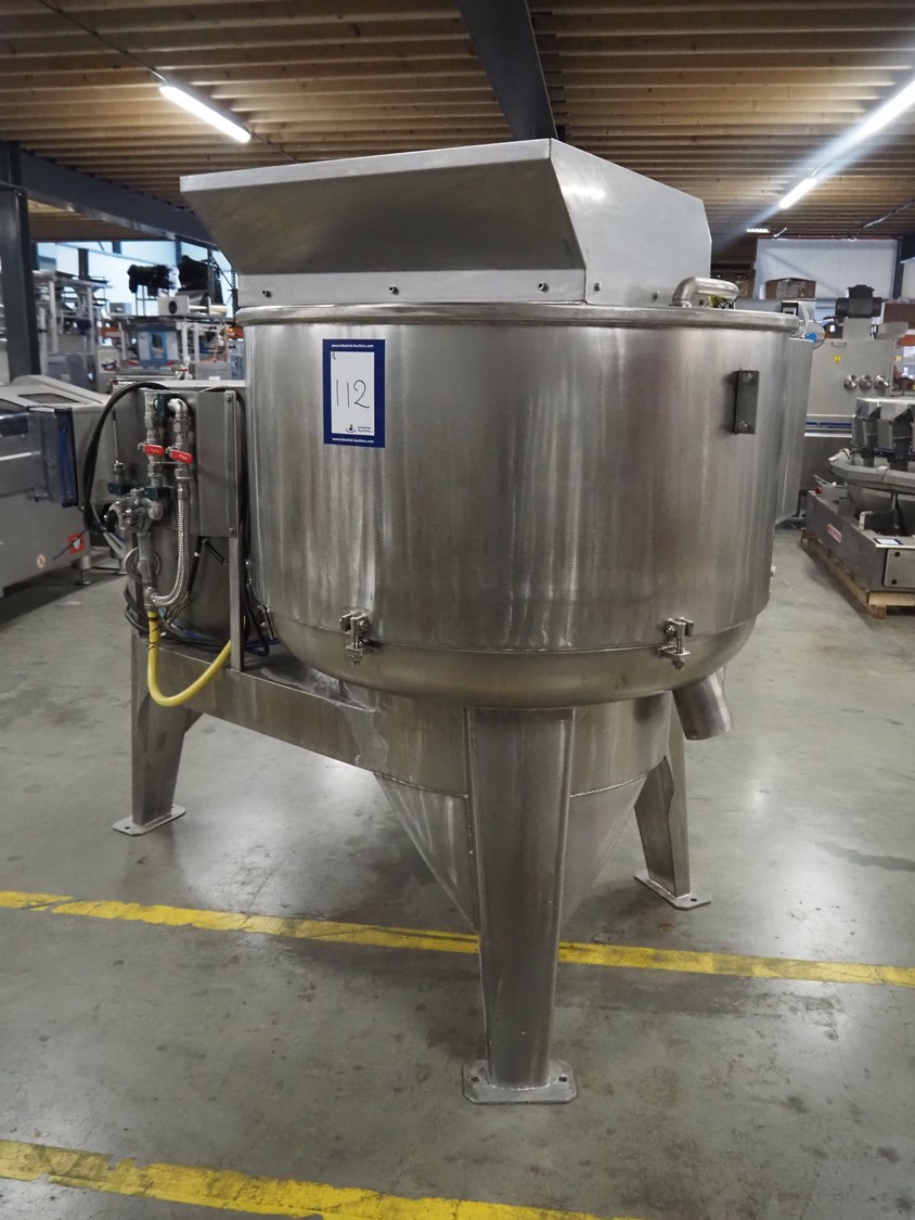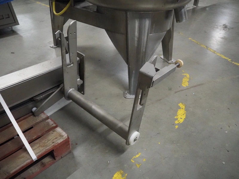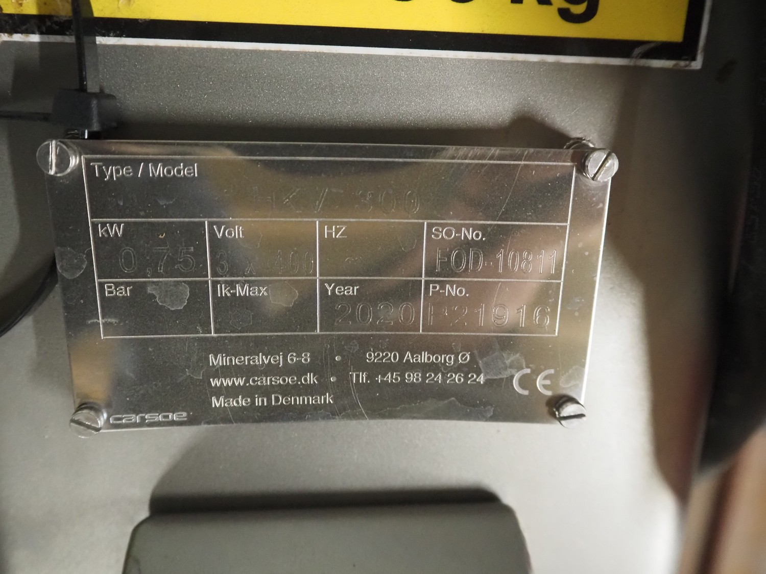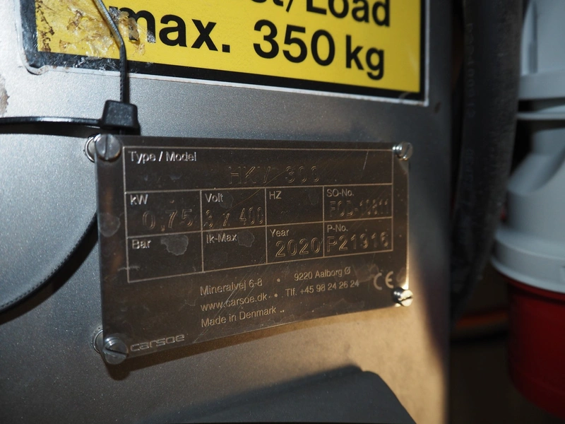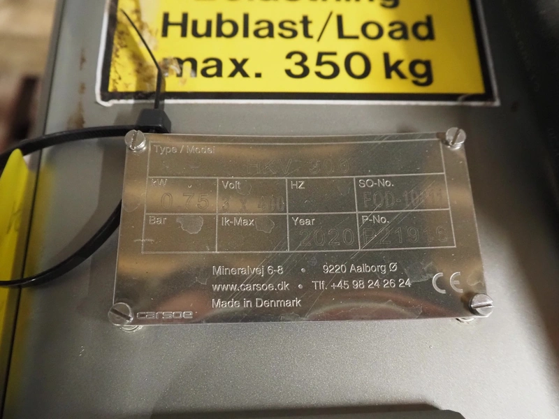 La Parmentiere dehairing machine with Carsoe lifter for meat bins, type: 770P, machine number: 770P414, year of construction: 06.2020, type lifter: HKV 300, serial number: FOD-10811, year of construction: 2020, 400 V, 3 Ph, 0.75 kW, dimensions: 2050 mm x 1800 mm x 1870 mm, dimensions lifter: 3150 mm x 1500 mm x 900 mm.