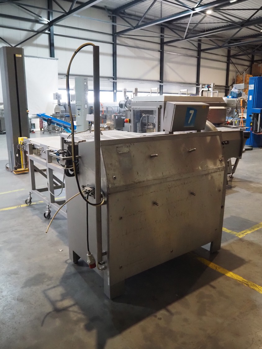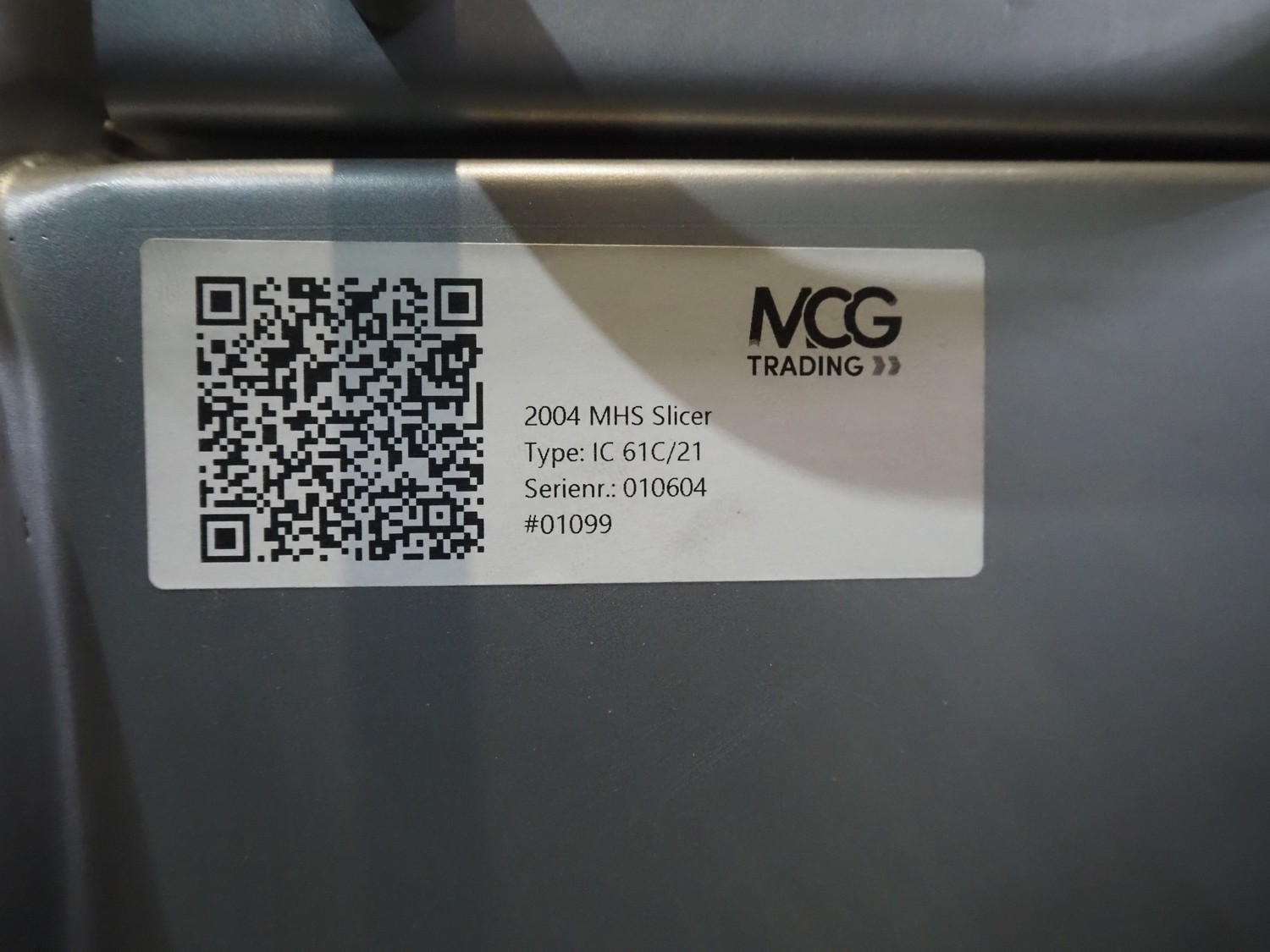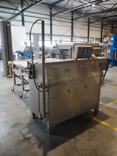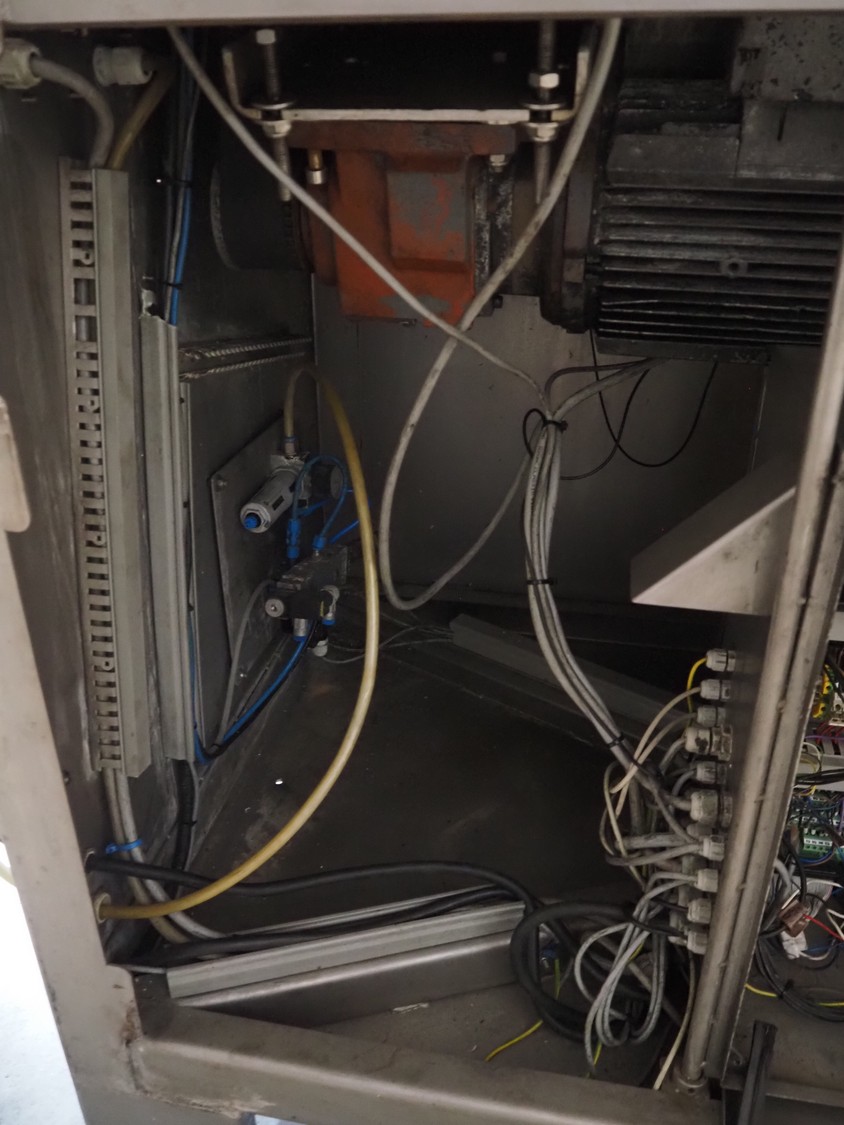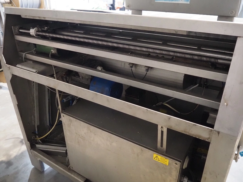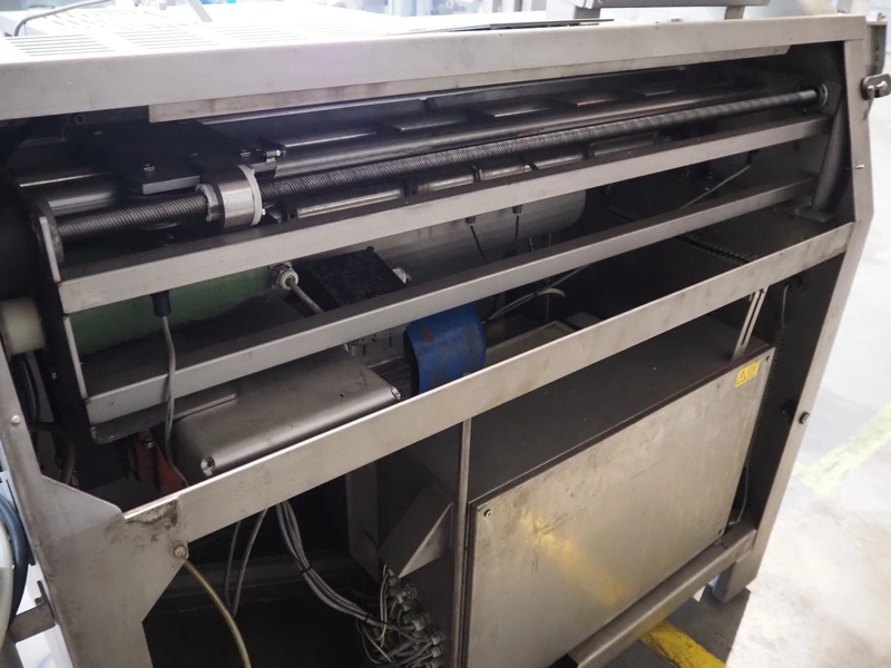 MHS Schneidetechnik GmbH slicer with infeed belt, type: IC610/21, serial number: 010604, year of construction: 2004, 400 V, 15.25 A, 6.1 kW, plastic belt, belt width: 610 mm, dimensions chamber: 210 mm x 210 mm, total dimensions: 2400 mm x 800 mm x 1500 mm, dimensions infeed belt: 2700 mm x 860 mm x 1500 mm.