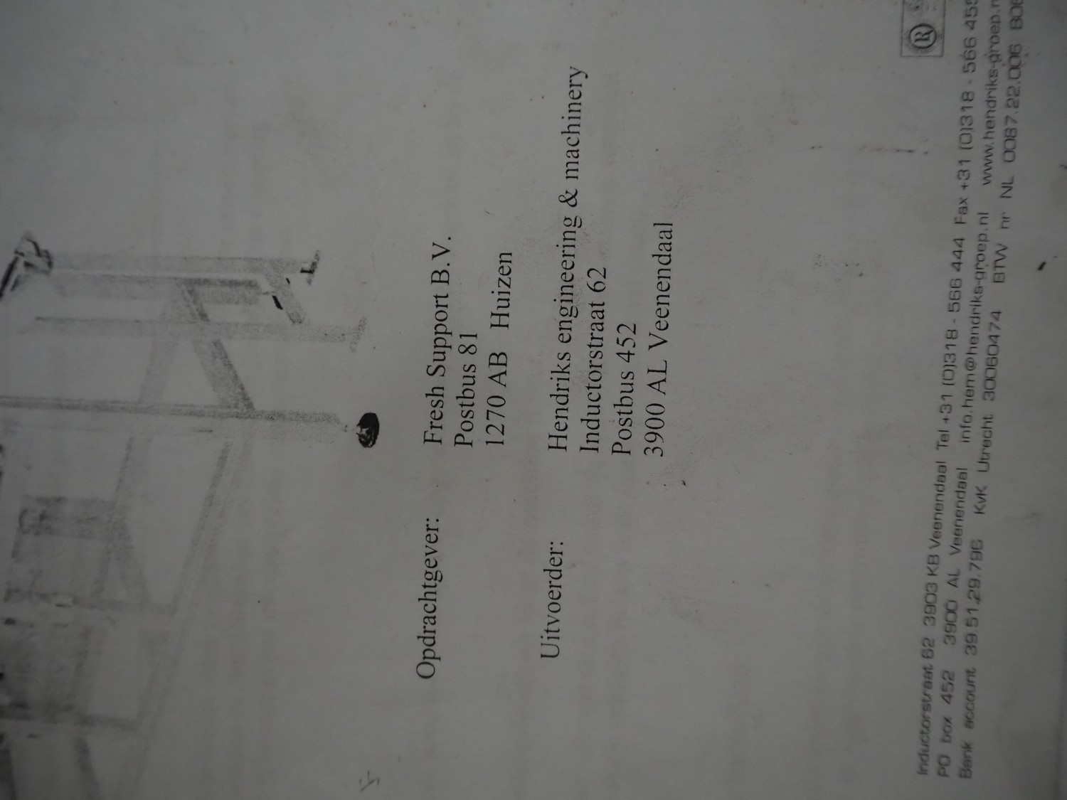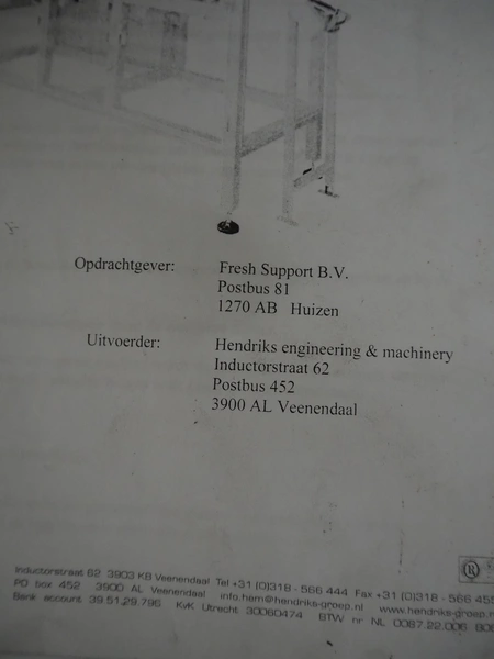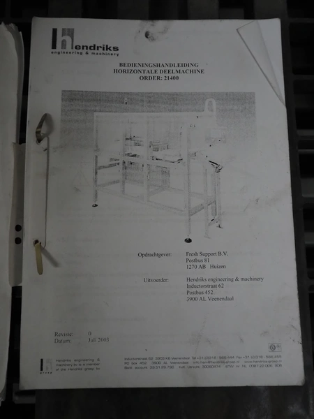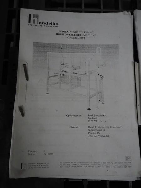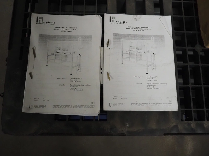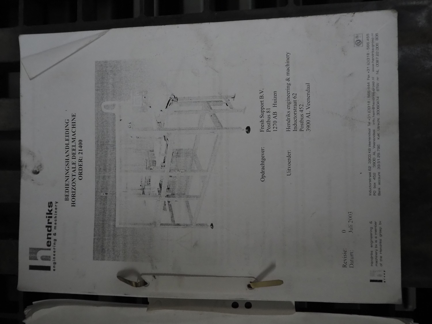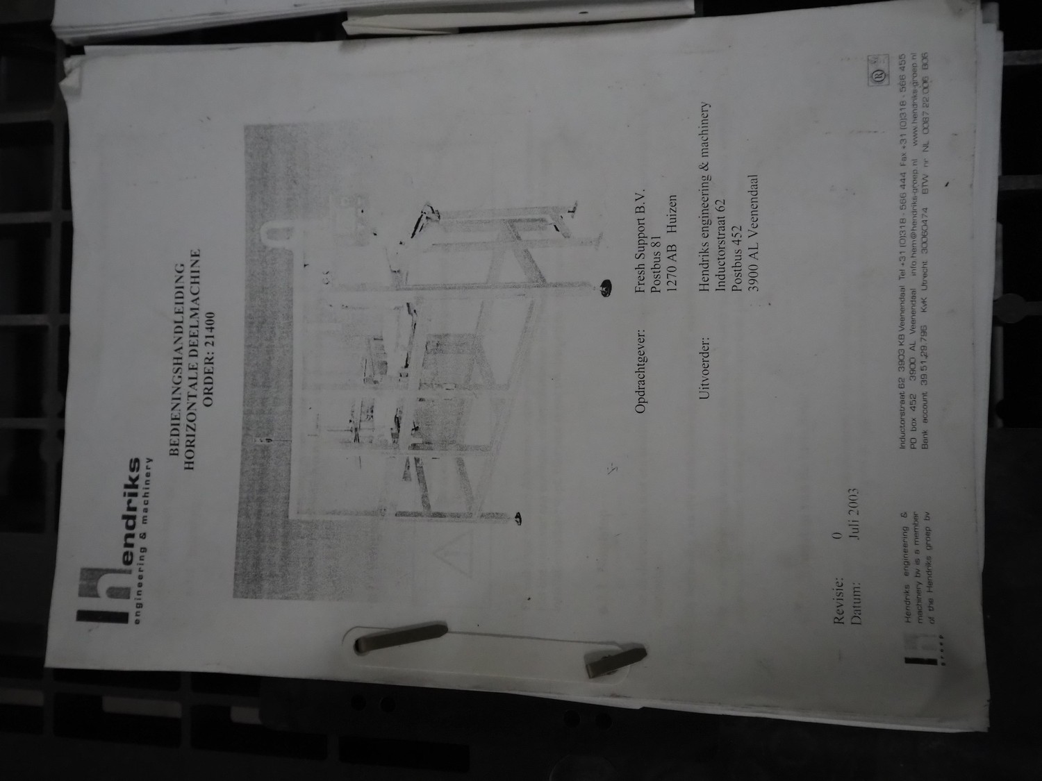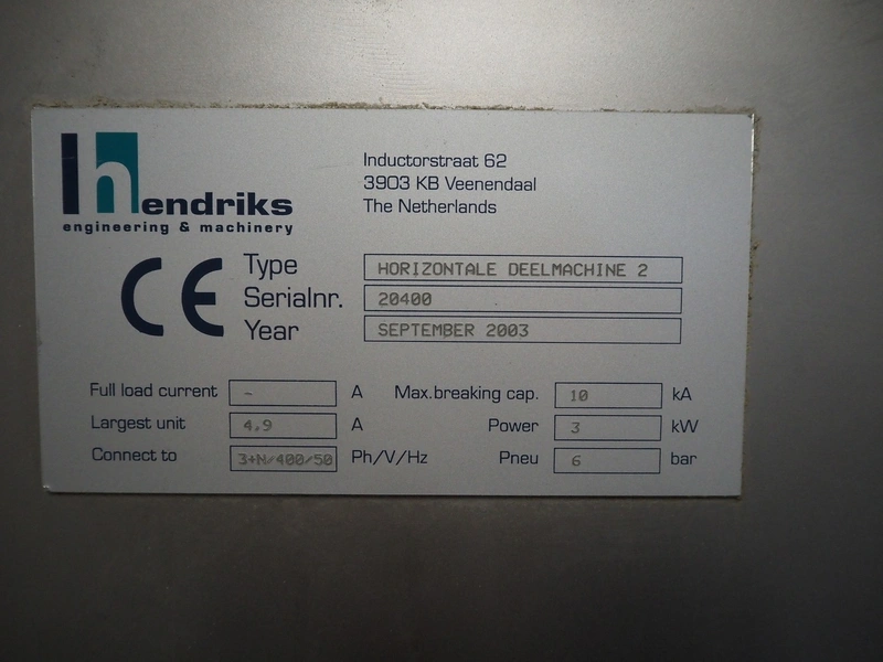 Machinefabriek Hendriks B.V. horizontal slicer for cheese, type: Horizontale deelmachine 2, serial number: 20400, year of construction: September 2003, 400 V, 3 Ph, 50 Hz, 4.9 A, 3 kW, 10 kA, 6 bar, plastic rollers, roller width: 400 mm, total dimensions: 2700 mm x 1250 mm x 2050 mm.