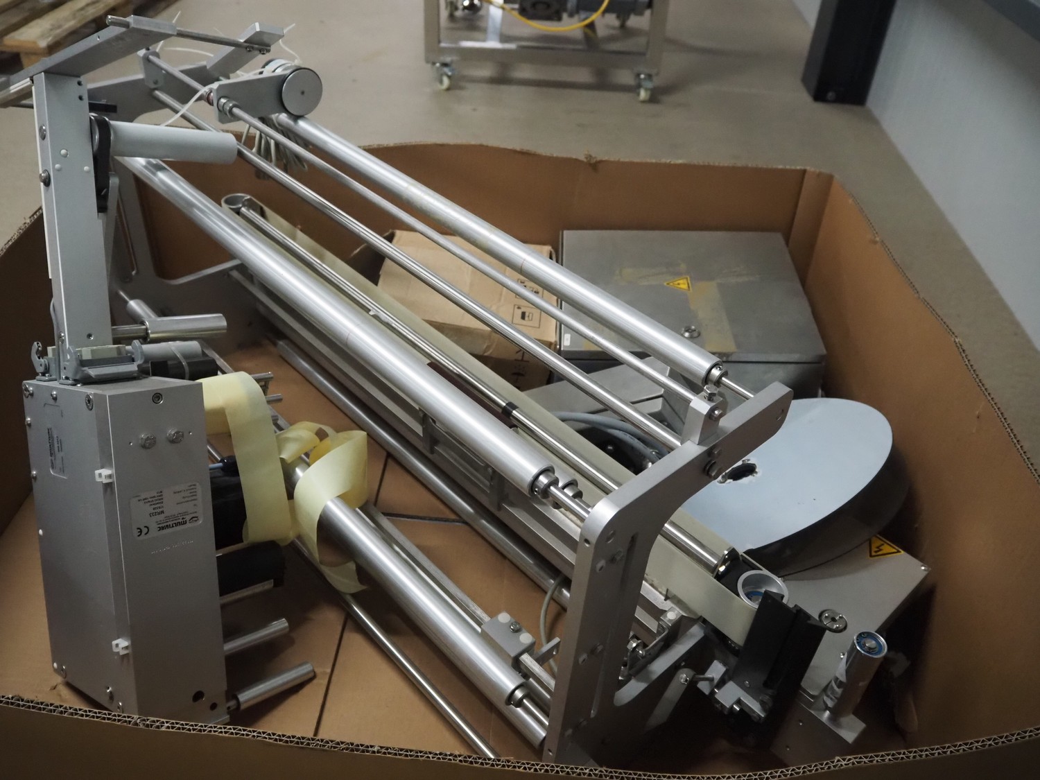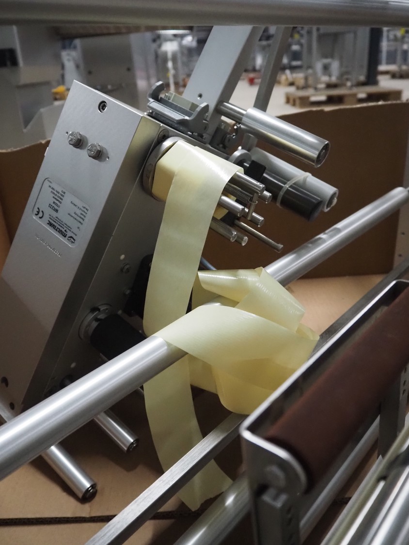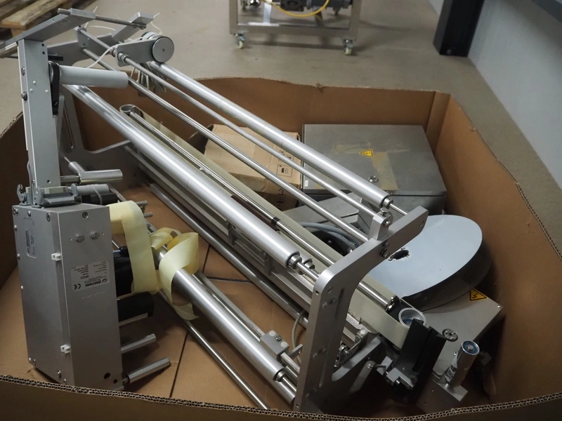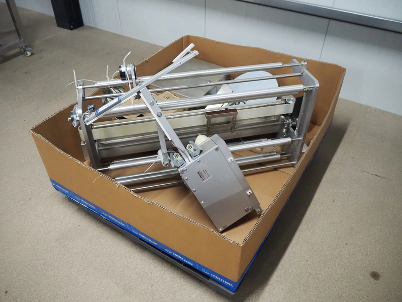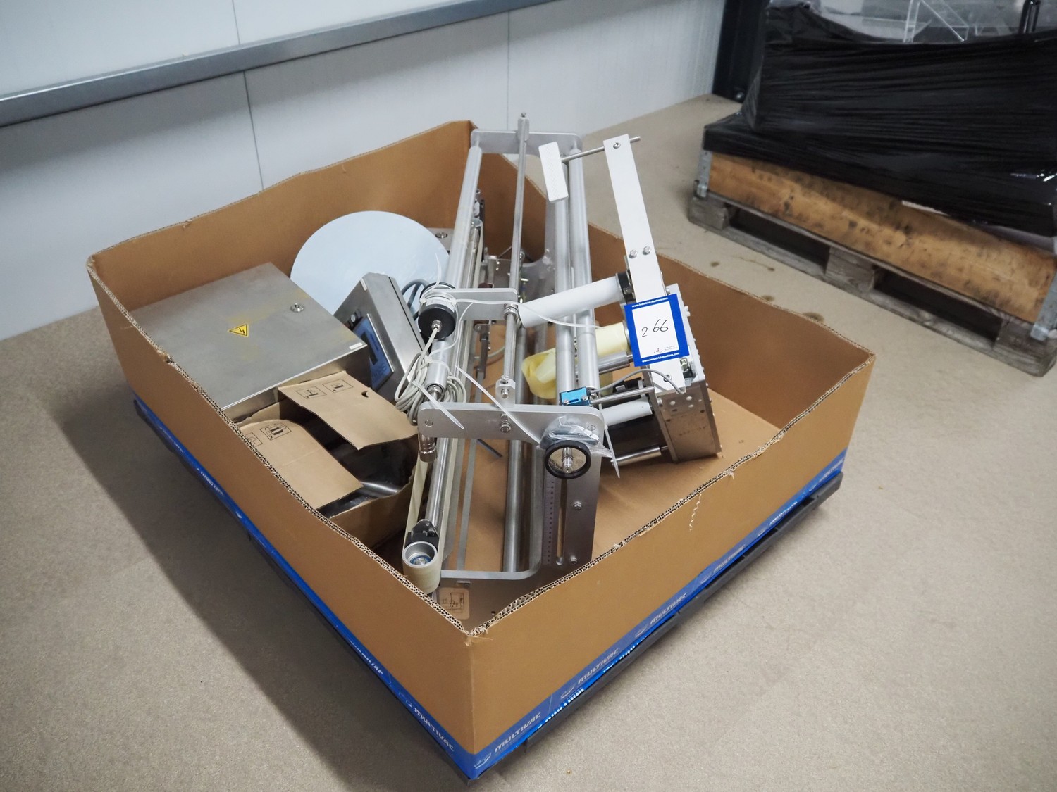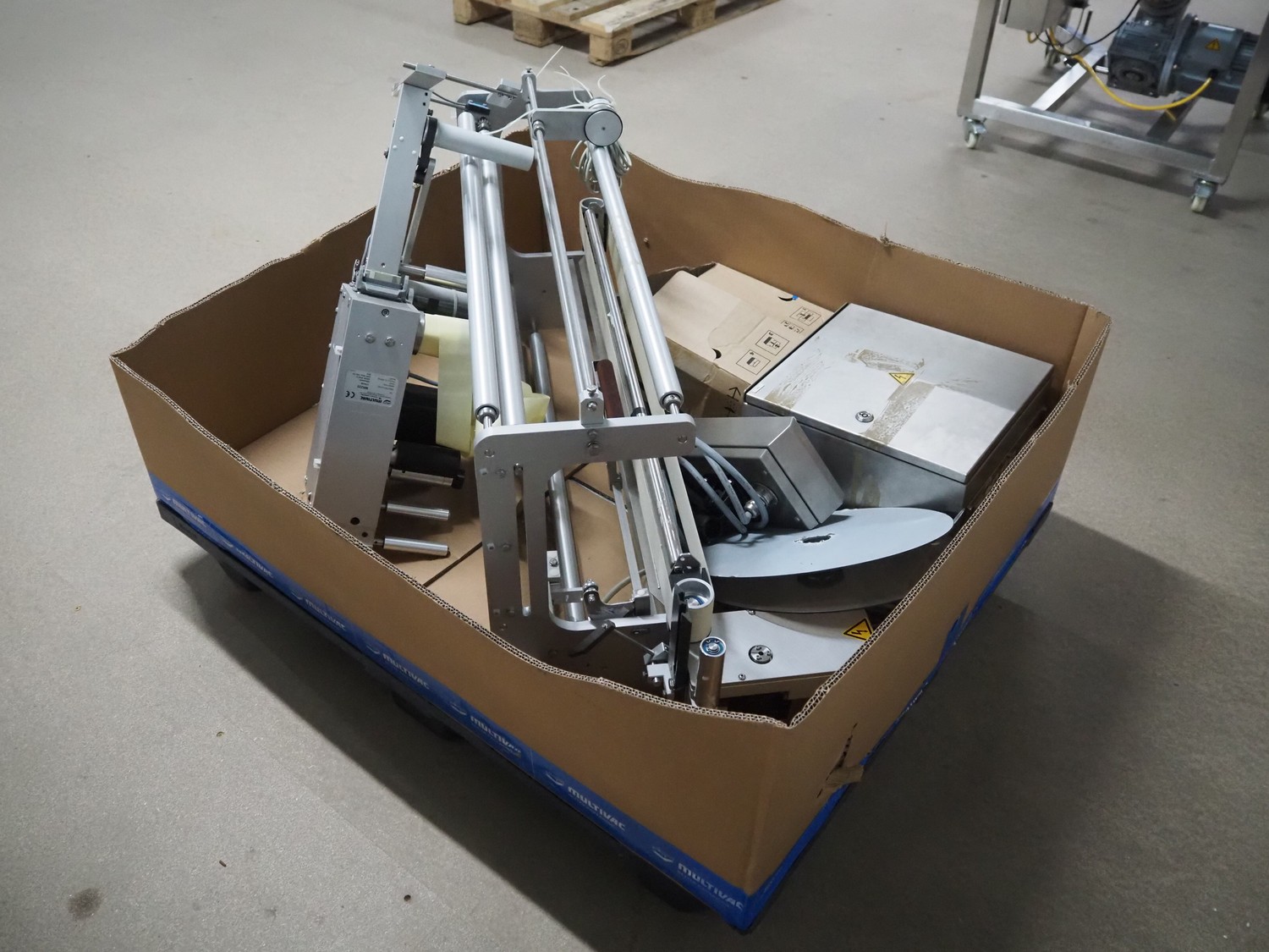 Pallet with Multivac labelling parts for thermoformer, type: MR233 & MR 4212, dimensions: 1200 mm x 1000 mm x 500 mm.