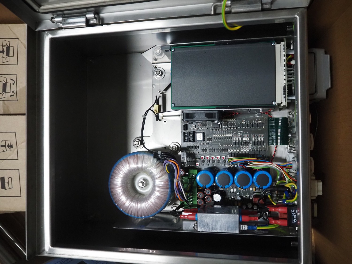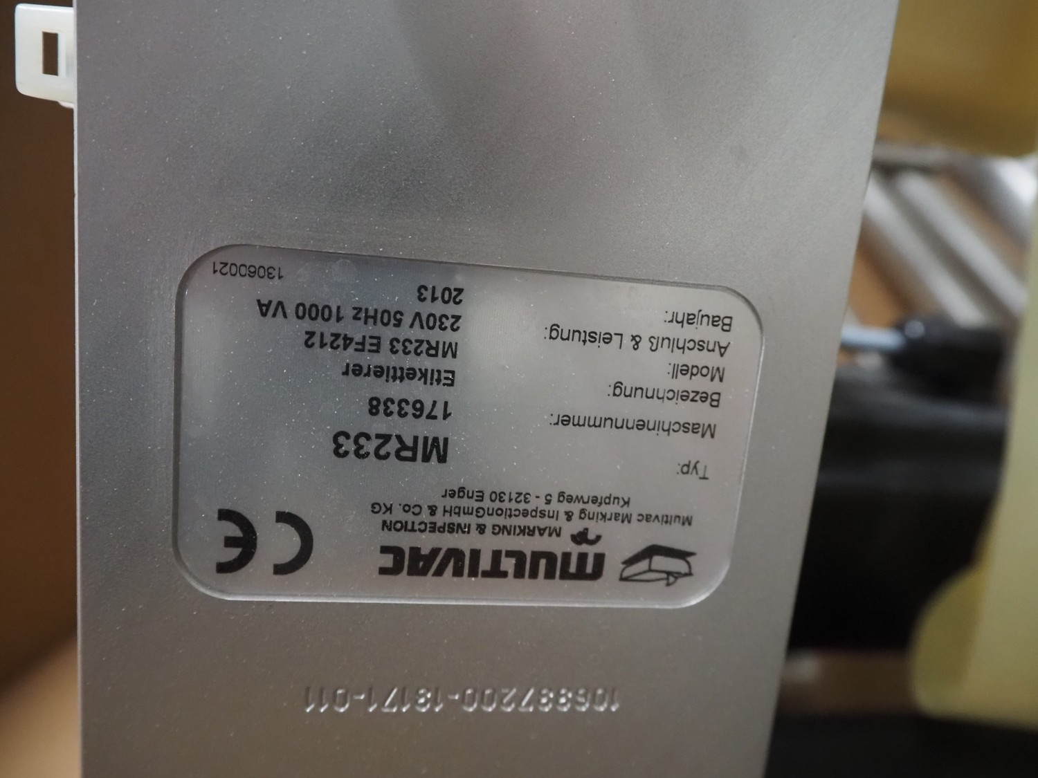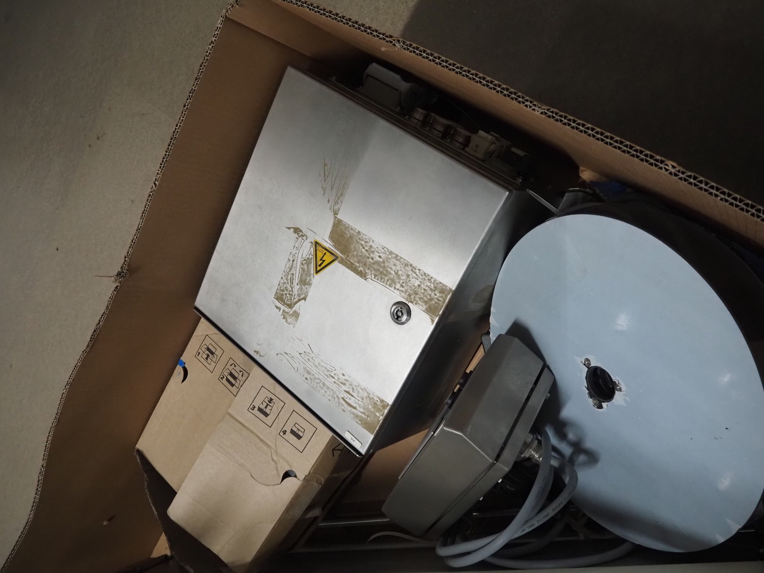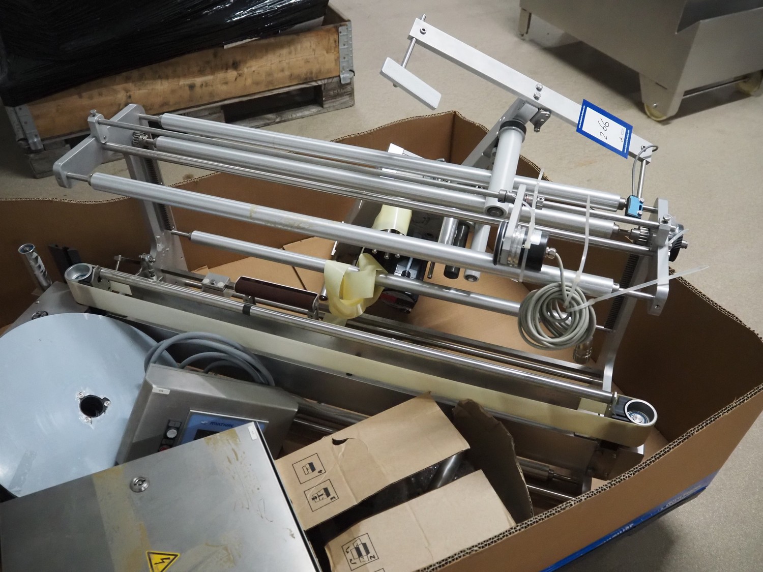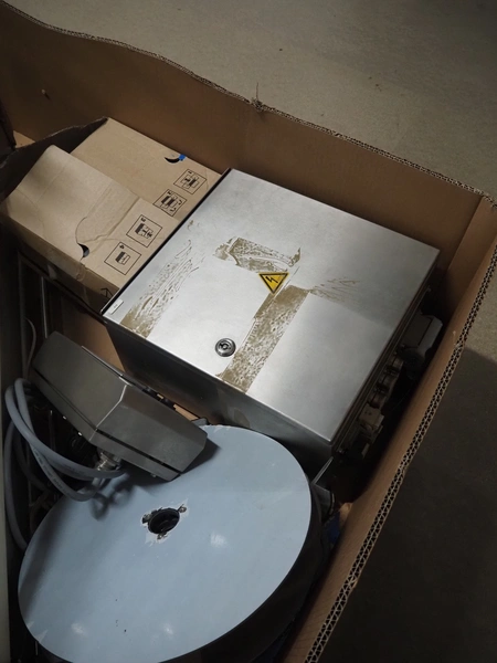Pallet with Multivac labelling parts for thermoformer, type: MR233 & MR 4212, dimensions: 1200 mm x 1000 mm x 500 mm.