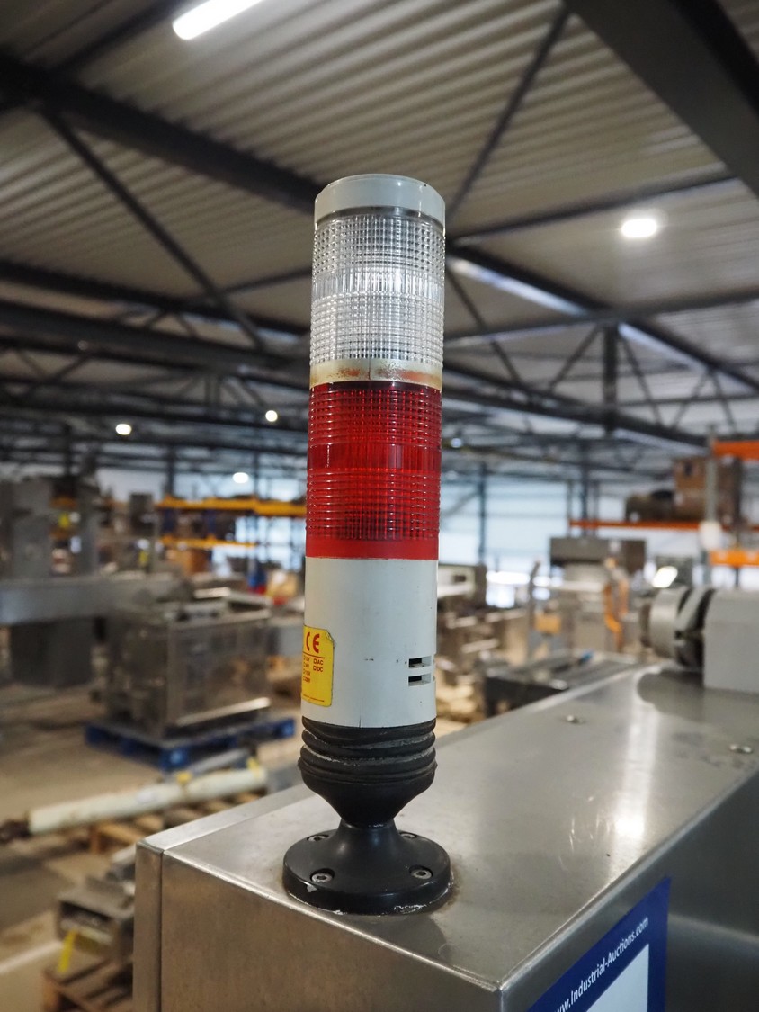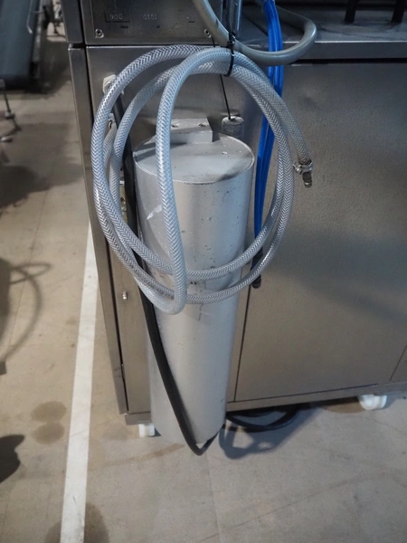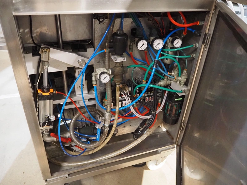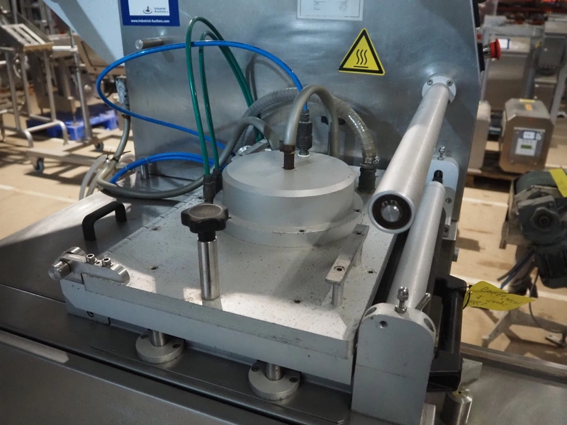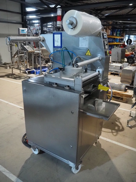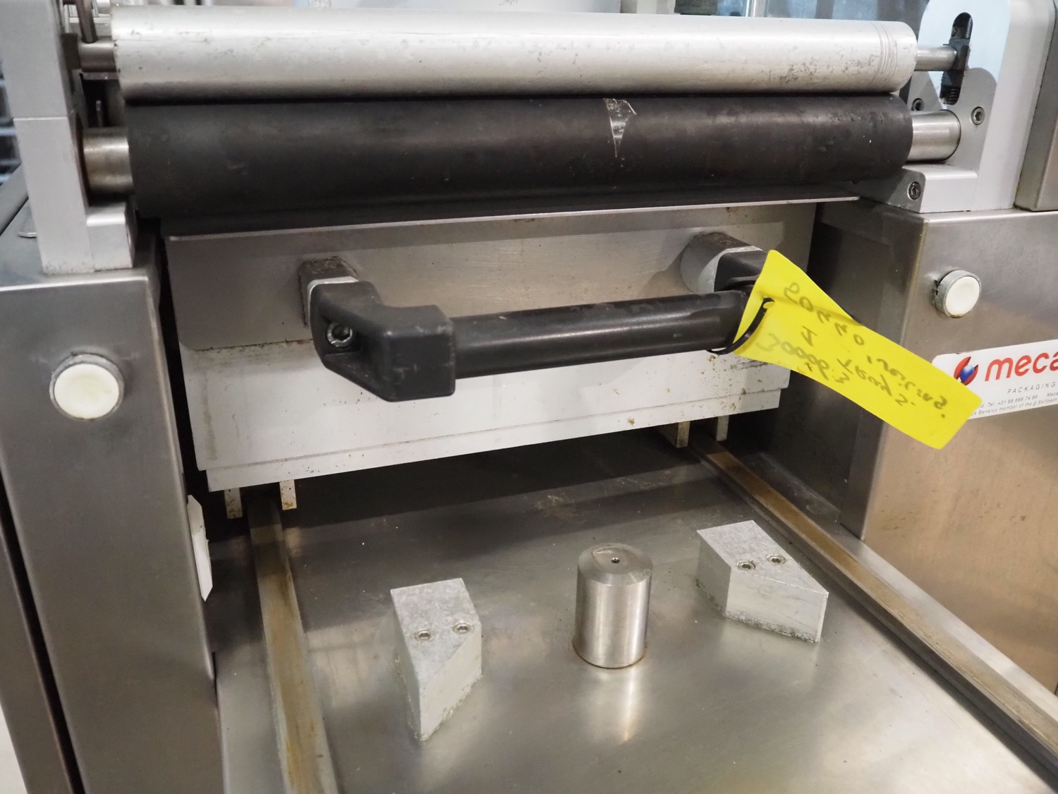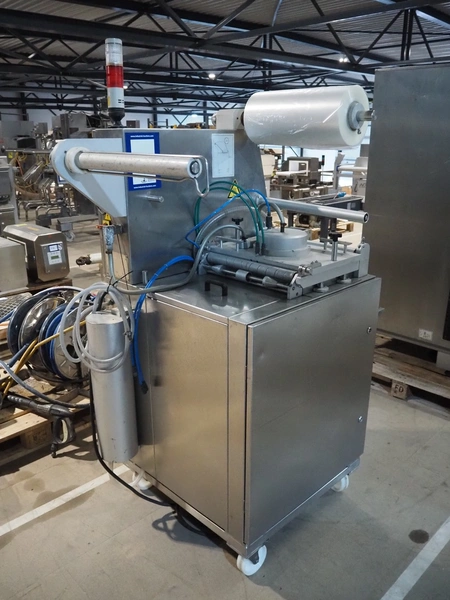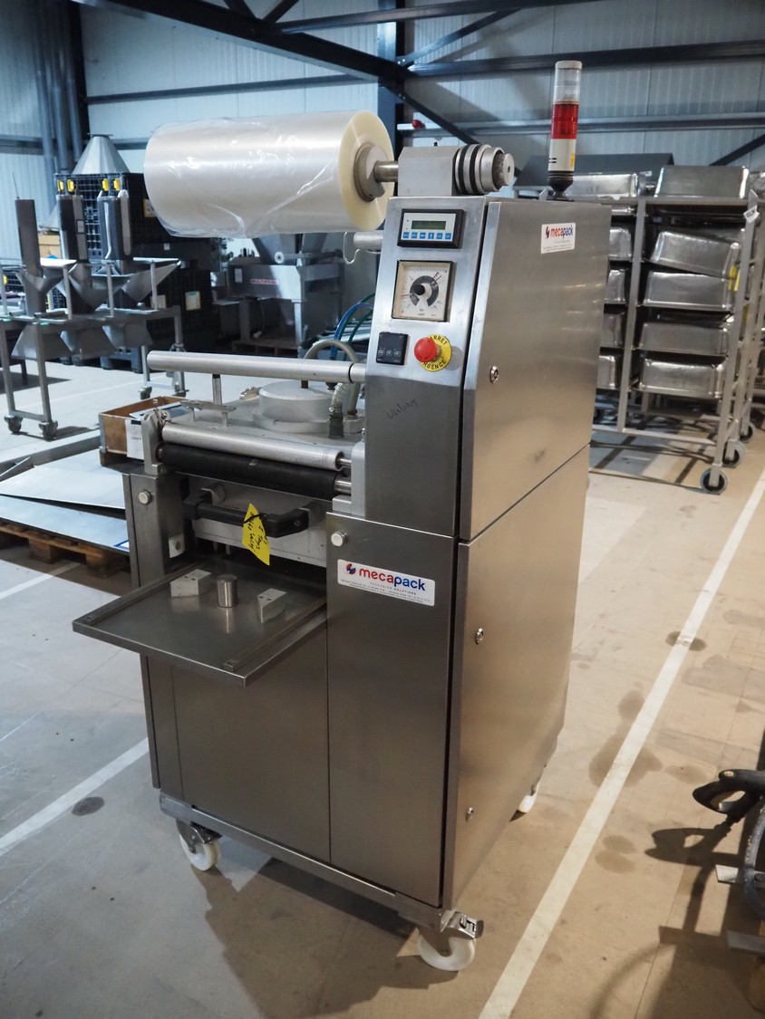 Mecapack mobile traysealer, model: 900, serial number: 0101, year of construction: 10-2000, film width: 430 mm, dimensions dye: Ø 180 mm, total dimensions: 1250 mm x 800 mm x 1860 mm.