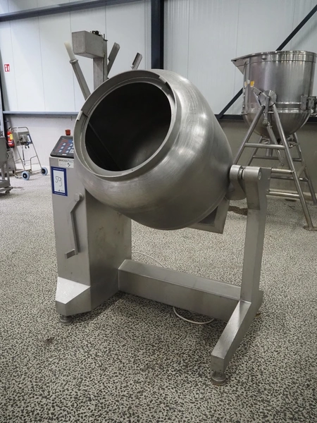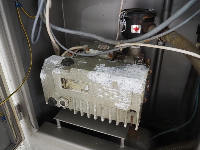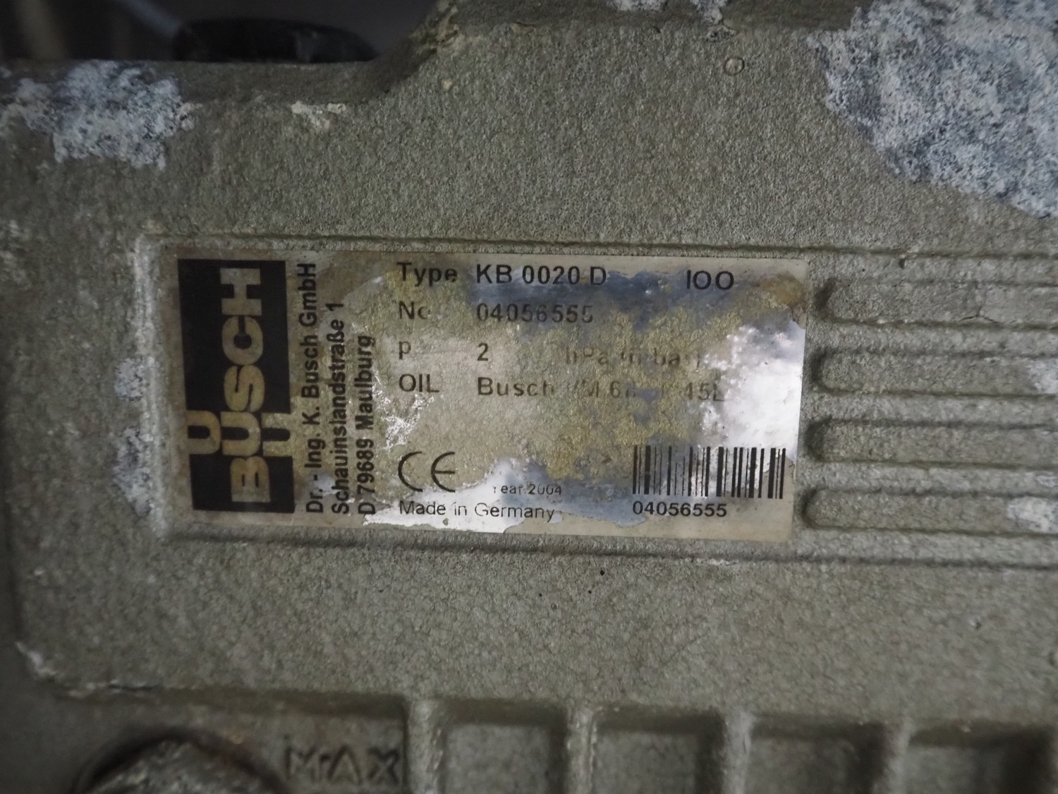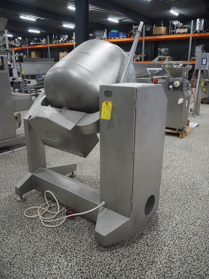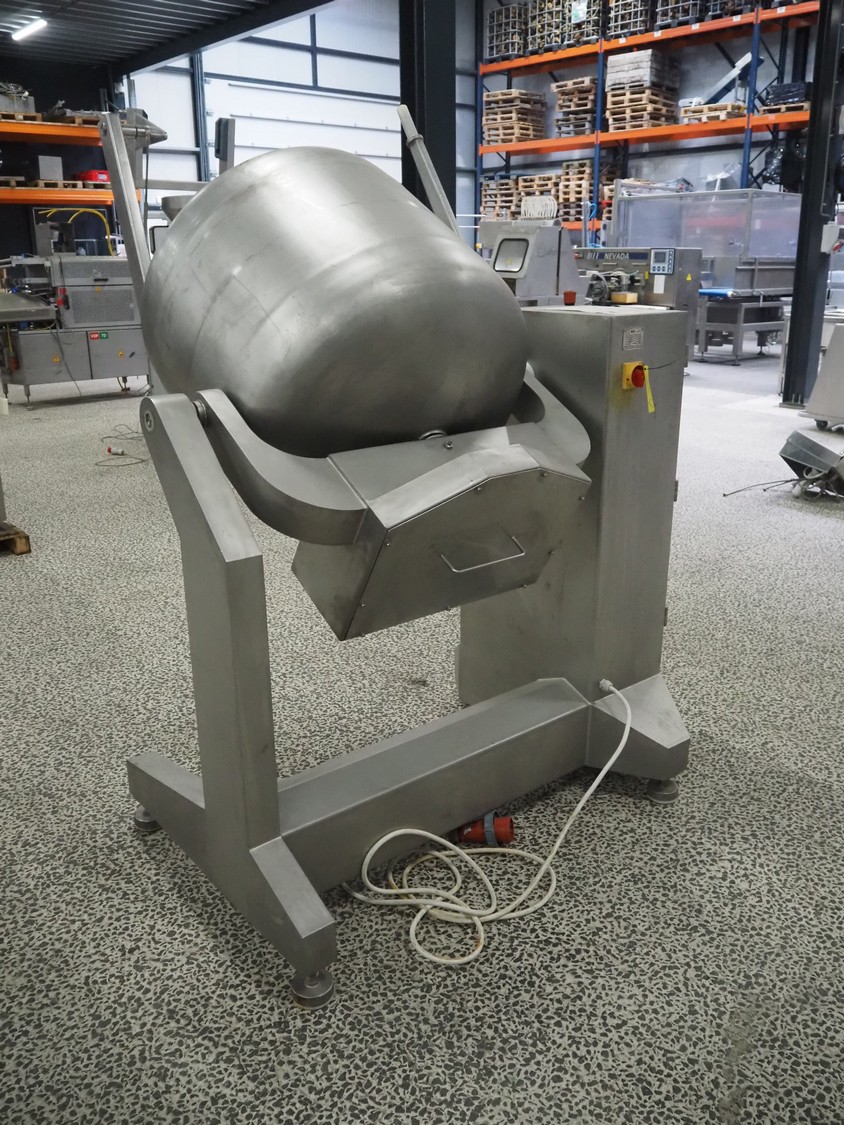 N&N vacuum tumbler, type: MV-300, number: 014, year of construction: 2005, 400 V, 50 Hz, 2 kW, weight: 320 kg, volume: 300 liter, Busch vacuum pump, type: KB 0020 D, year of construction: 2004, capacity: 20 m³ per hour, dimensions: 1430 mm x 1180 mm x 1890 mm. Incomplete, missing lid.