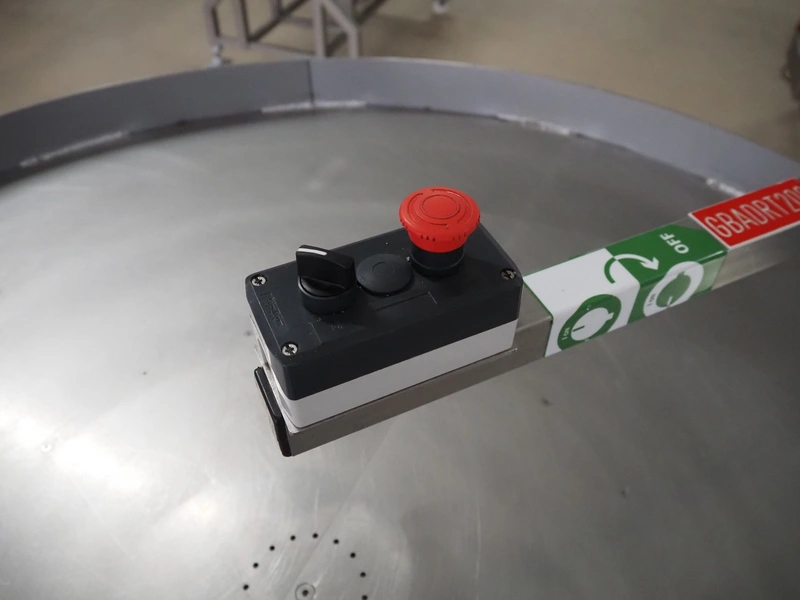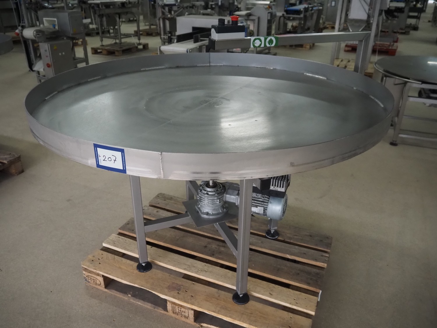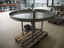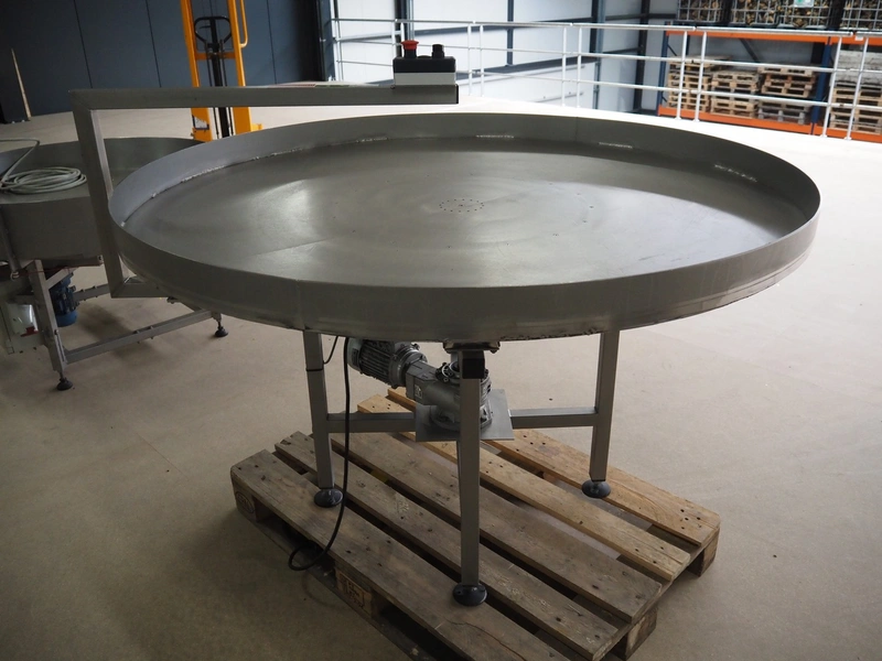 S/s turning table, s/s top, diameter top: 1500 mm, total dimensions: 1600 mm x 1510 mm x 1200 mm.