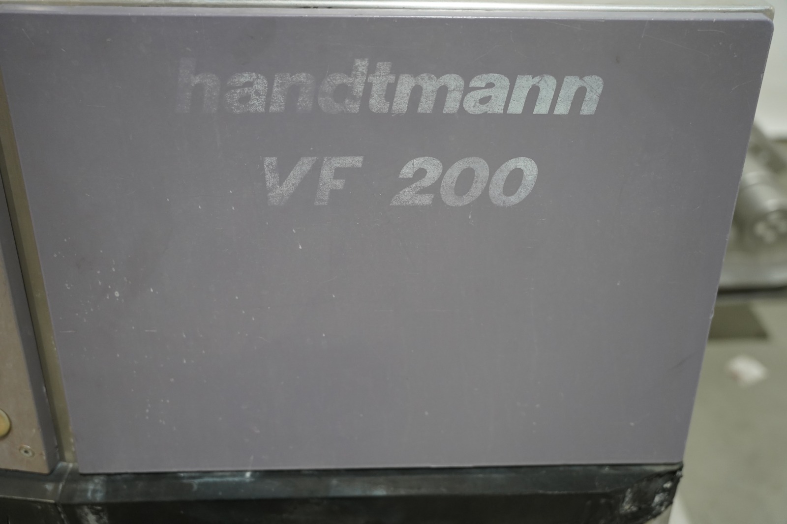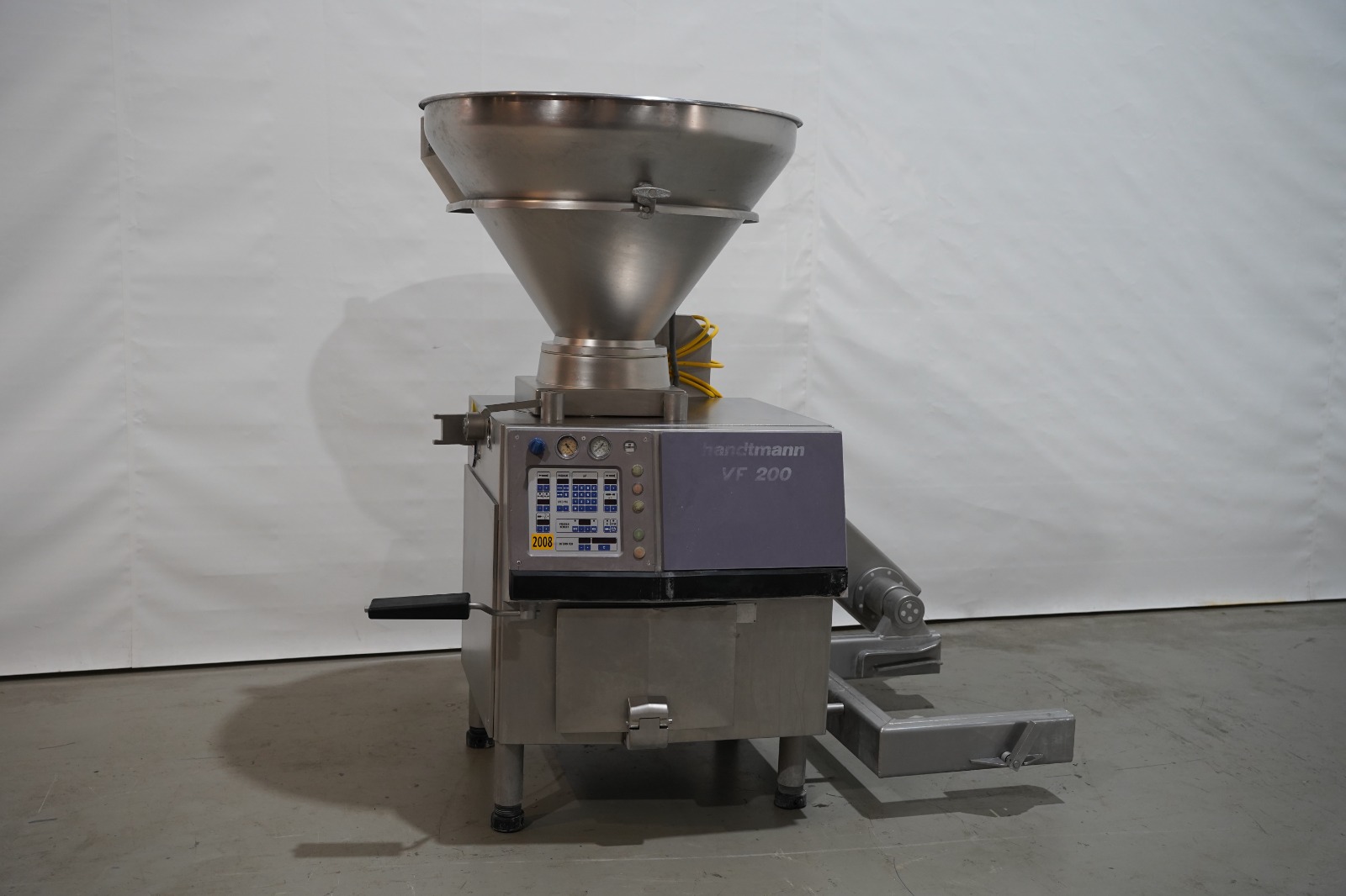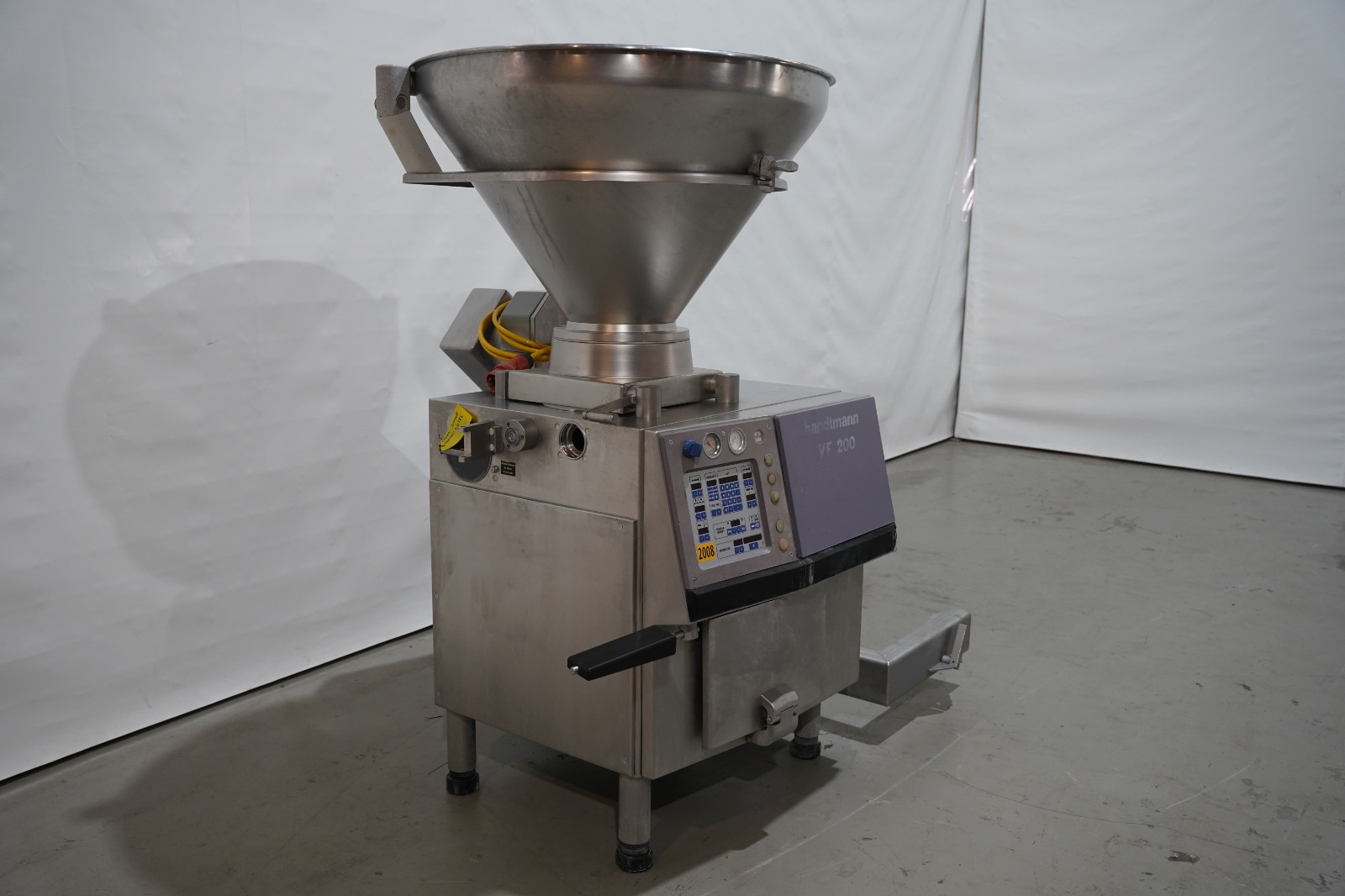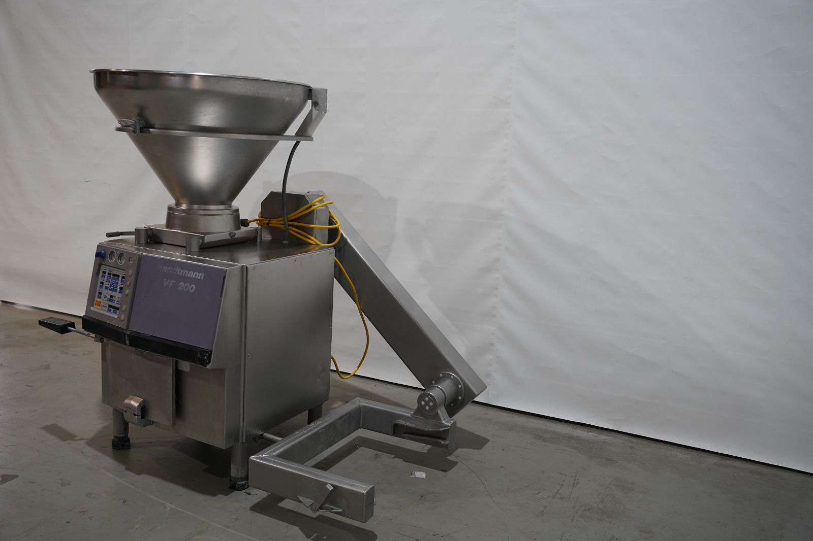 Handtmann vacuum filling machine with lifter for 200 liter meat bins, type: VF 200, dimensions: 2000 mm x 1035 mm x 1900 mm.