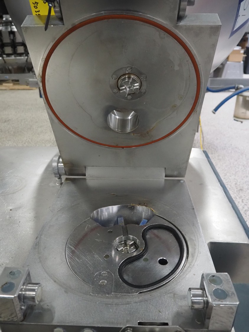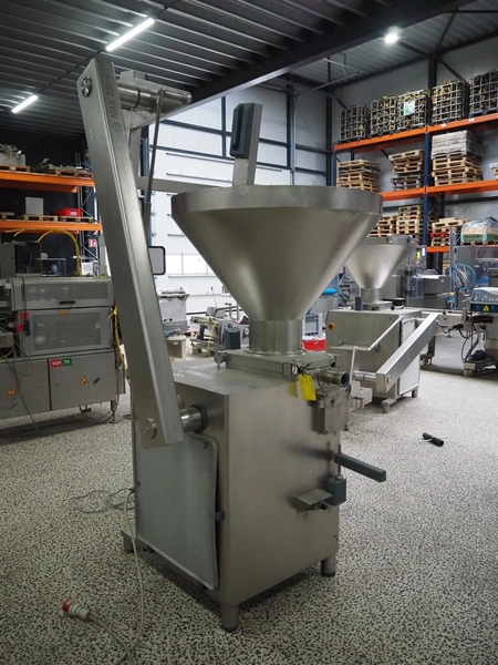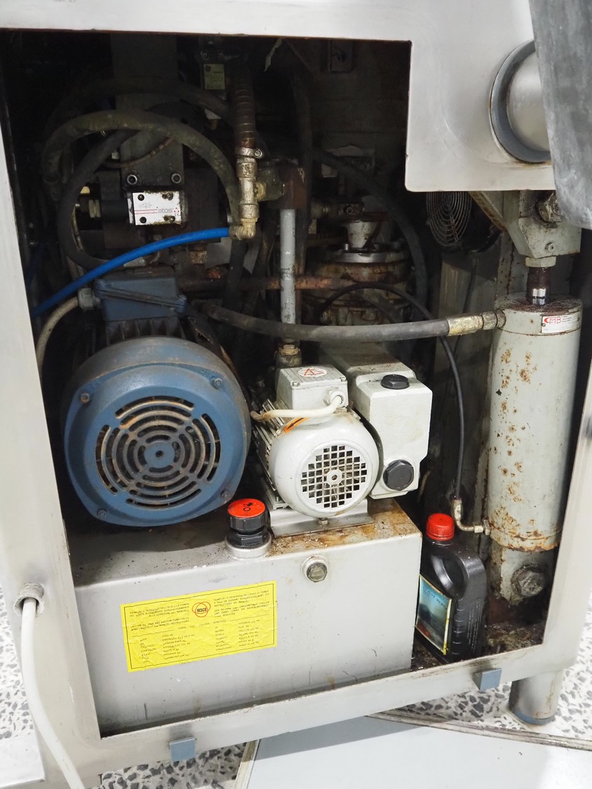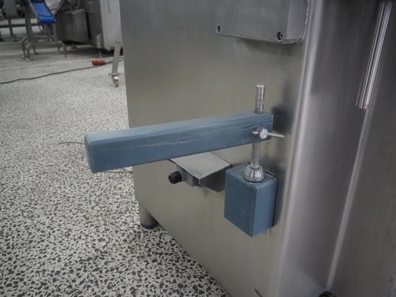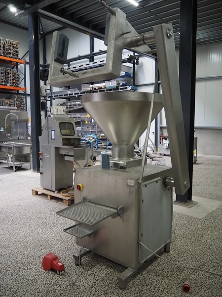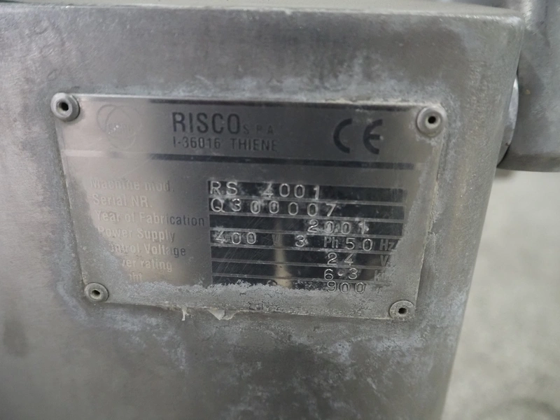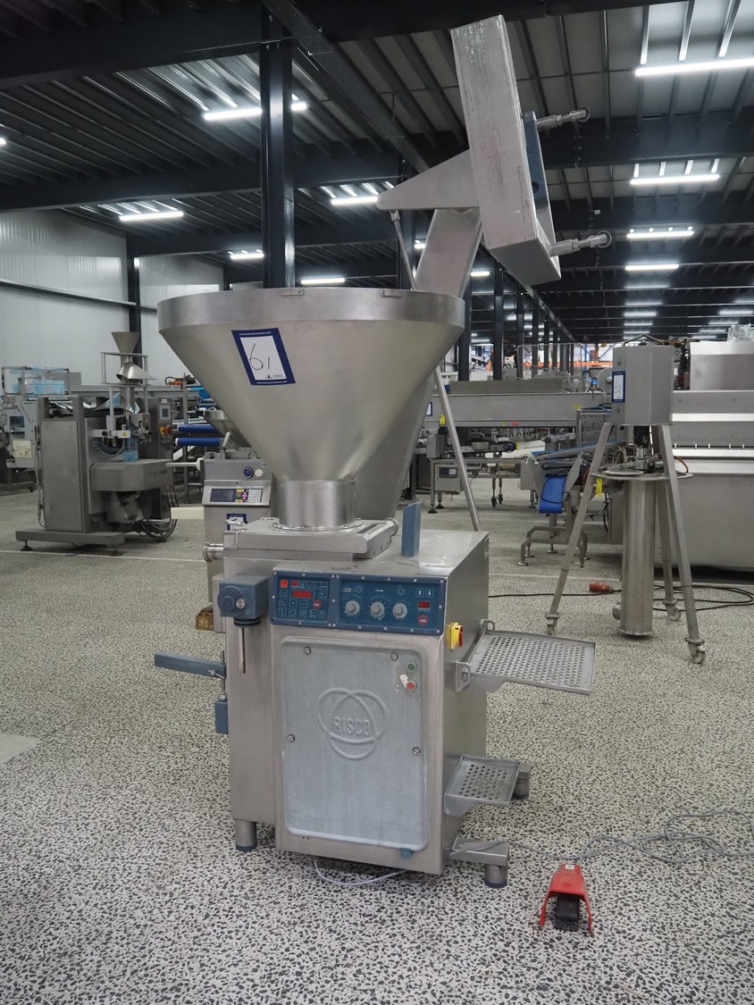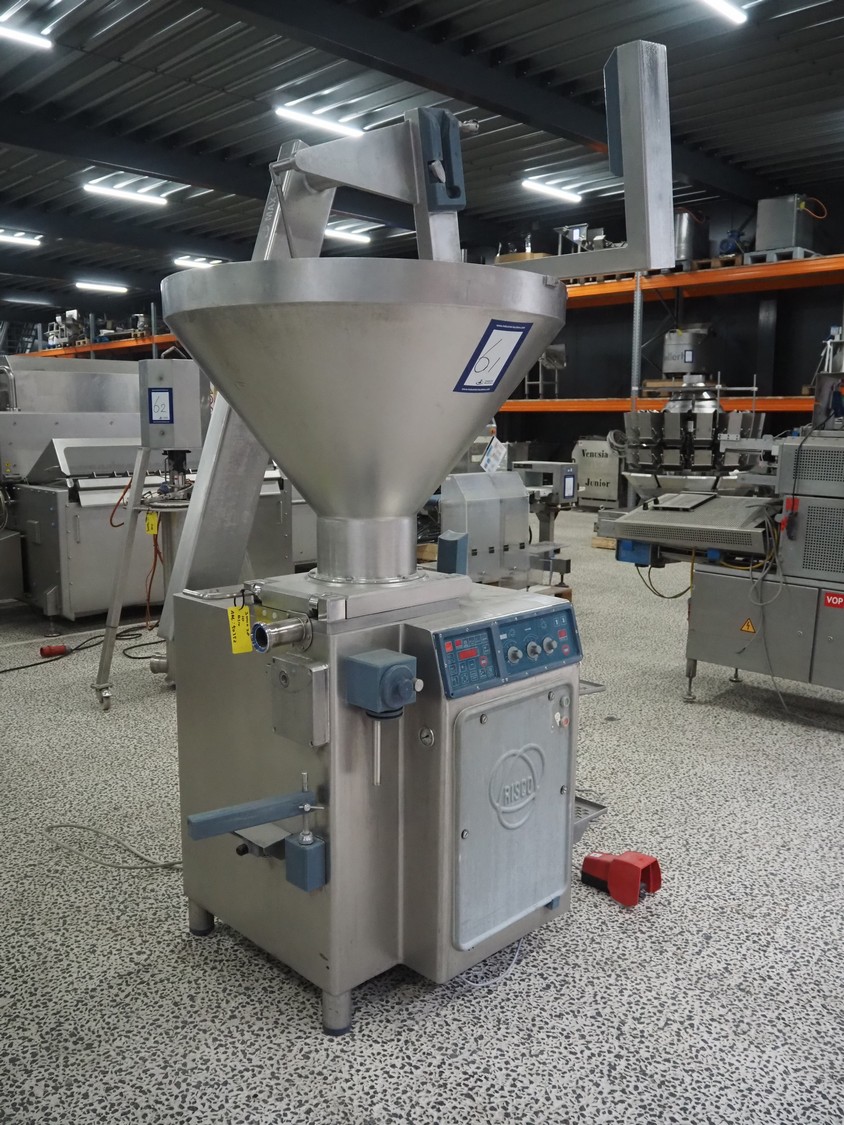 Risco S.P.A. vacuum filling machine with lifter for 200 liter meat bins, model: RS 4001, serial number: Q300007, year of construction: 2001, 400 V, 3 Ph, 50 Hz, 6.3 kW, Busch vacuum pump, dimensions: 1350 mm x 1350 mm x 2650 mm.