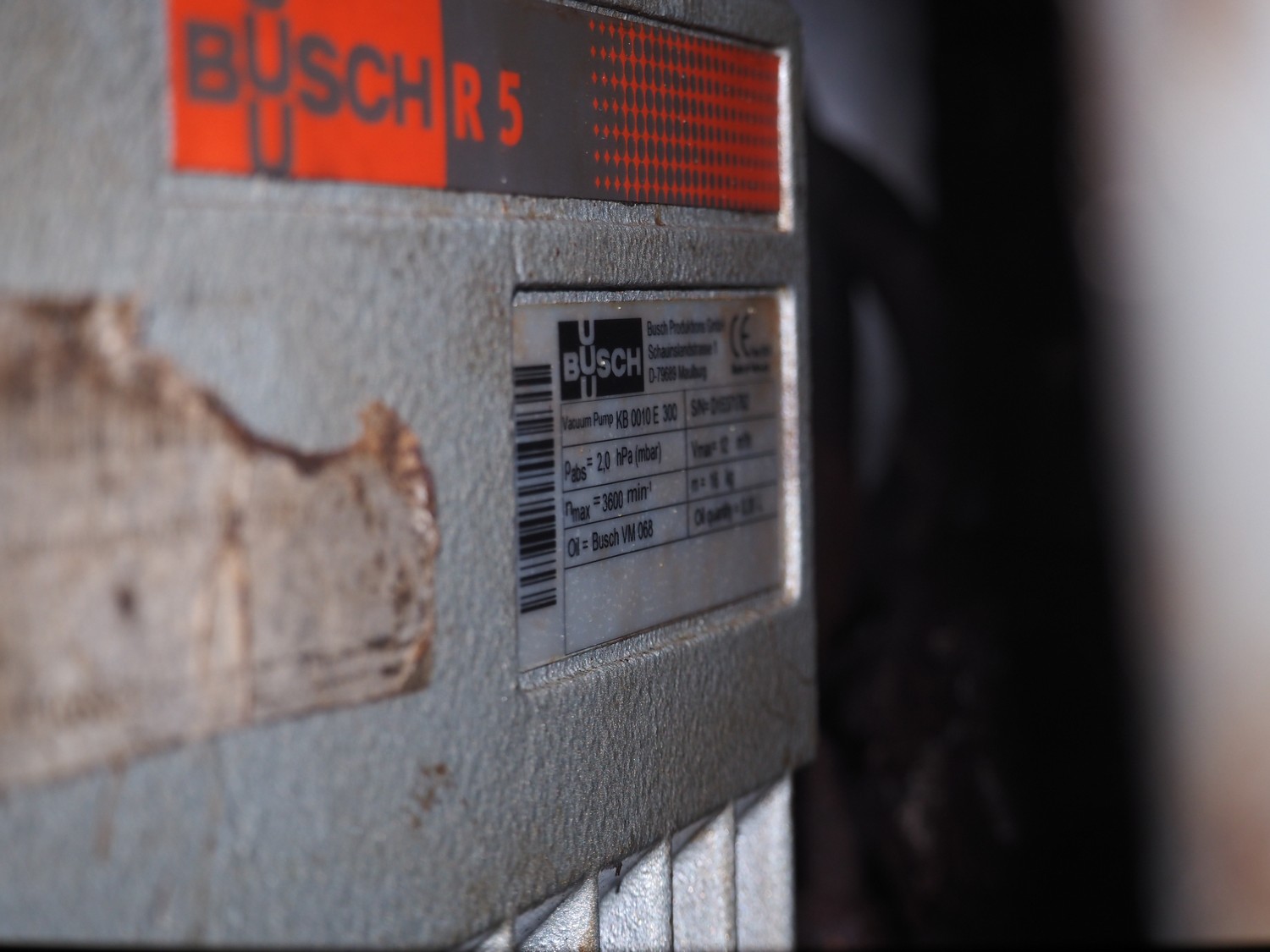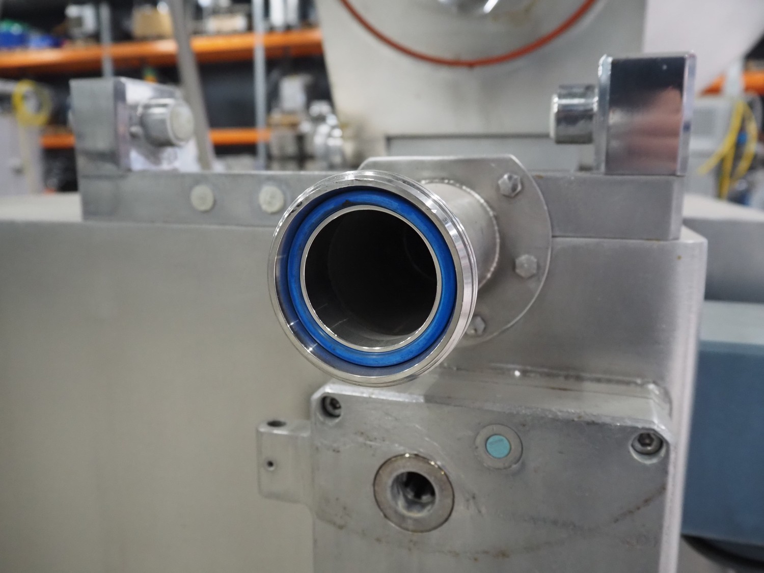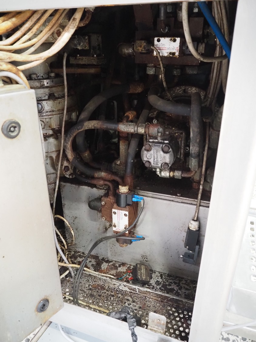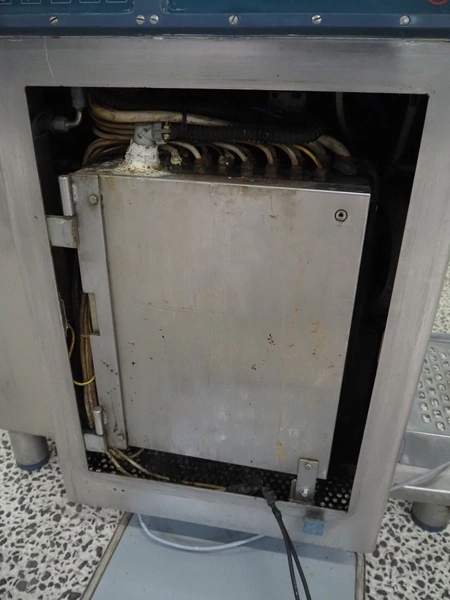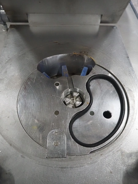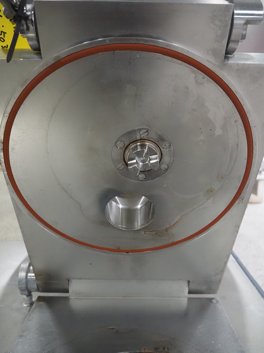 Risco S.P.A. vacuum filling machine with lifter for 200 liter meat bins, model: RS 4001, serial number: Q300007, year of construction: 2001, 400 V, 3 Ph, 50 Hz, 6.3 kW, Busch vacuum pump, dimensions: 1350 mm x 1350 mm x 2650 mm.