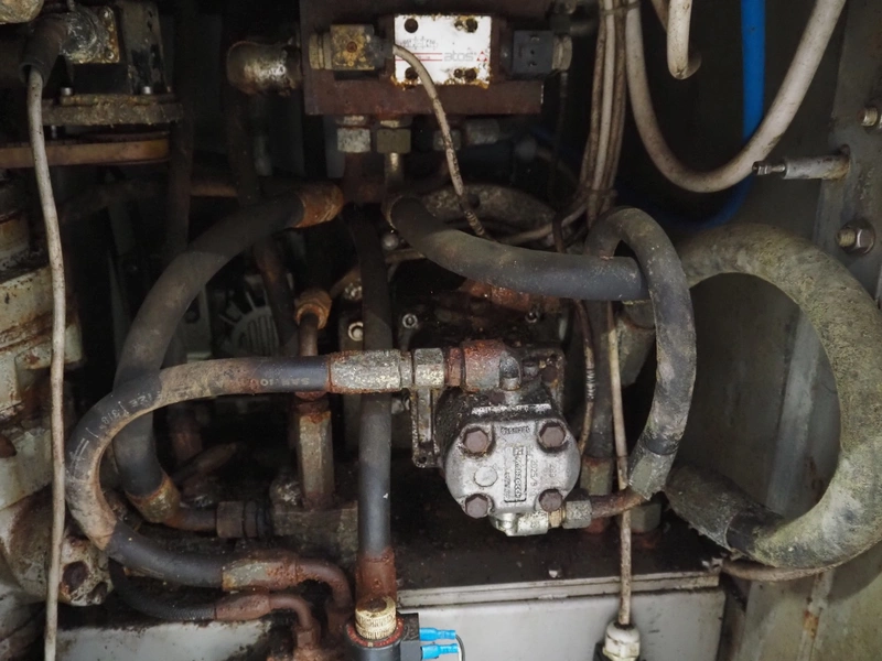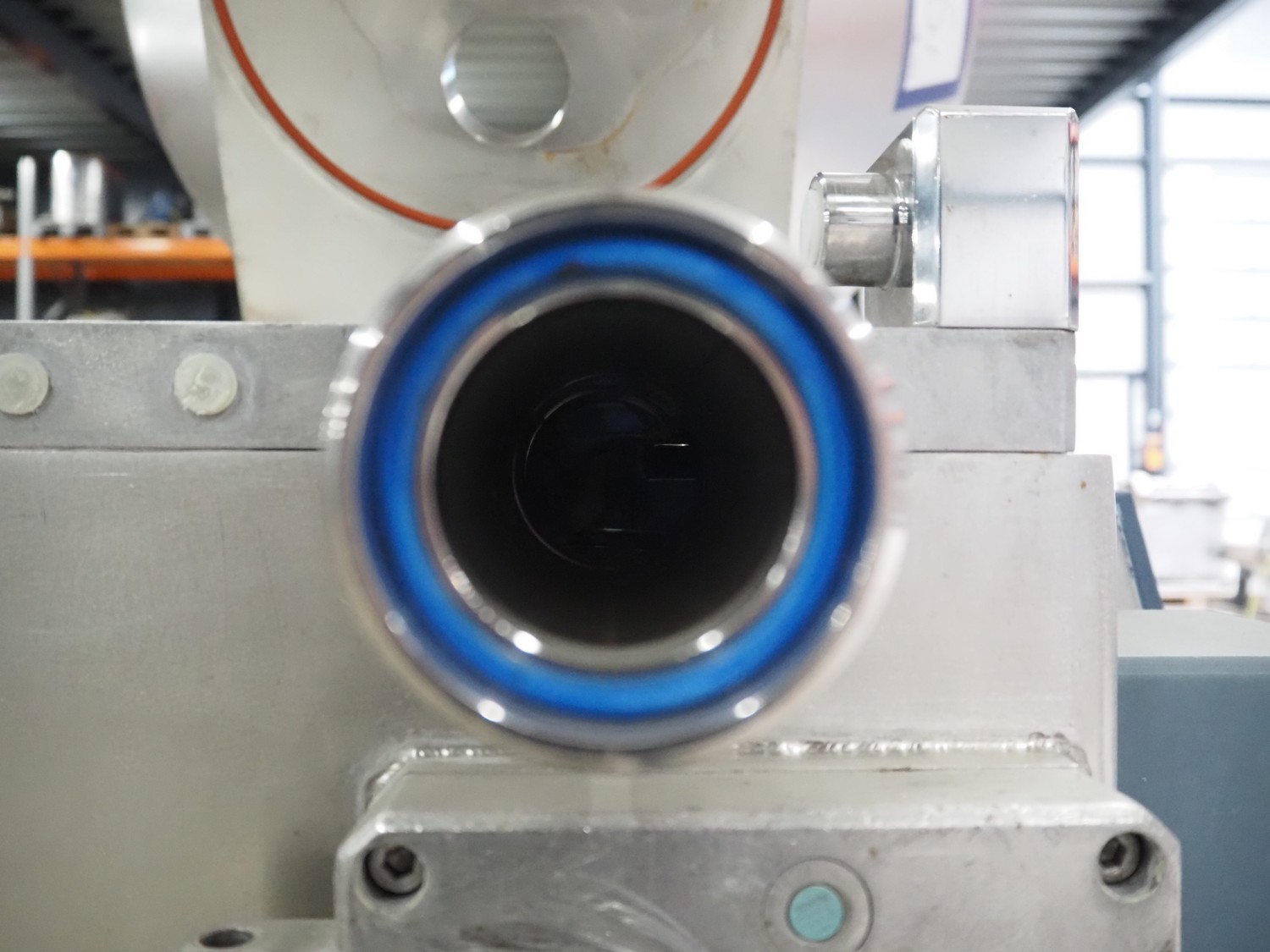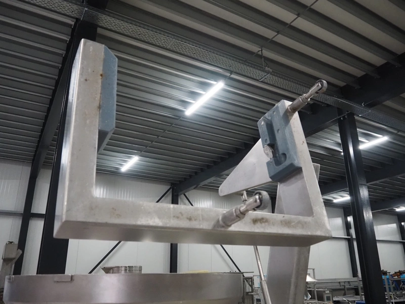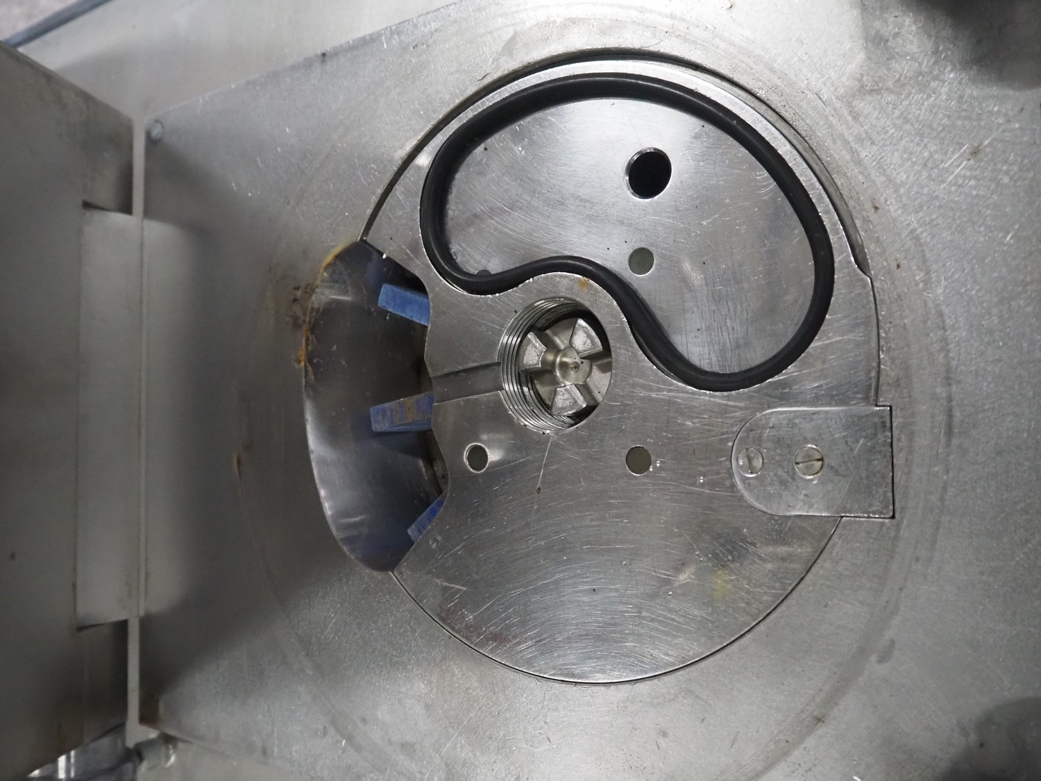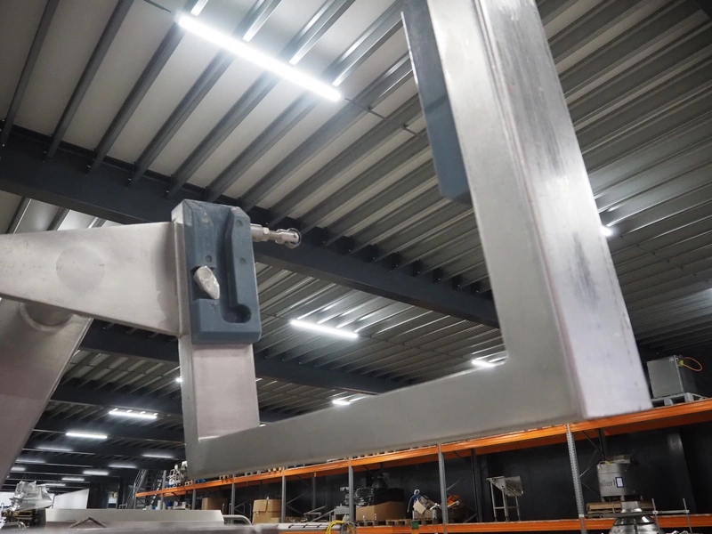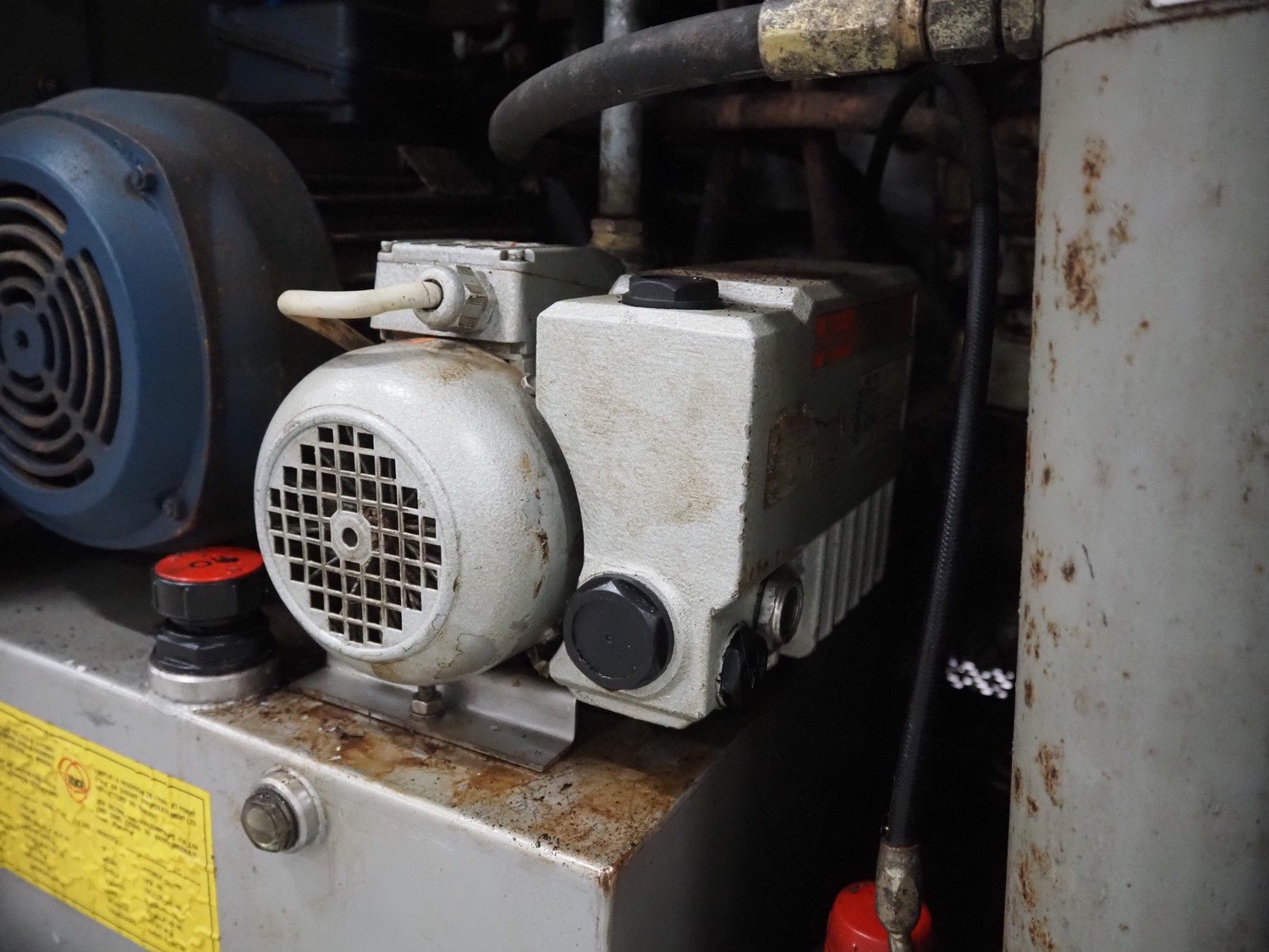 Risco S.P.A. vacuum filling machine with lifter for 200 liter meat bins, model: RS 4001, serial number: Q300007, year of construction: 2001, 400 V, 3 Ph, 50 Hz, 6.3 kW, Busch vacuum pump, dimensions: 1350 mm x 1350 mm x 2650 mm.
