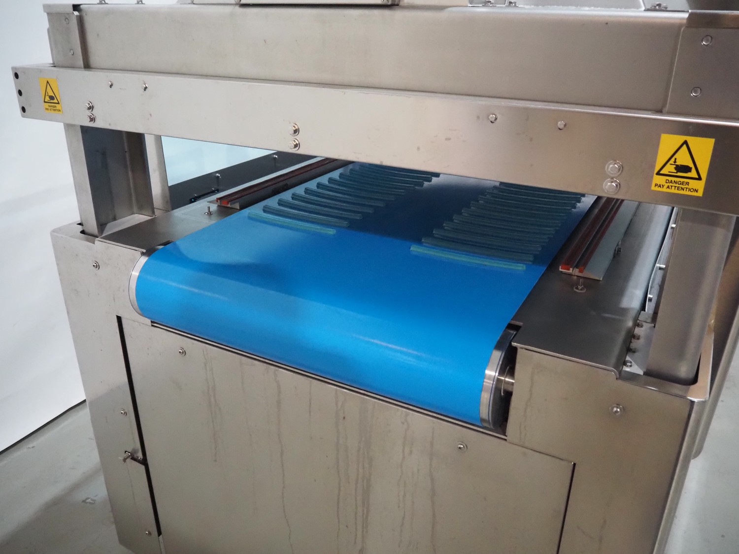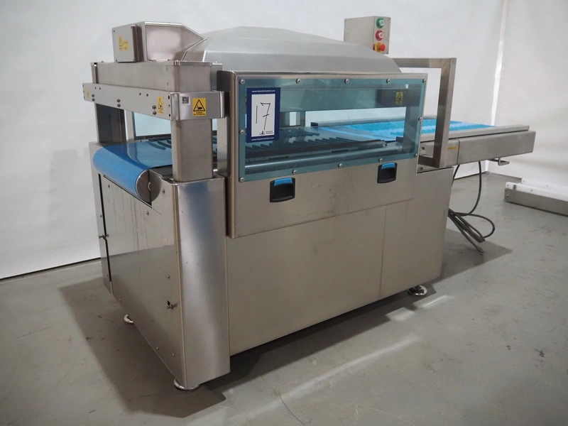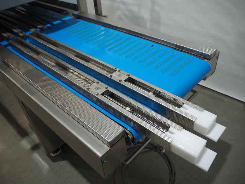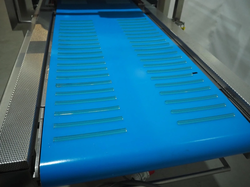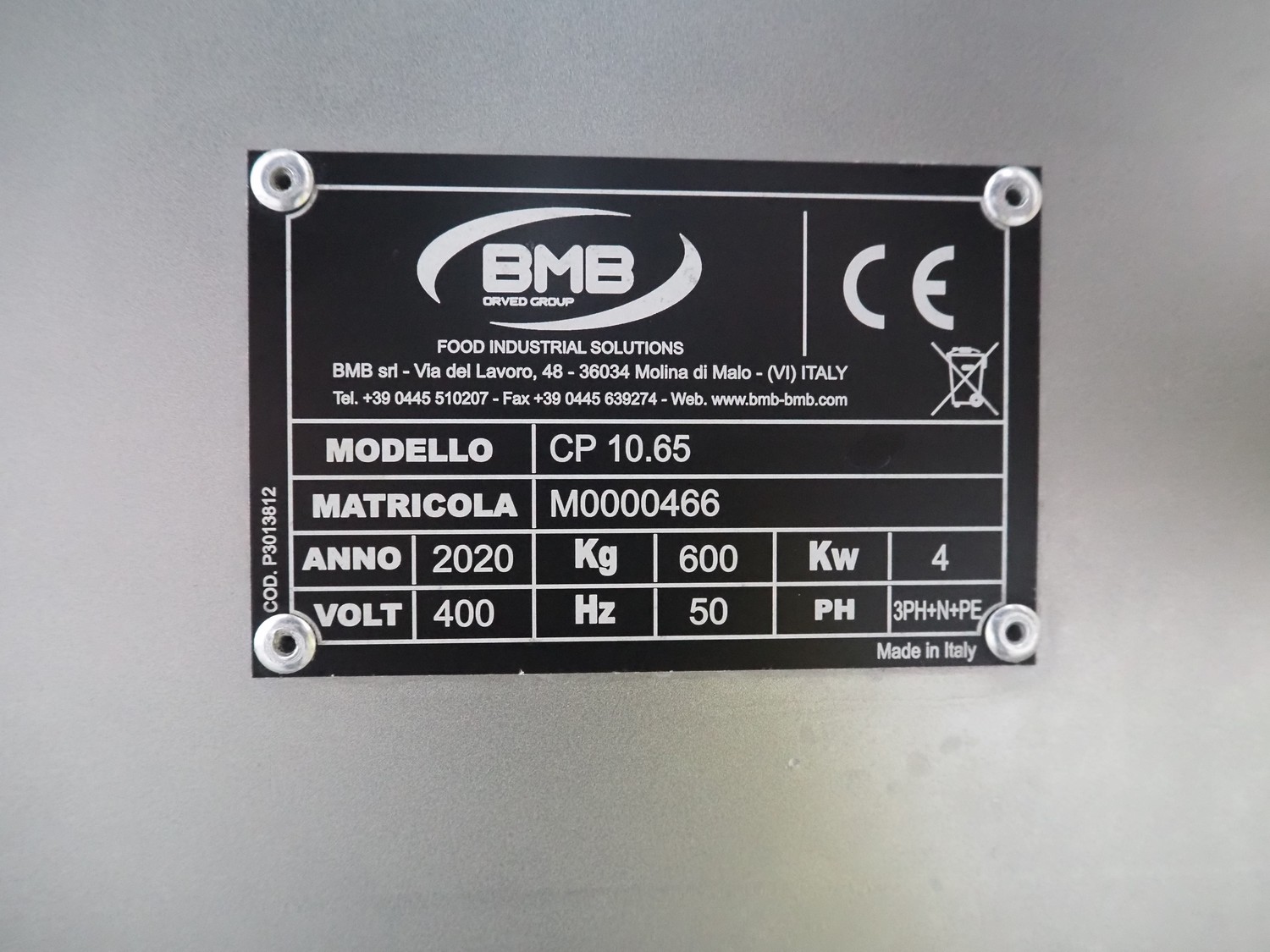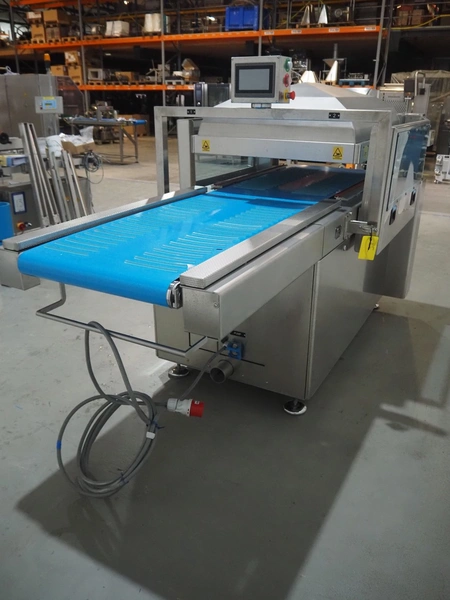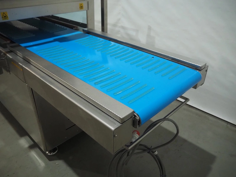 BMB belt vacuum machine, model: CP 10.65, serial number: M0000466, year of construction: 2020, 400 V, 3 Ph, 50 Hz, 4 kW, weight: 600 kg, plastic belt with dividers, belt width: 620 mm, divider height: 8 mm, distance between divider: 40 mm, seal length: (2x) 1010 mm, total dimensions: 2670 mm x 1230 mm x 1670 mm. Without vacuum pump.