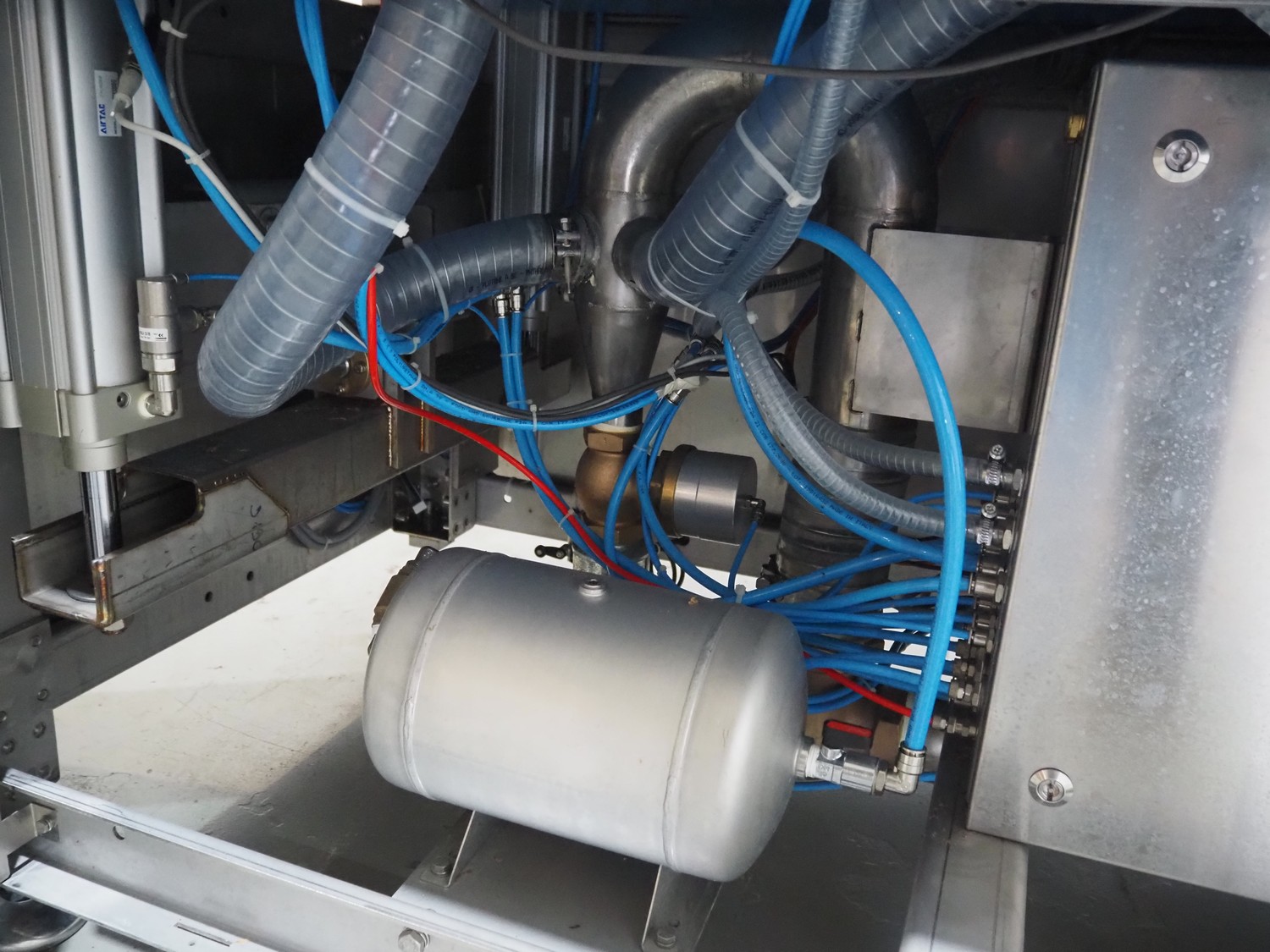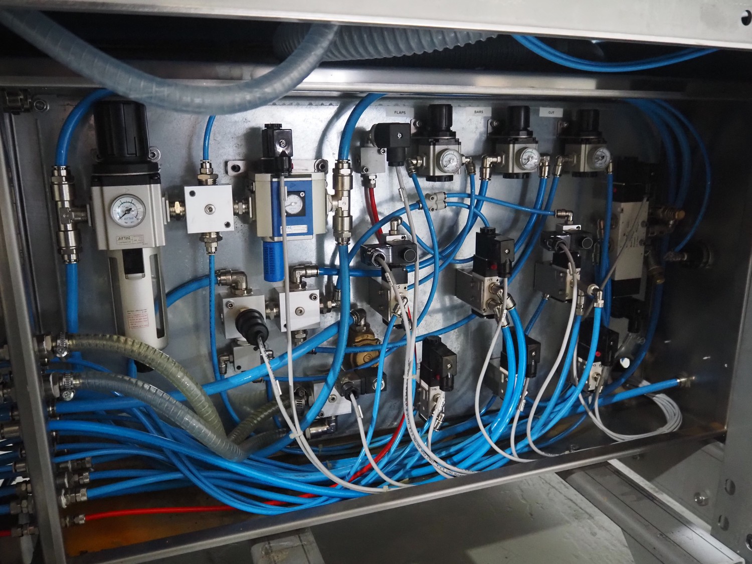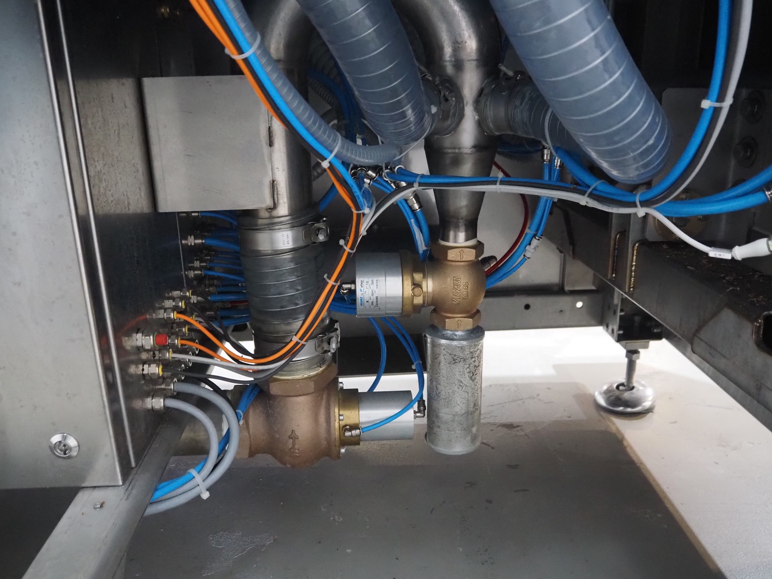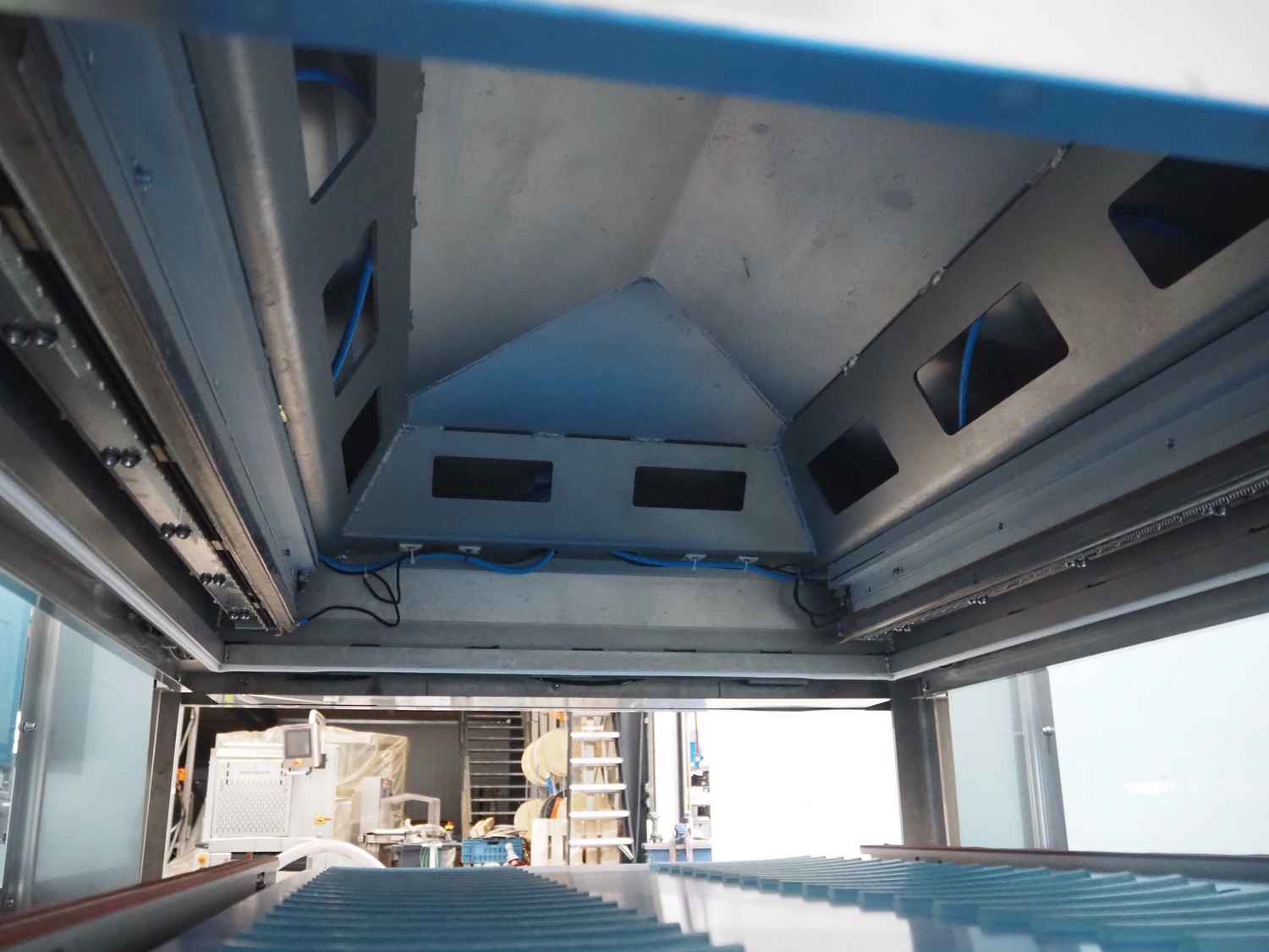 BMB belt vacuum machine, model: CP 10.65, serial number: M0000466, year of construction: 2020, 400 V, 3 Ph, 50 Hz, 4 kW, weight: 600 kg, plastic belt with dividers, belt width: 620 mm, divider height: 8 mm, distance between divider: 40 mm, seal length: (2x) 1010 mm, total dimensions: 2670 mm x 1230 mm x 1670 mm. Without vacuum pump.