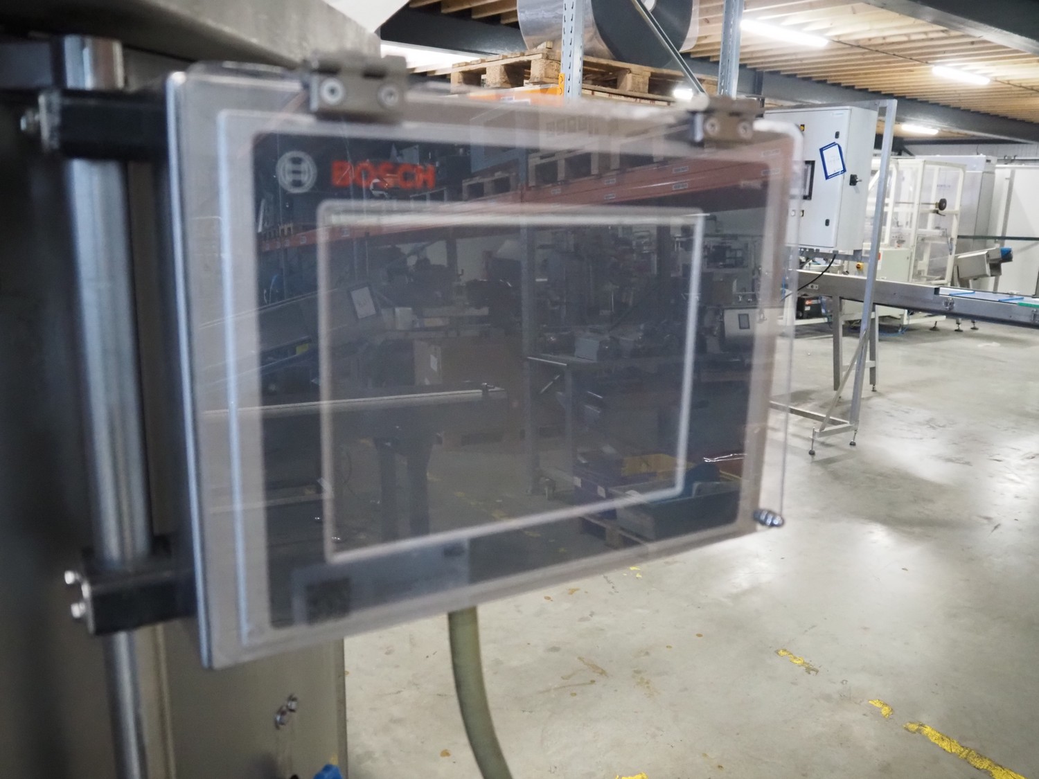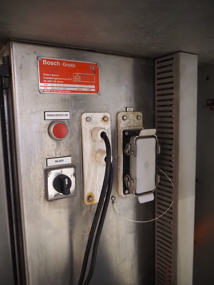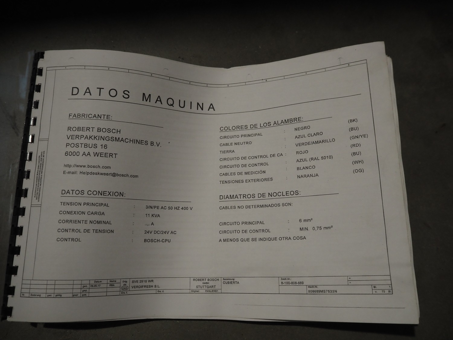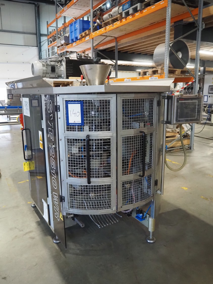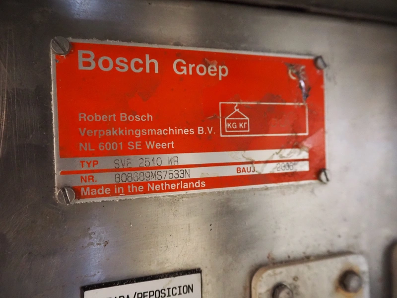 Bosch vertical bag form-, fill- and seal machine, type: SVE 2510 WR, number: 808689MS7533N, year of construction: 2006, film width: 443, diameter filling pipe: 115 mm, vertical seal length: 350 mm, horizontal seal length: 285 mm, total dimensions: 2550 mm x 1500 mm x 1800 mm. Including Garden Denver vacuum pump, type: V-VC 150 (20), capacity: 150 m³ per hour, dimensions: 800 mm x 450 mm x 300 mm.
