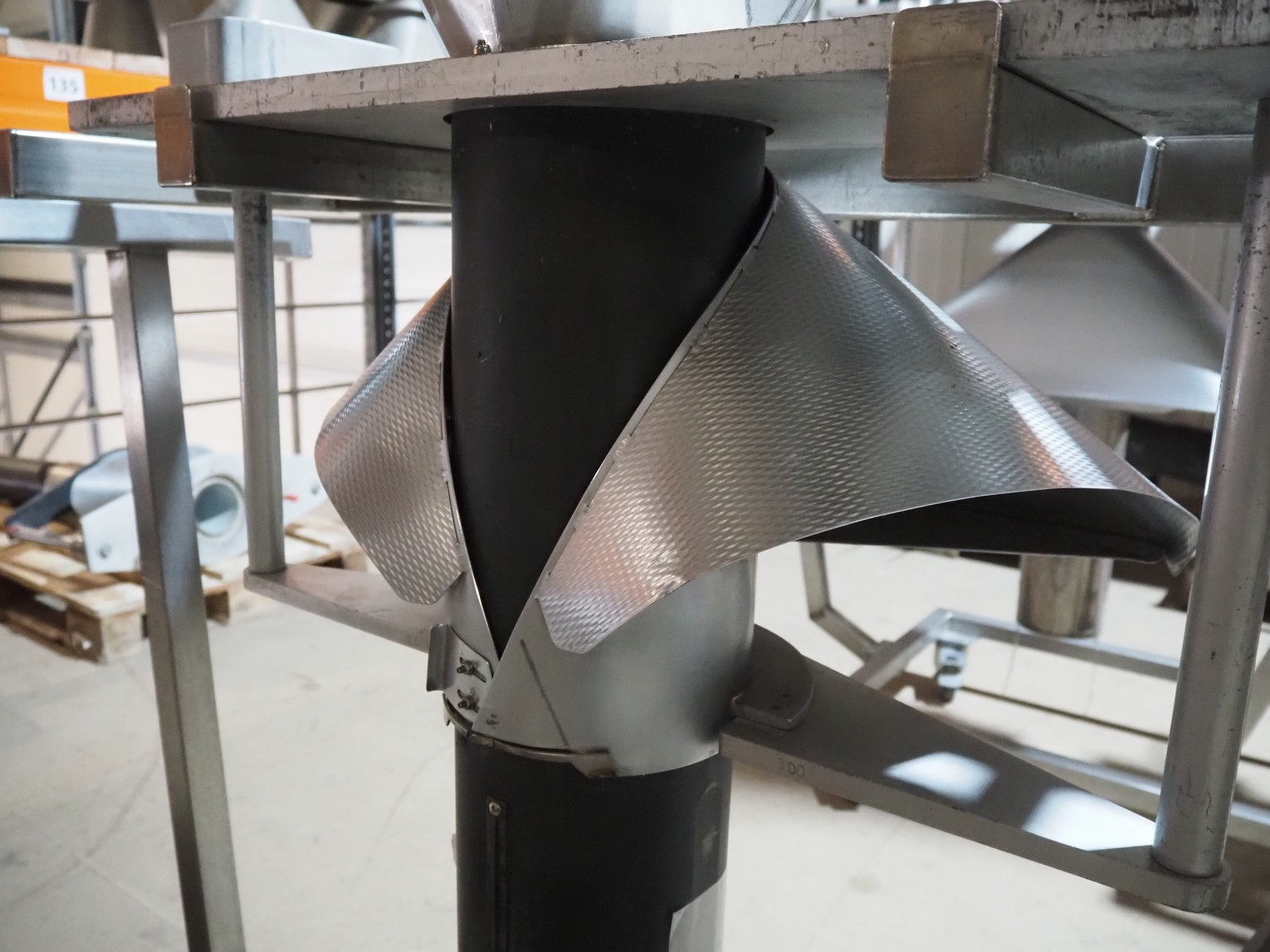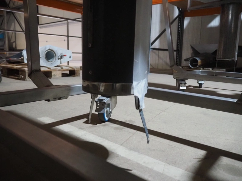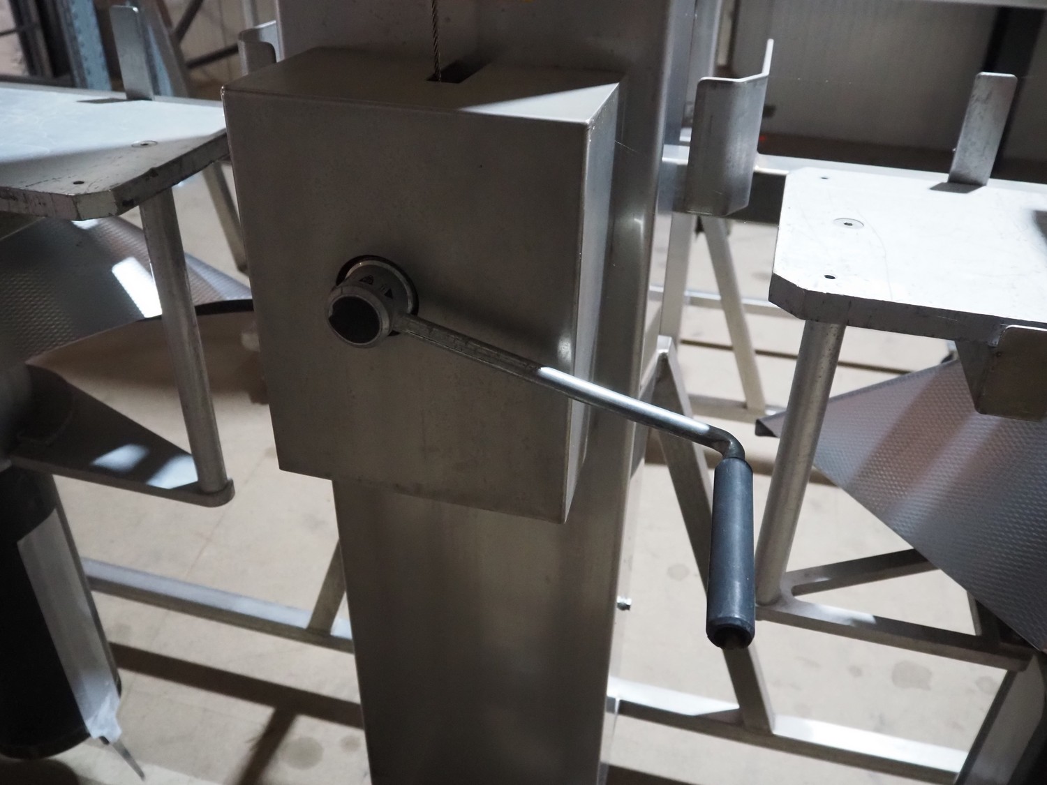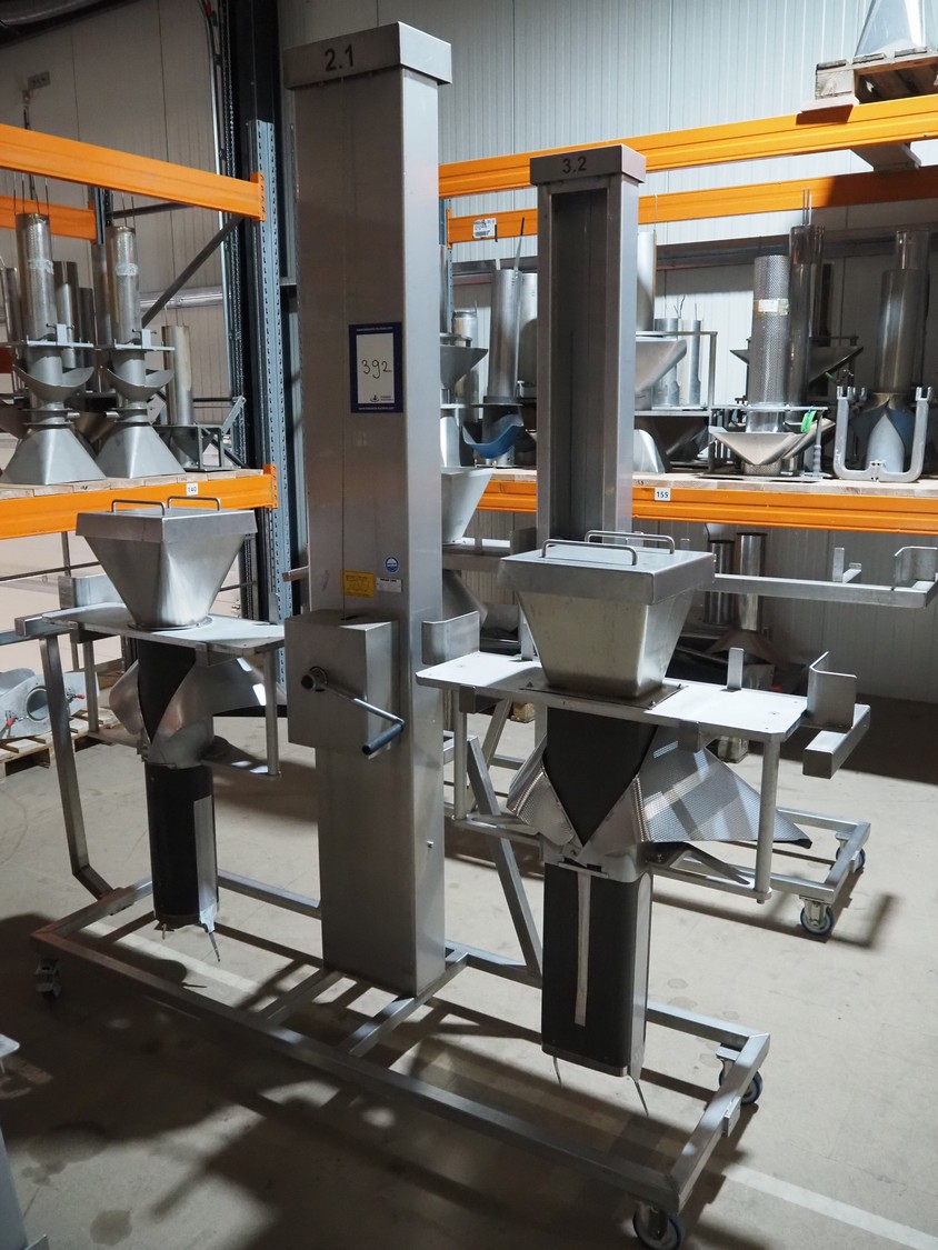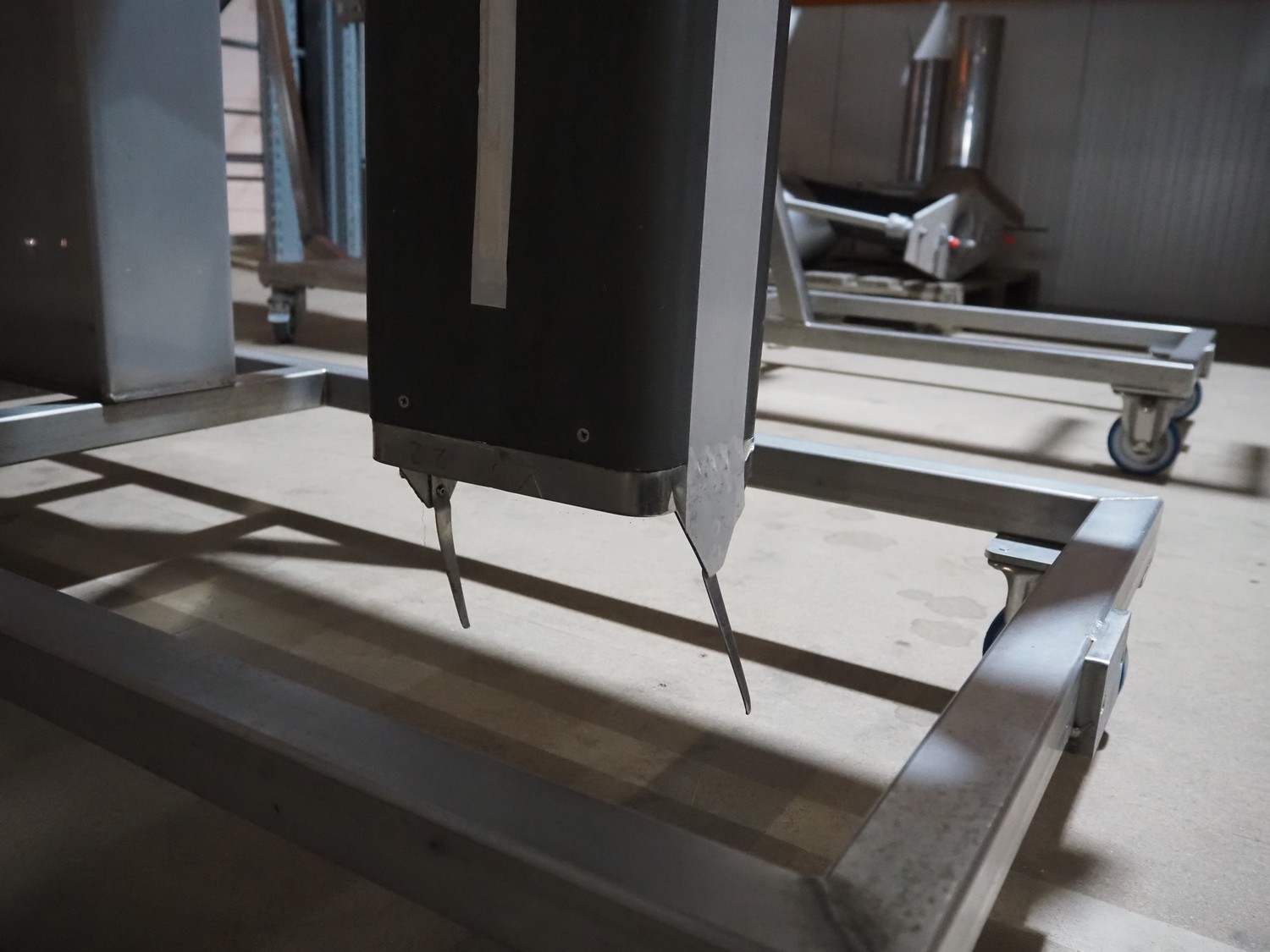 Mennens mobile lifter for filling pipes, dimensions: 2350 mm x 600 mm x 2380 mm. Including 2 filling pipes, clearance pipes: Ø 170 mm and 200 mm x 125 mm.