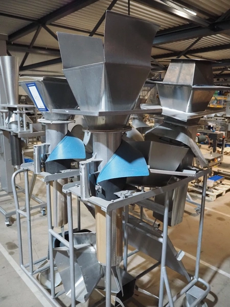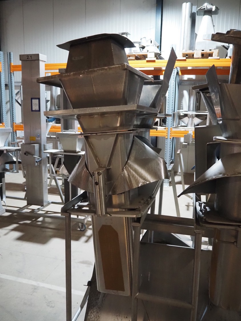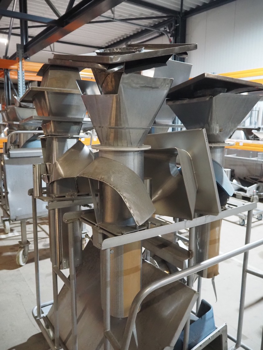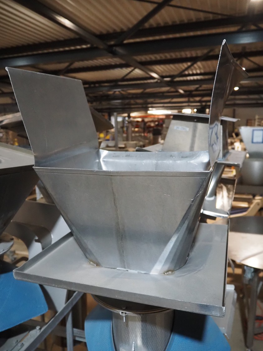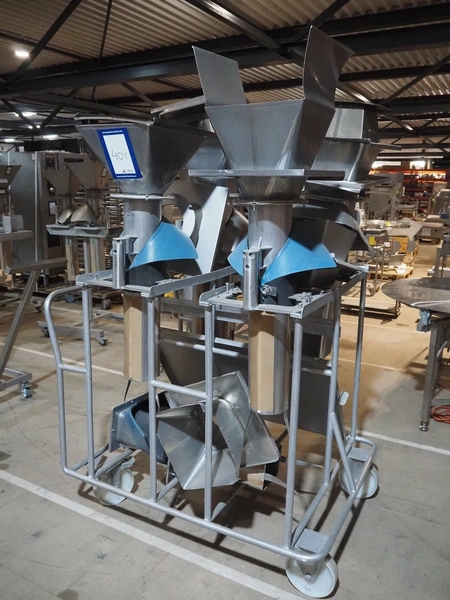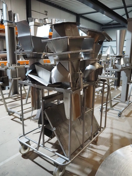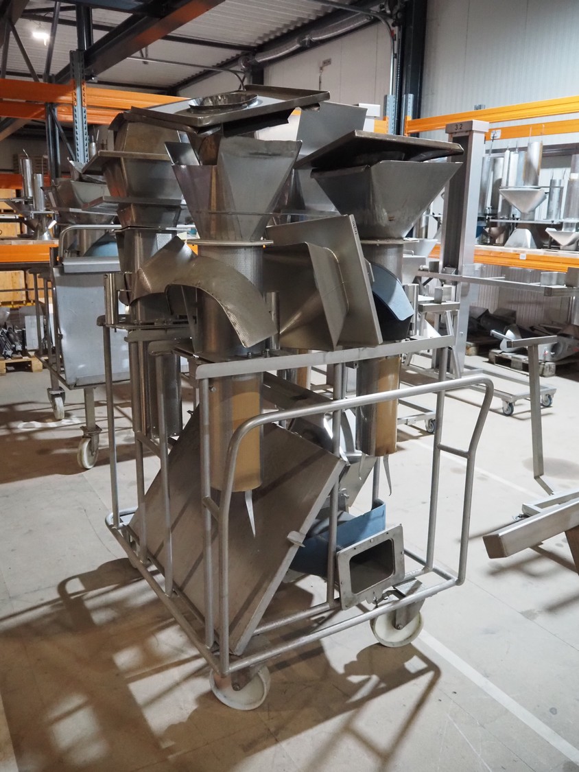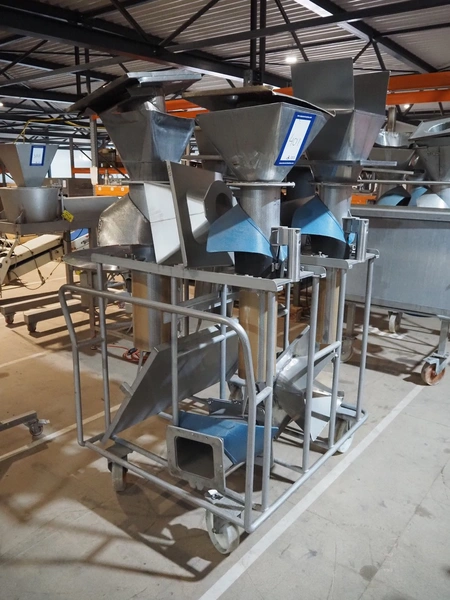 S/s trolley with 4 s/s filling pipes for GEA SX 400 vertical bag form, fill, and sealing machine, pipe dimensions: (2x) Ø 150 mm x 1000 mm, (1x) Ø 200 mm x 1000, (1x) 200 mm x 160 mm x 1000 mm, total dimensions: 1300 mm x 1000 mm x 1900 mm.