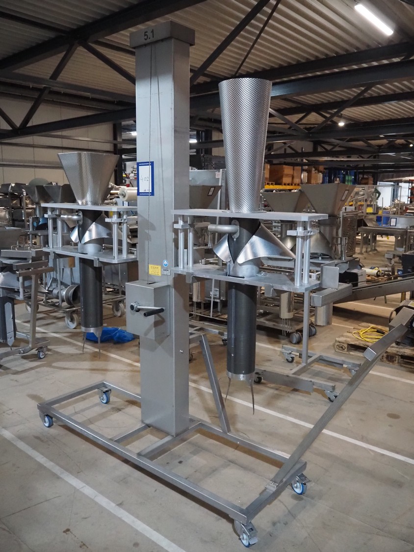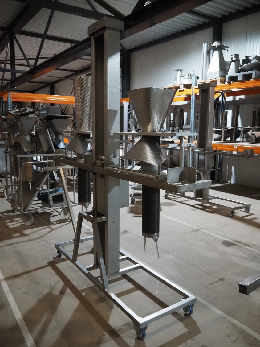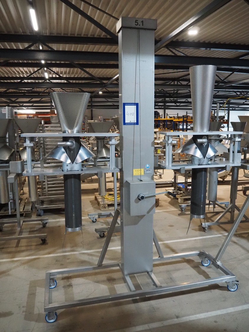 Mennens mobile lifter for filling pipes, dimensions: 2350 mm x 600 mm x 2380 mm. Including 2 filling pipes, clearance pipes: (2x) Ø 145 mm.