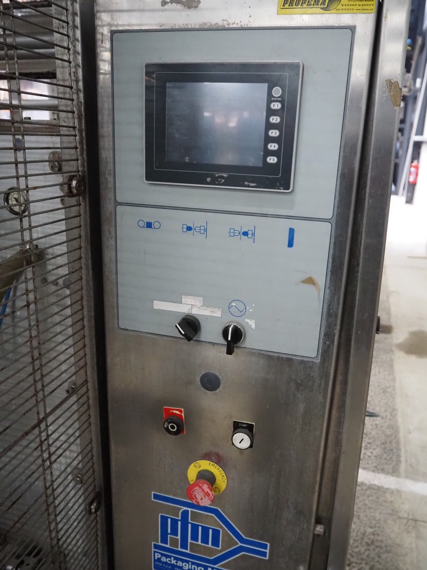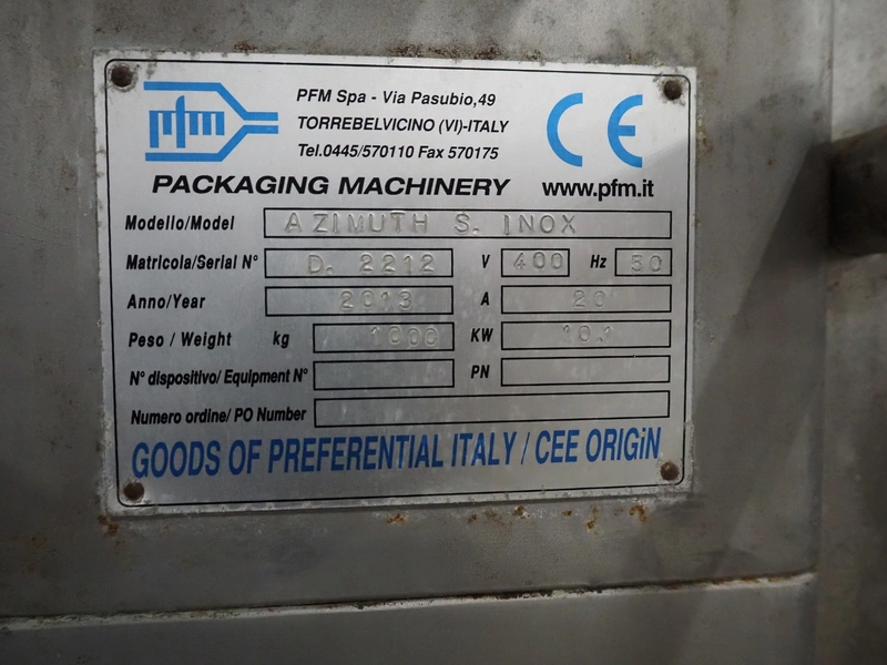 PFM packaging machinery vertical bag form-, fill-, and seal machine, model: A ZIMYTH S INOX, serial number: 2212, year of construction: 2013, 400 V, 50 Hz, 20 A, 10.1 kW, weight: 1000 kg, vertical seal length: 500 mm, horizontal seal length: 350 kg, total dimensions: 2150 mm x 1550 mm x 2140 mm. Technical condition unknown.