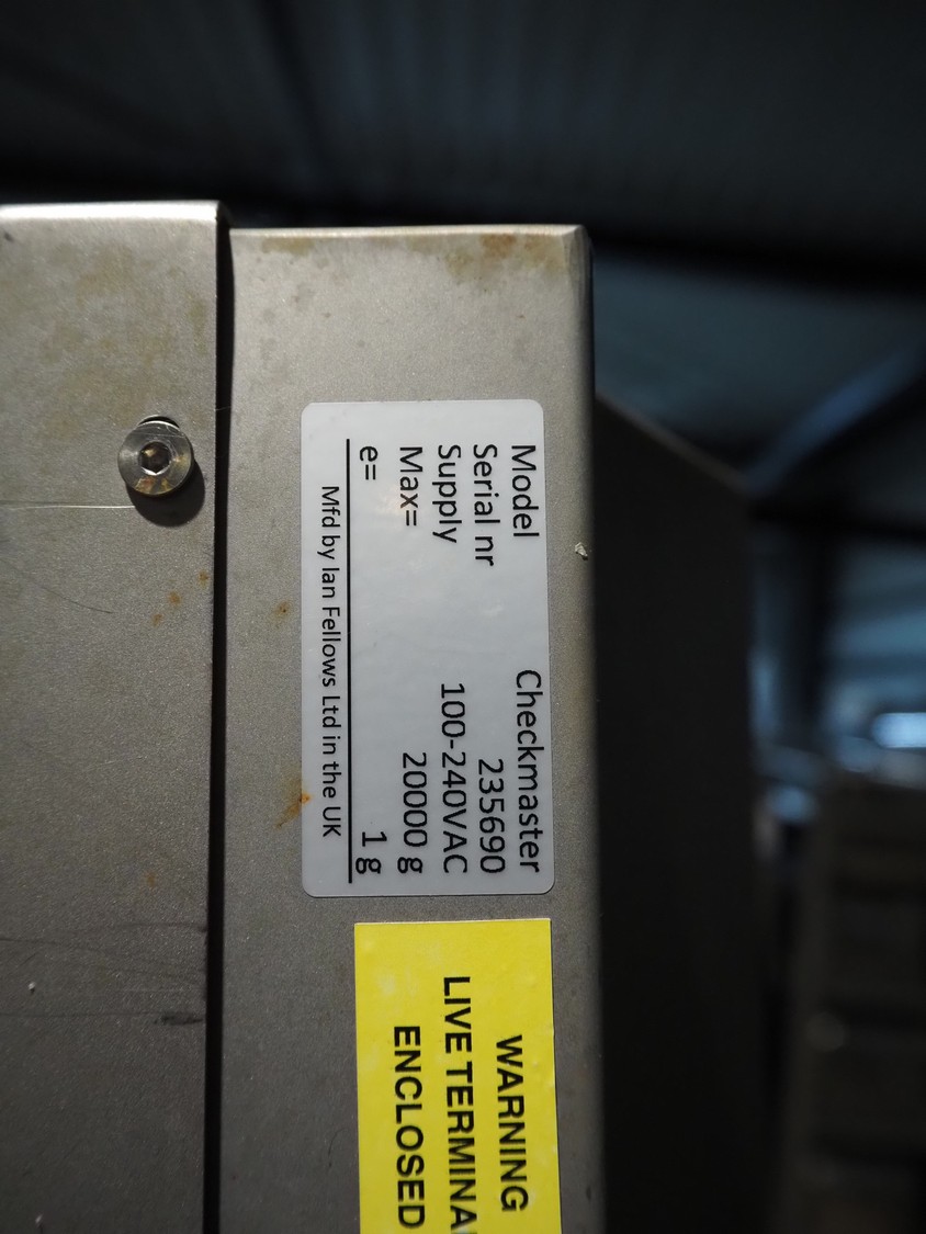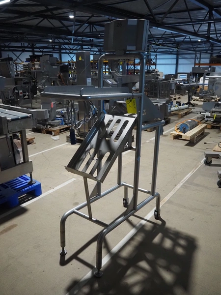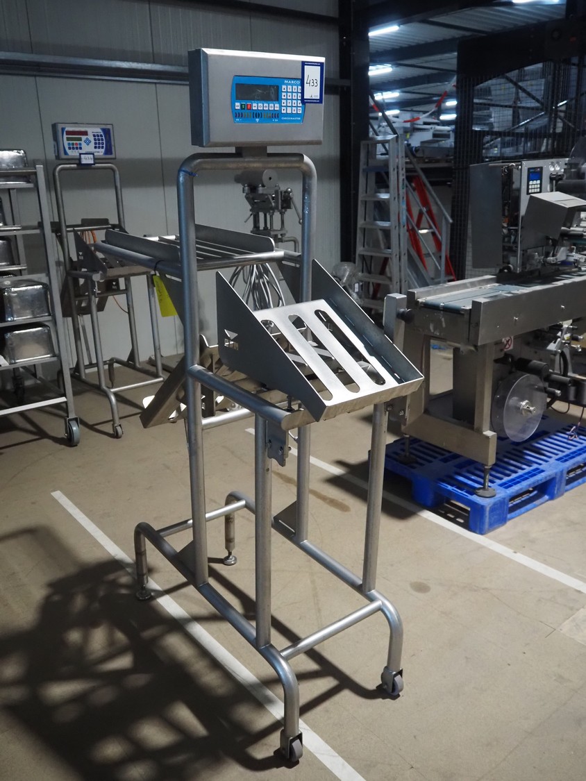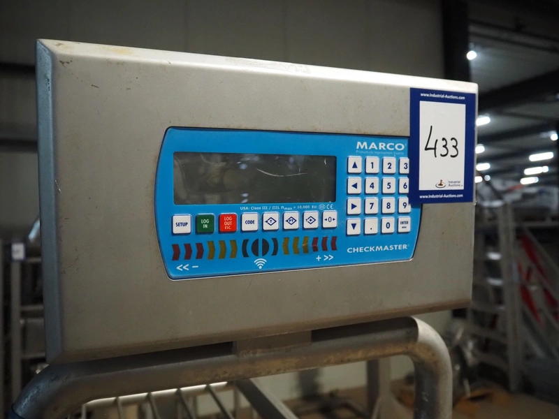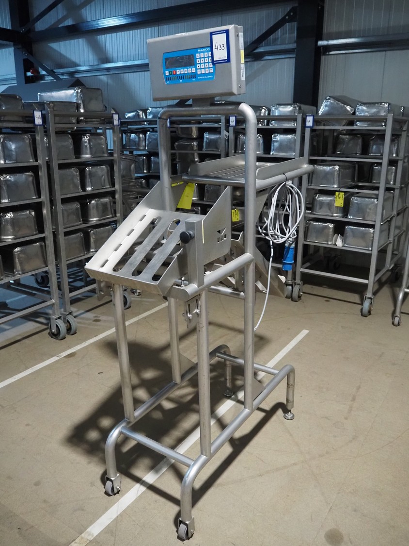 Marco weighing scale for crates on s/s frame, model: Checkmaster, serial number: 235690, 100-240 VAC, maximum weight: 20000 gram, e= 1 gram, clearance: 500 mm x 320 mm, total dimensions: 1130 mm x 460 mm x 1860 mm.