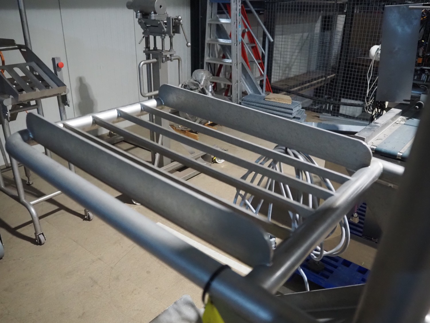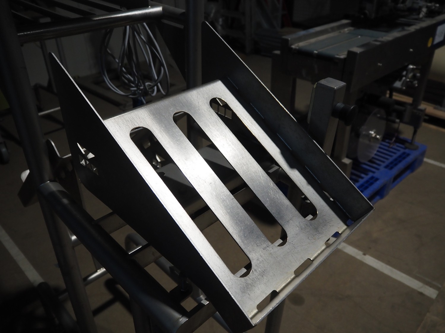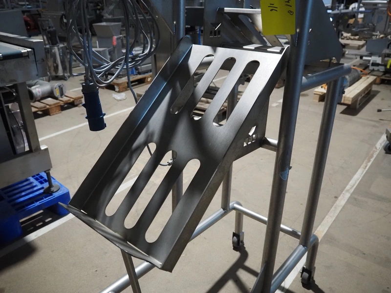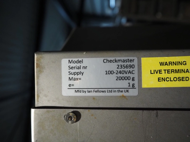 Marco weighing scale for crates on s/s frame, model: Checkmaster, serial number: 235690, 100-240 VAC, maximum weight: 20000 gram, e= 1 gram, clearance: 500 mm x 320 mm, total dimensions: 1130 mm x 460 mm x 1860 mm.