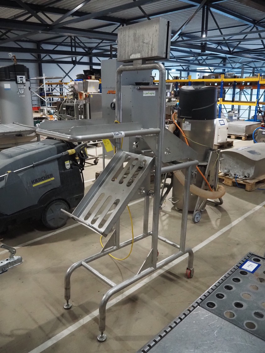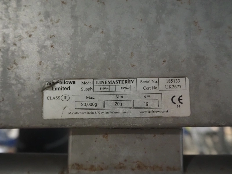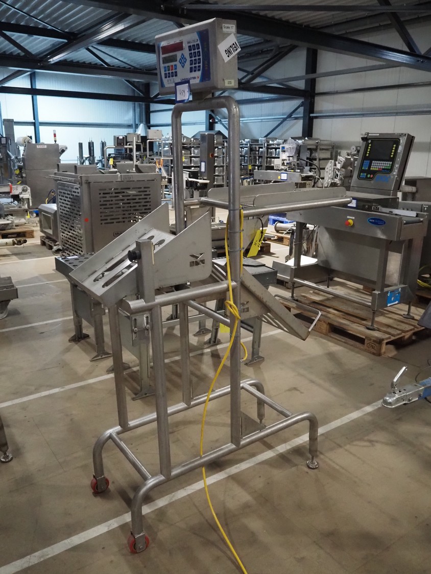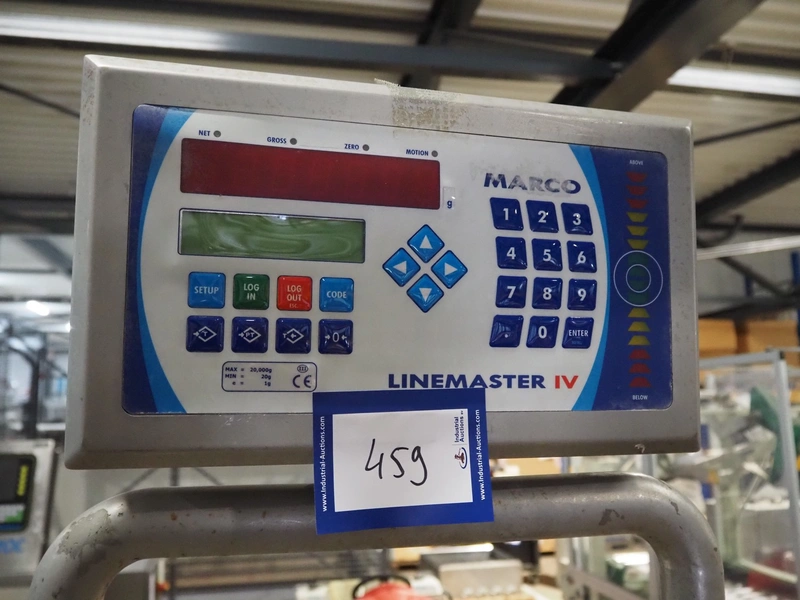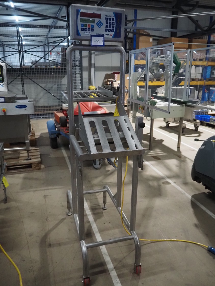 Marco weighing scale for crates on s/s frame, model: LINEMASTER IV, serial number: 185133, 100-240 VAC, maximum weight: 20000 gram, minimum weight: 20 gram, e= 1 gram, clearance: 500 mm x 320 mm, total dimensions: 1130 mm x 460 mm x 1960 mm.