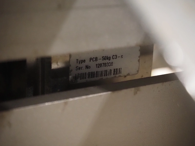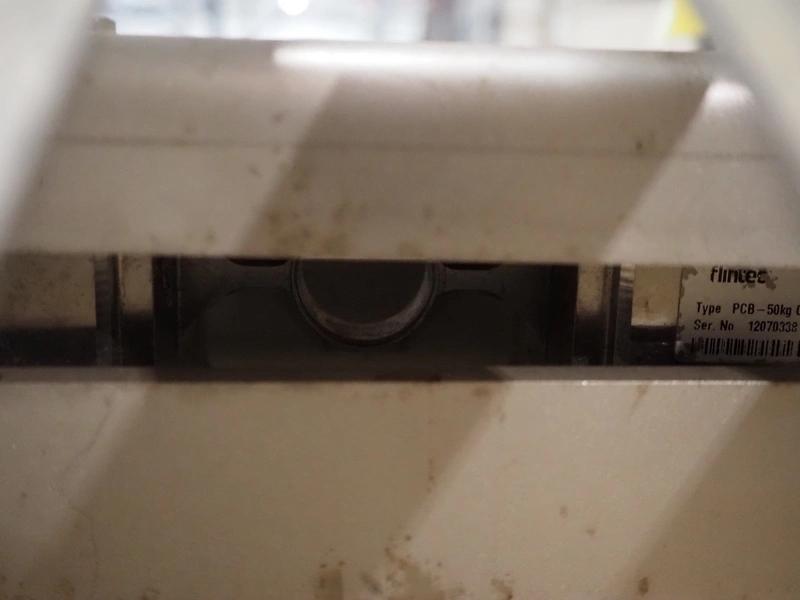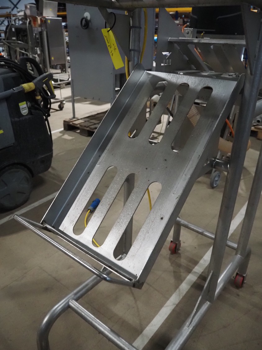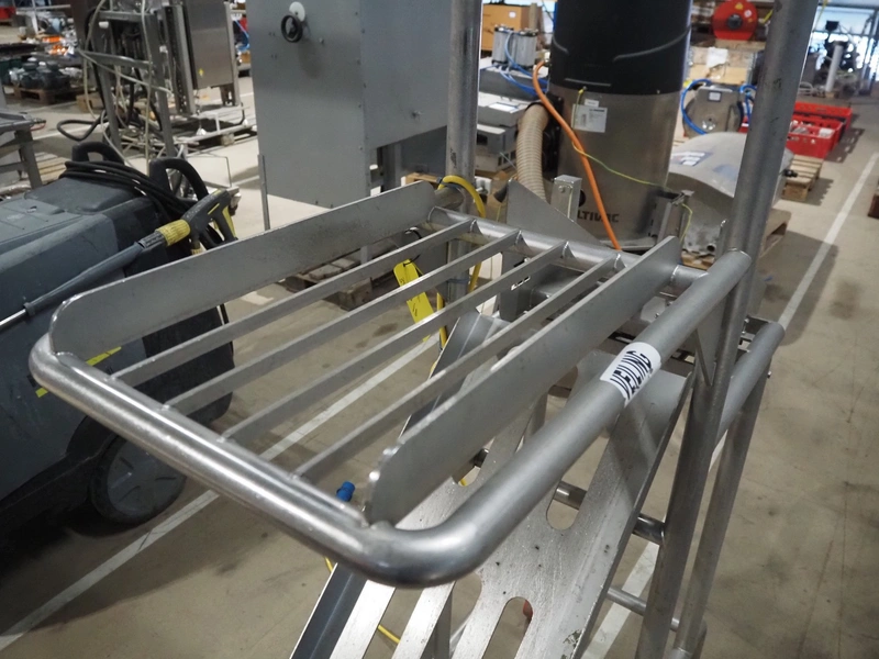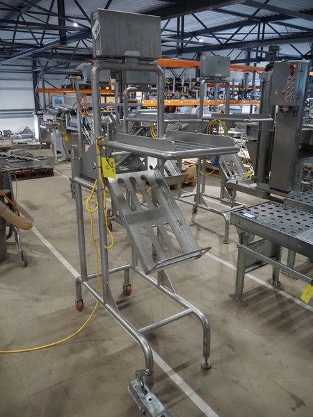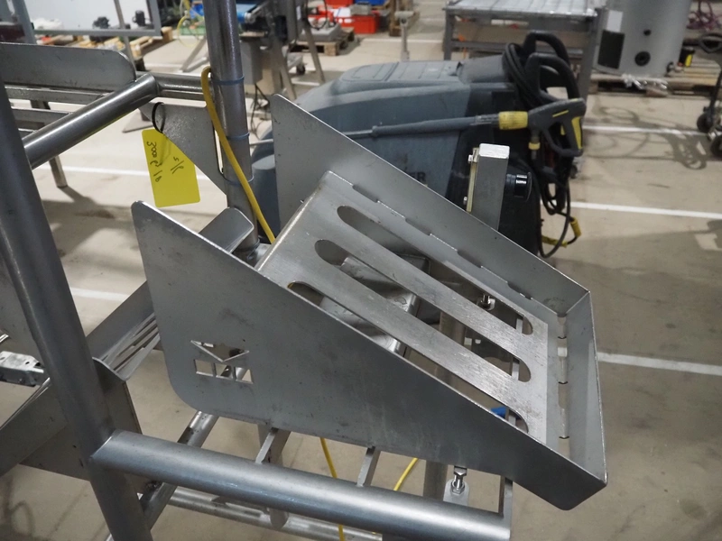 Marco weighing scale for crates on s/s frame, model: LINEMASTER IV, serial number: 185133, 100-240 VAC, maximum weight: 20000 gram, minimum weight: 20 gram, e= 1 gram, clearance: 500 mm x 320 mm, total dimensions: 1130 mm x 460 mm x 1960 mm.