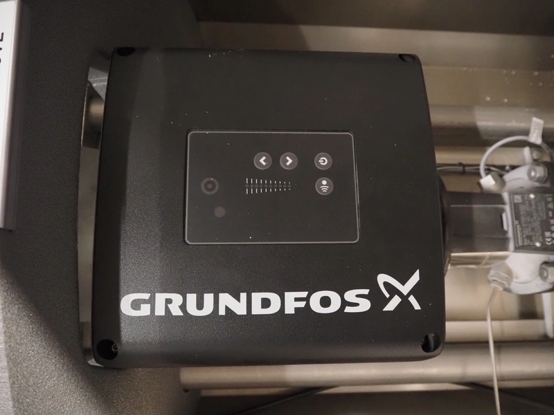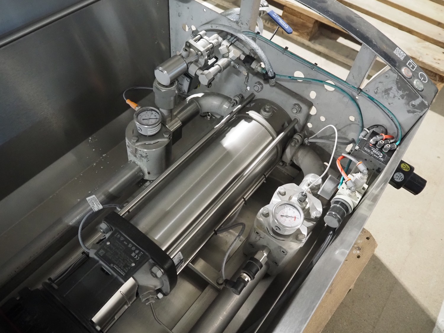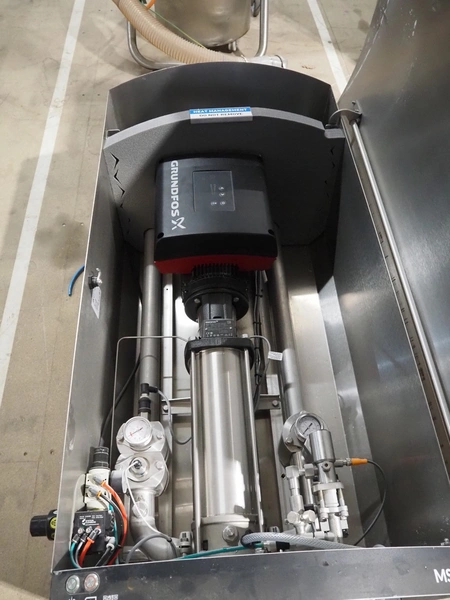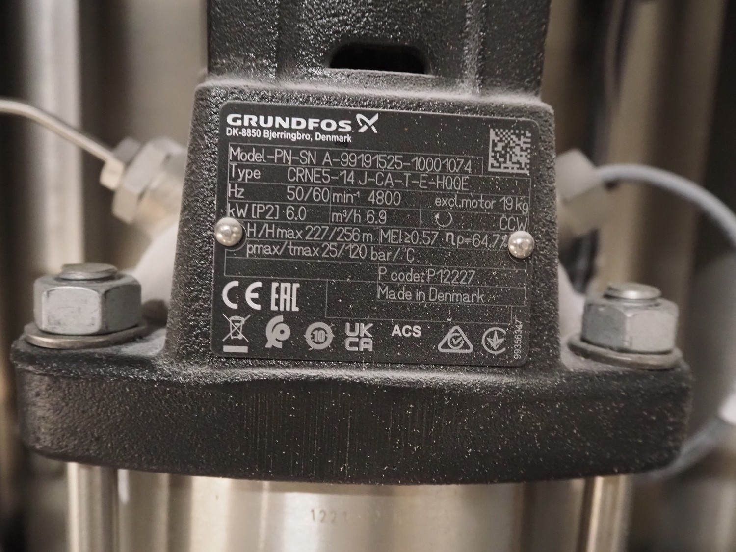 Grundfos circulation pump in s/s cabinet, type: CRNE5-14 J-CA-T-E-HQQE, serial number: 10001074, capacity: 6.9 m³ per hour.