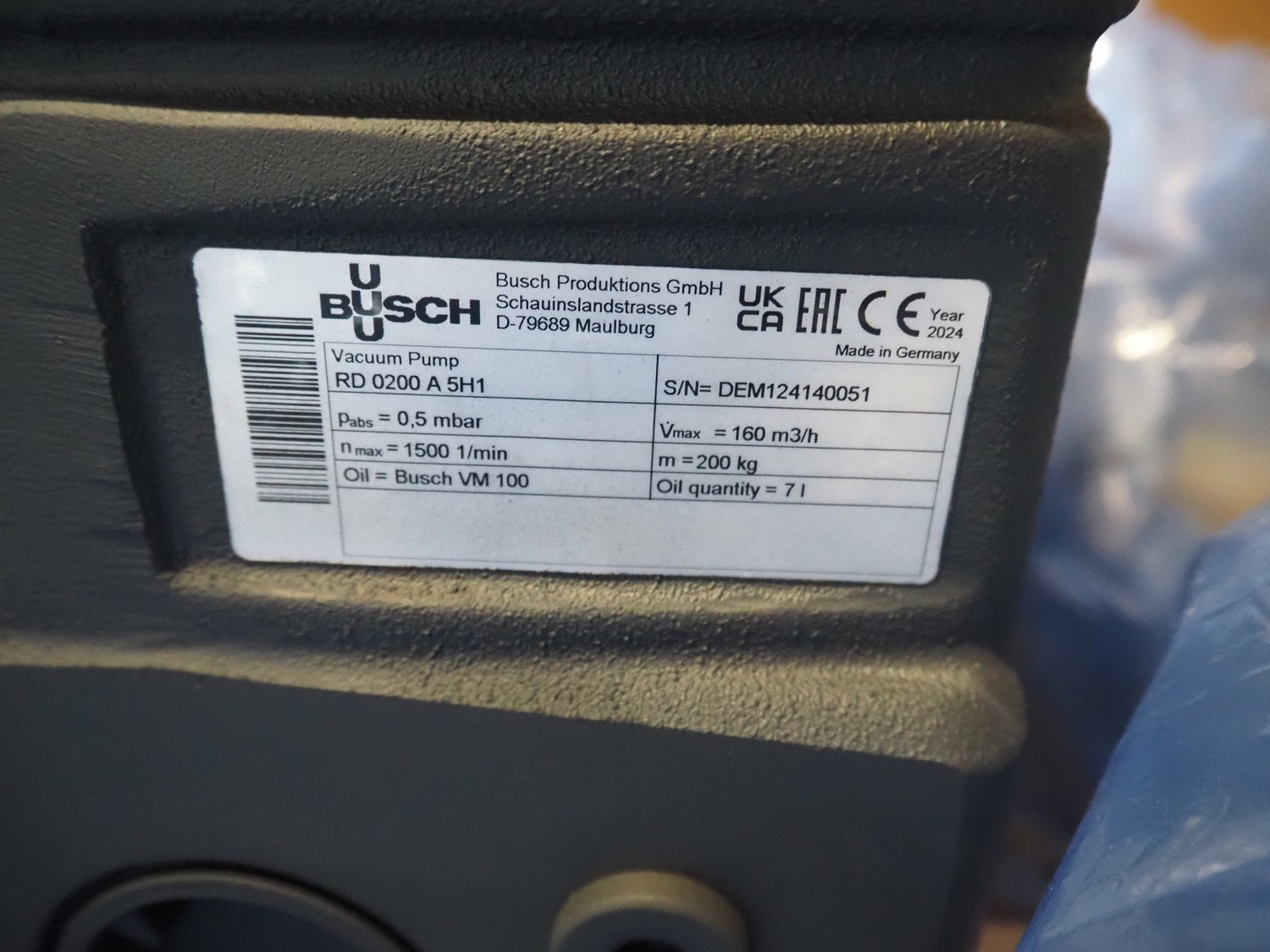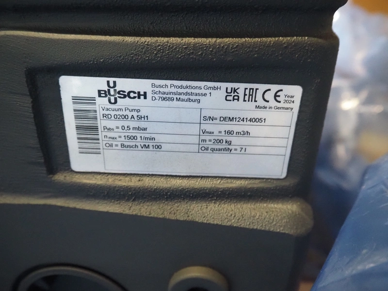 Busch vacuum pump, type: RD 0200 A 5H1, serial number: DEM124140051, year of construction: 2024, capacity: 160 m³ per hour, dimensions: 800 mm x 600 mm x 430 mm.