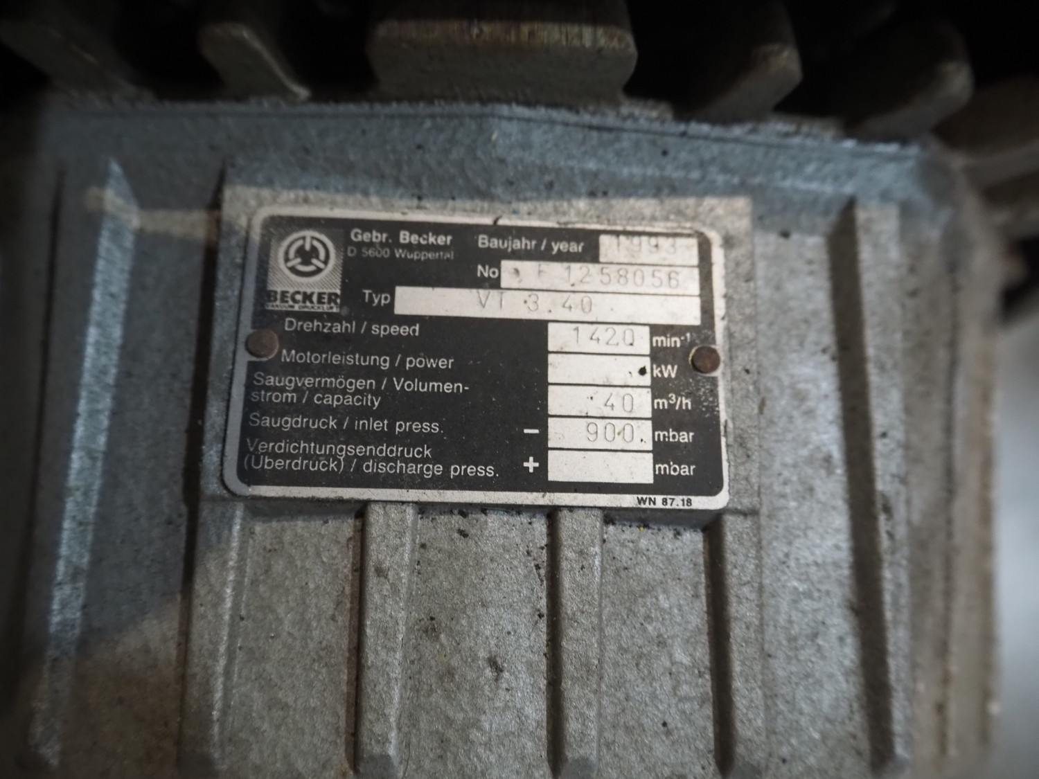 Becker vacuum pump, type: VT 3.40, number: F 1258056, year of construction: 2013, capacity: 40 m³ per hour, dimensions: 500 mm x 230 mm x 360 mm.