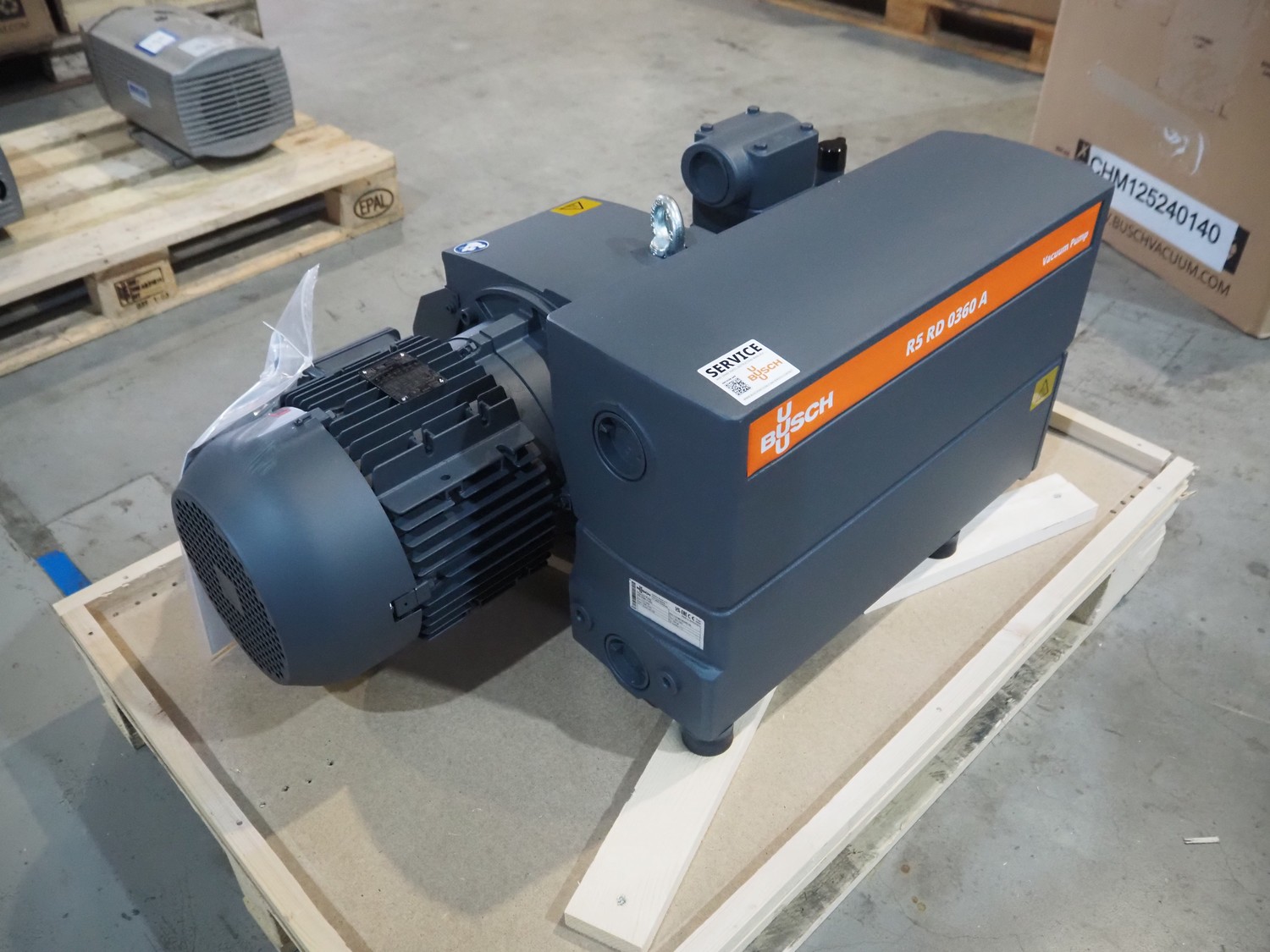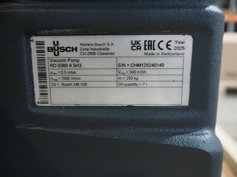 Busch vacuum pump, type: RD 0360 A 5H3, serial number: CHM125240140, year of construction: 2025, capacity: 300 m³ per hour, dimensions: 910 mm x 600 mm x 420 mm.