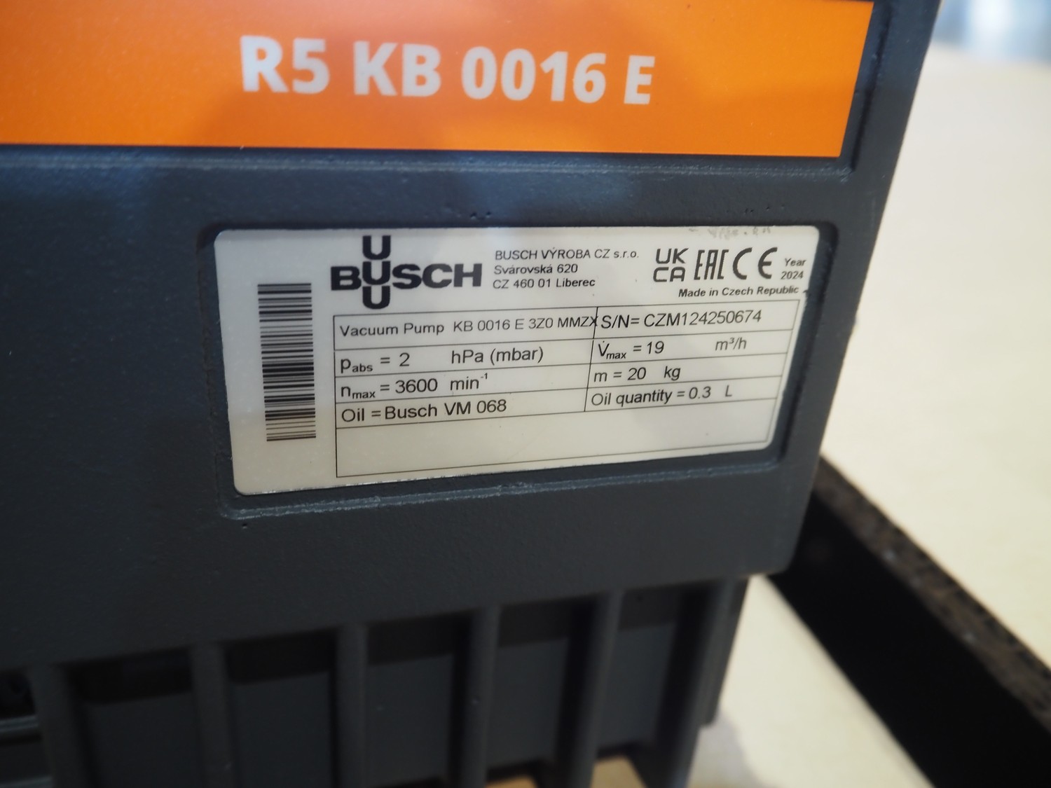Busch vacuum pump, type: KB 0016 E 3Z0 MMZX, serial number: CZM124250674, year of construction: 2024, capacity: 19 m³ per hour, dimensions: 300 mm x 200 mm x 200 mm.