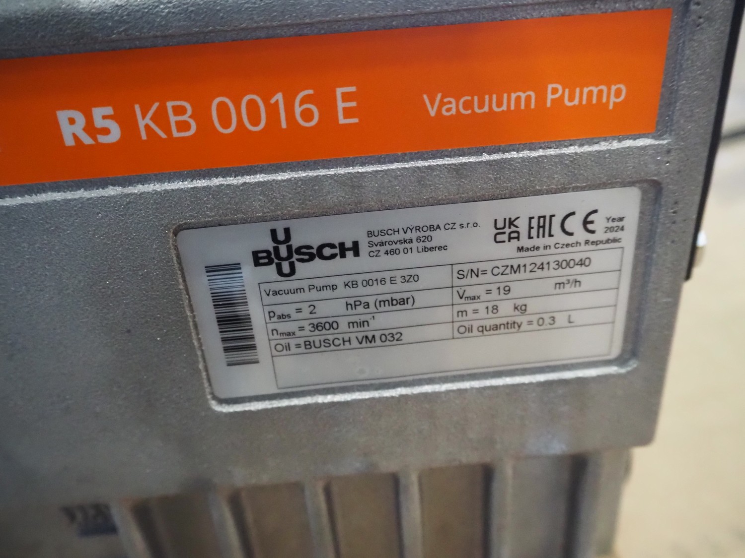 Busch vacuum pump, type: KB 0016 E 3ZO, serial number: CZM124130040, year of construction: 2024, capacity: 19 m³ per hour, dimensions: 290 mm x 220 mm x 200 mm.