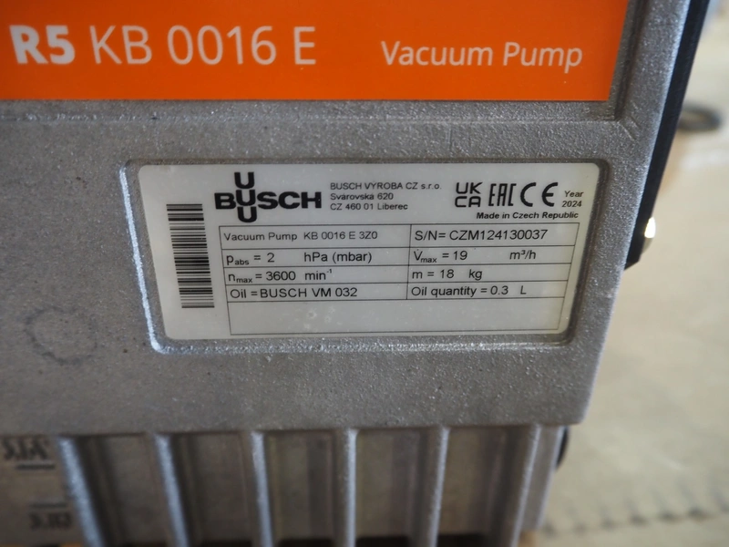 Busch vacuum pump, type: KB 0016 E 3ZO, serial number: CZM124130037, year of construction: 2024, capacity: 19 m³ per hour, dimensions: 290 mm x 220 mm x 200 mm.
